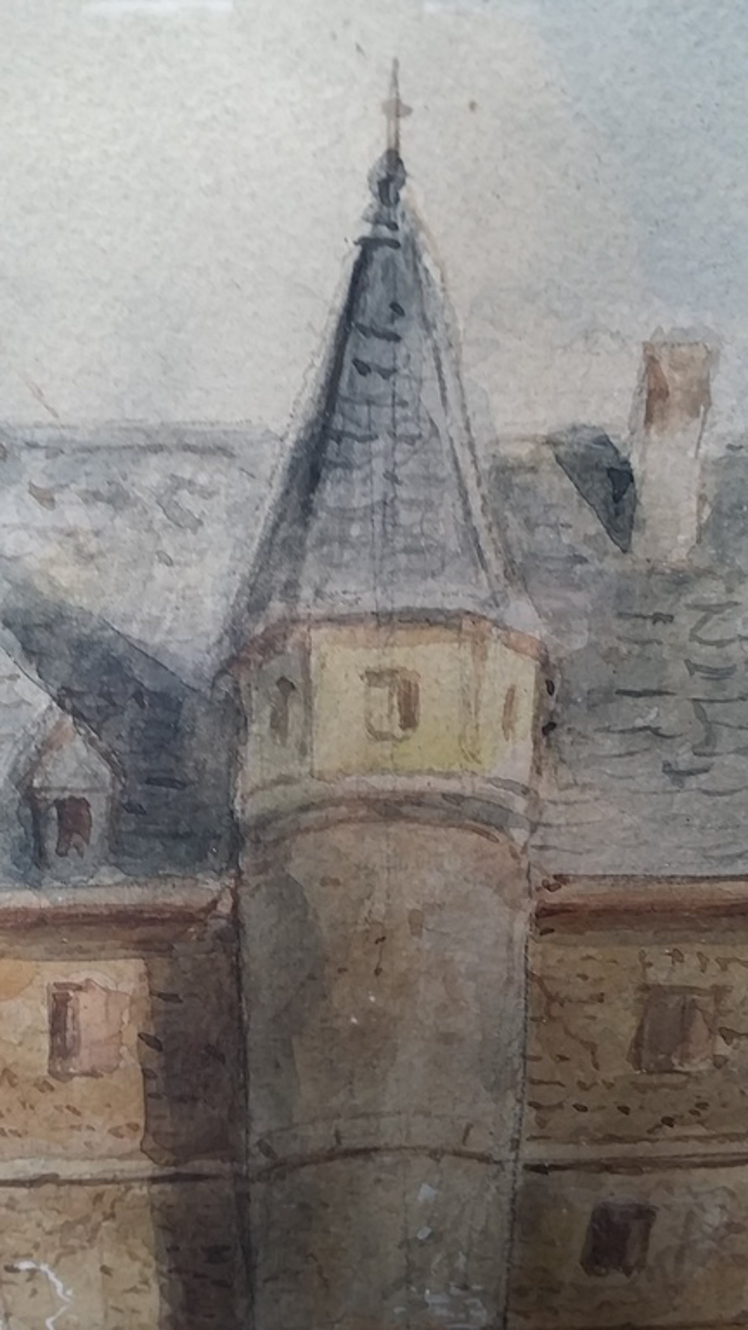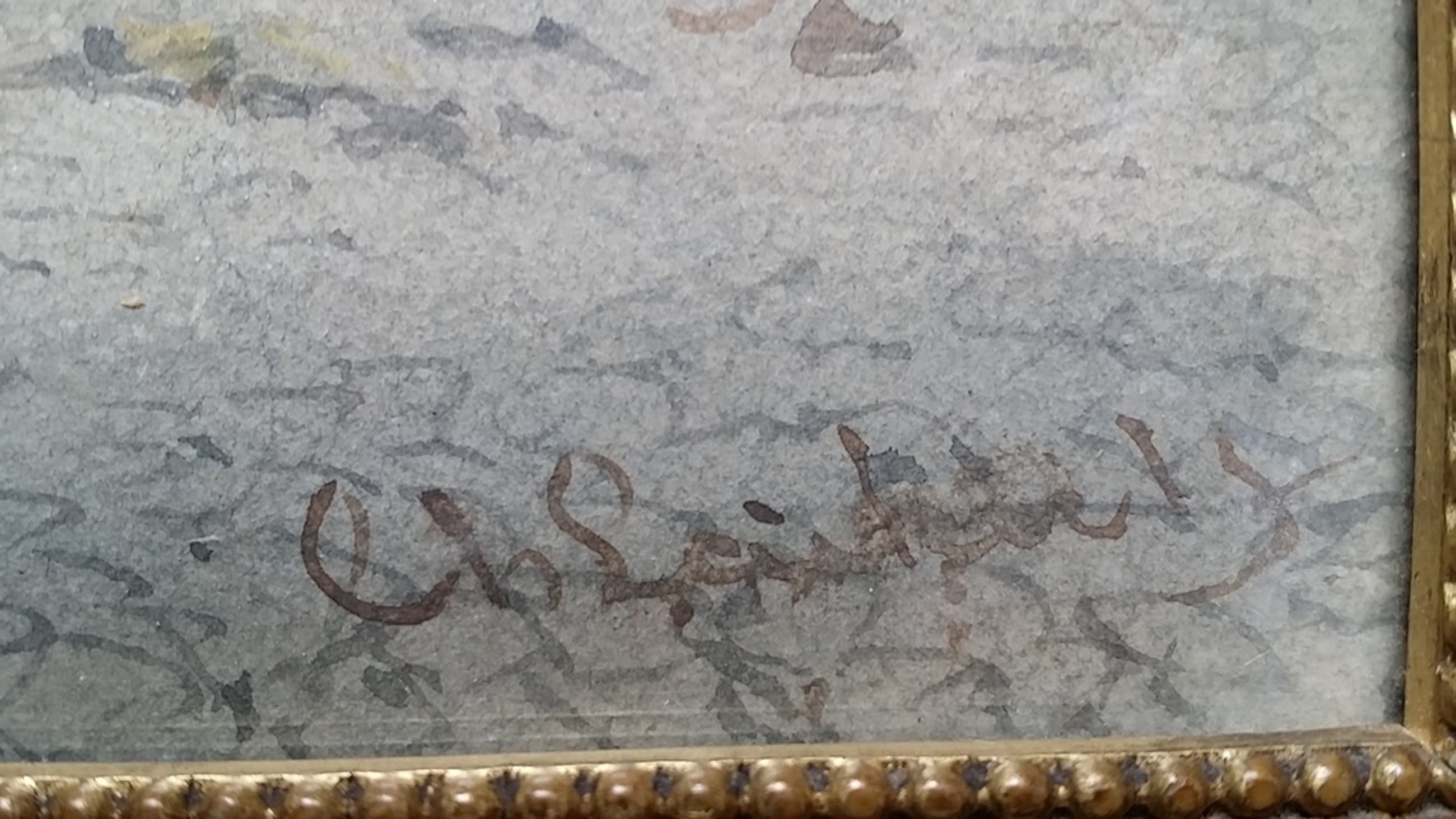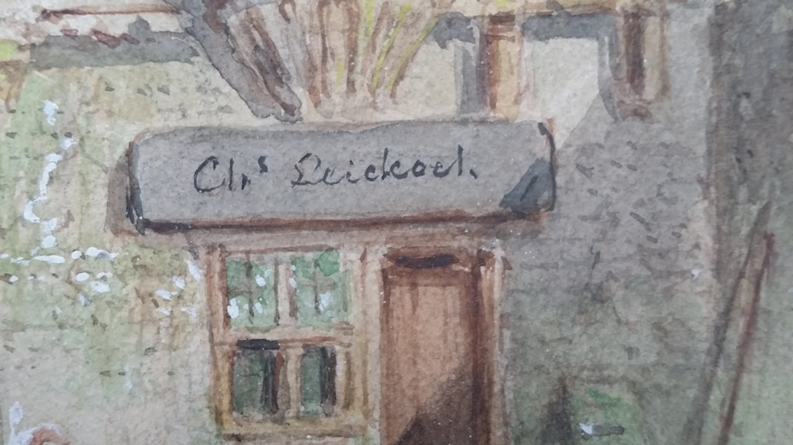 Gesigneerd rechtsonder en gesigneerd rechts midden in het aanhangbord op het huis