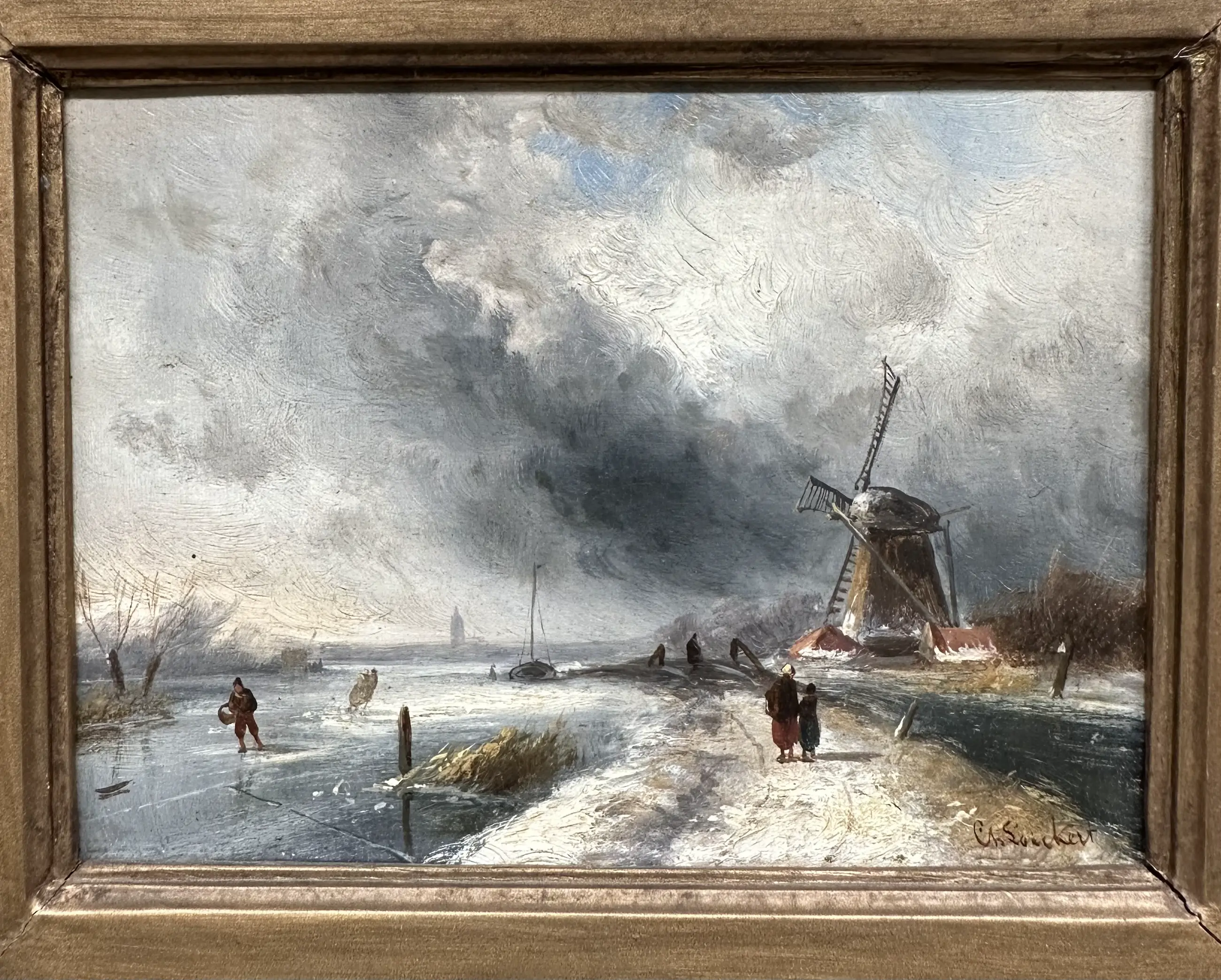 Molen in winterlandschap. Met schaatsende en wandelende mensen.