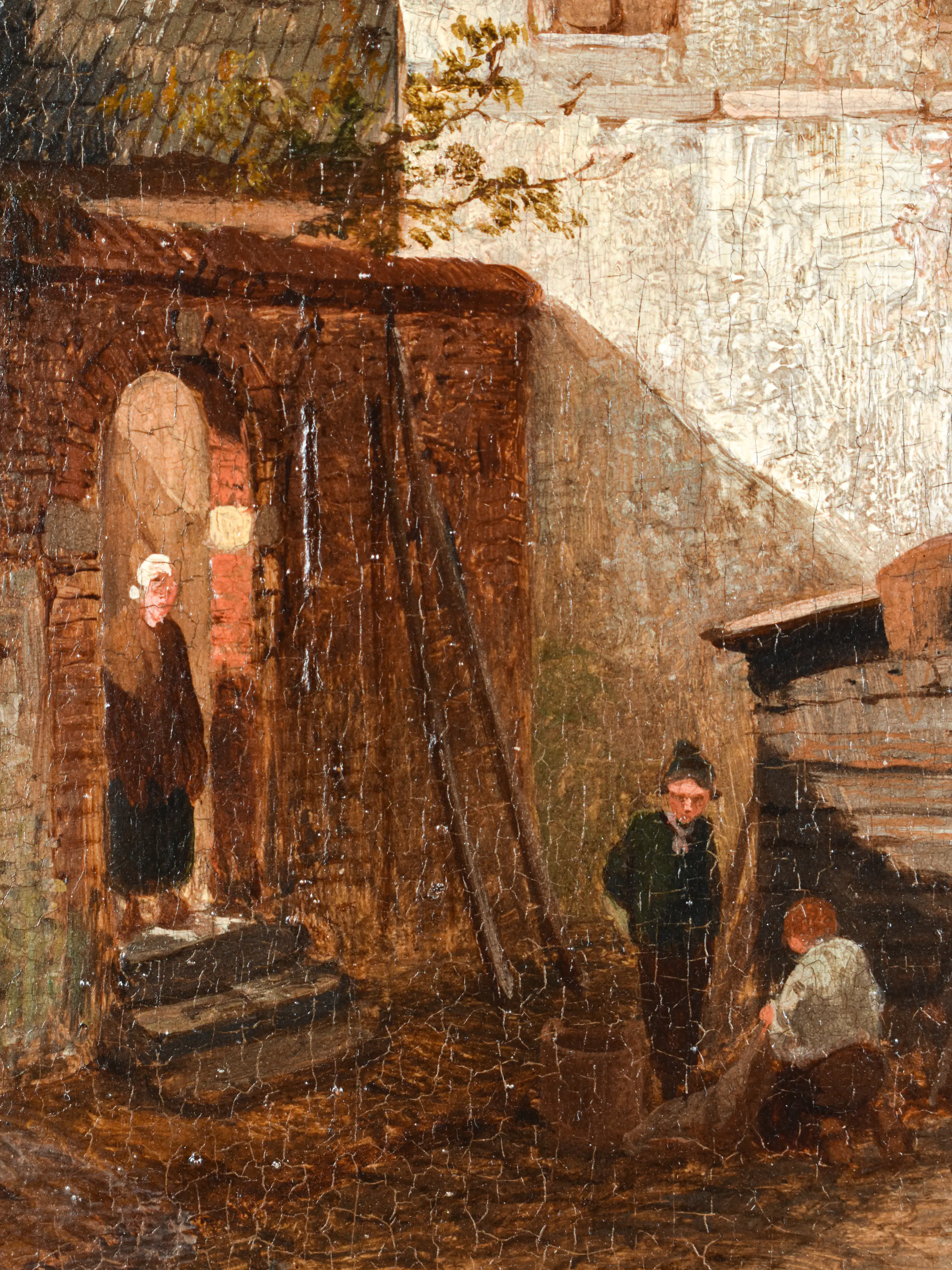 Het schilderij heeft verspreid liggende craquelé die bijpassend is voor de leeftijd van het schilderij.