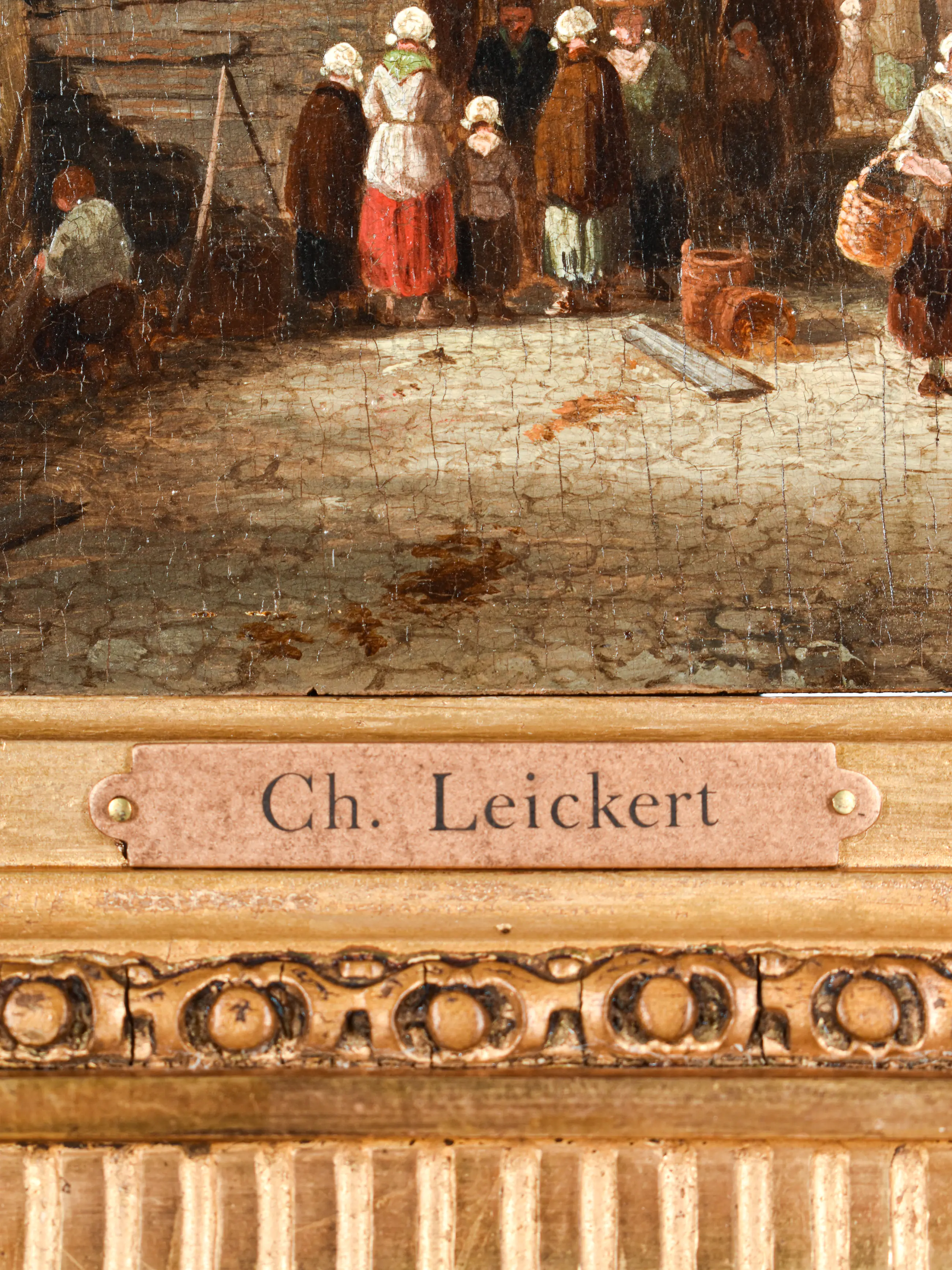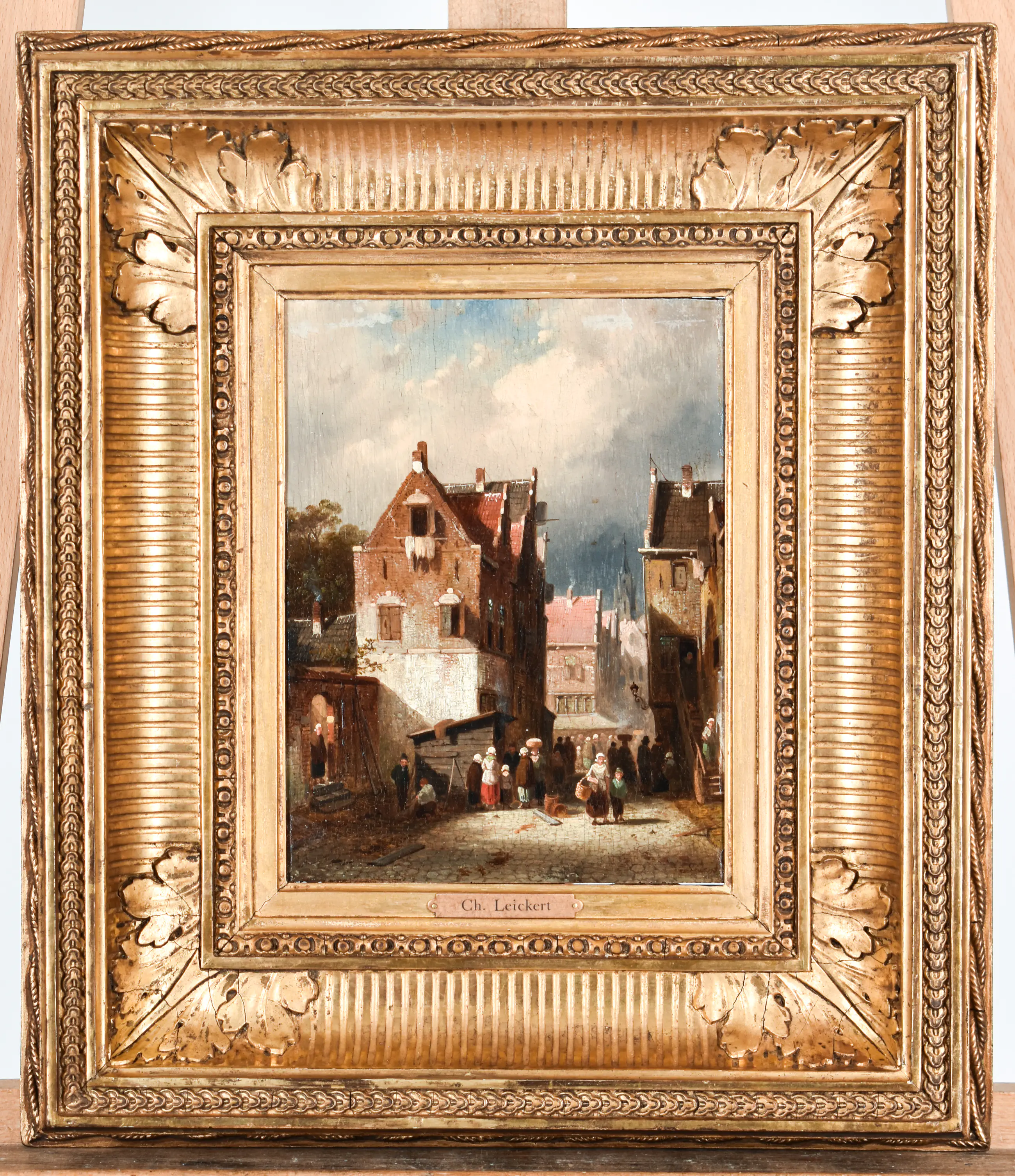 Charles Leickert (1816-1907) was korte tijd leerling van W.J.J. Nuijen en vanaf 1839 van Andries Schelfhout. Vooral deze laatste had veel invloed op zijn werk. Hij schilderde prachtige Hollandse ijsgezichten, zomerse landschappen en riviergezichten, waarin hij allerlei motieven verwerkte uit zijn schetsboeken. Na 1859 schilderde hij daarnaast ook strandtaferelen en stadsgezichten. De aantrekkelijkheid van zijn schilderijen wordt onder andere bepaald door de prachtige lichtval en sterk verhalende details.