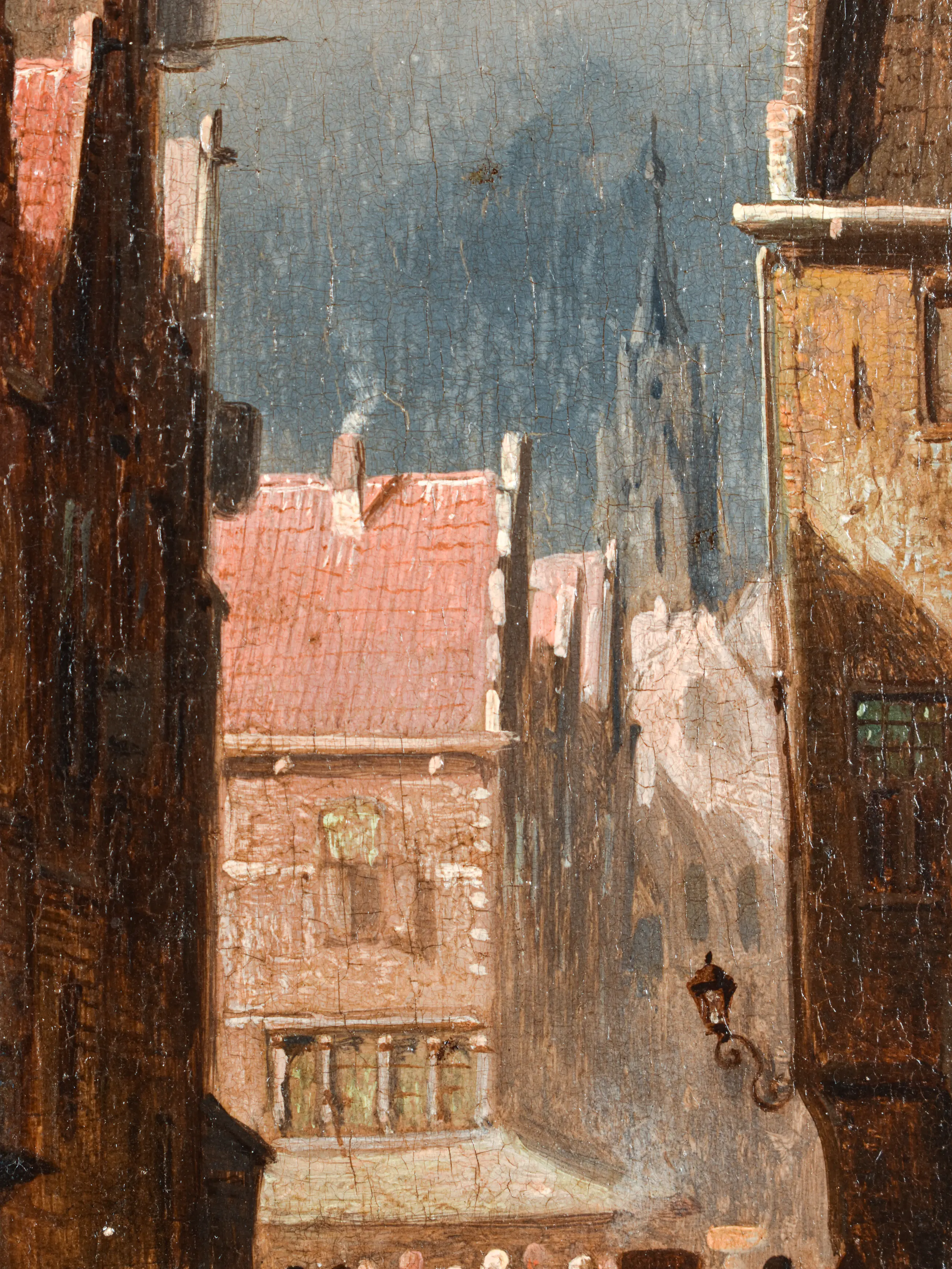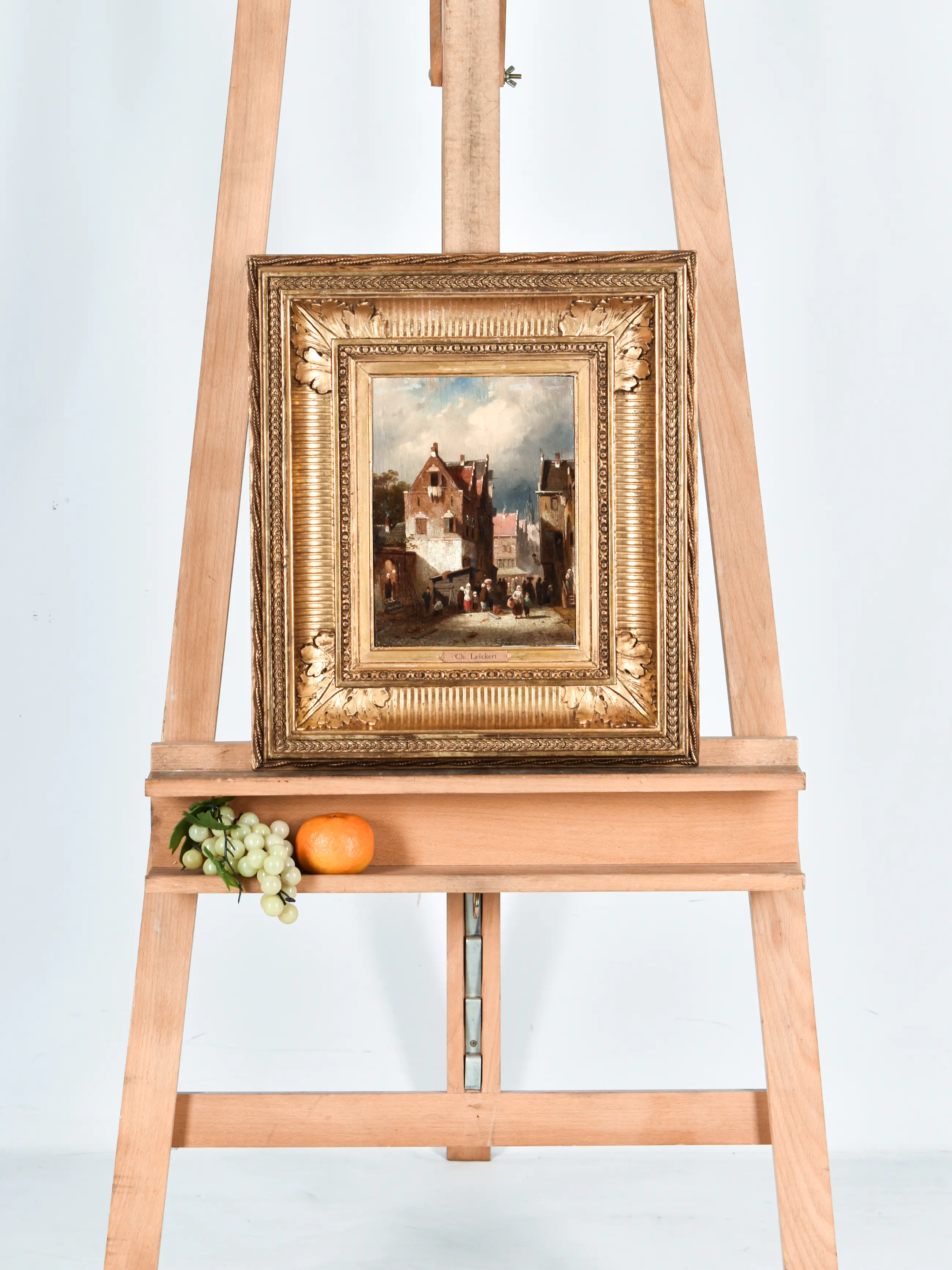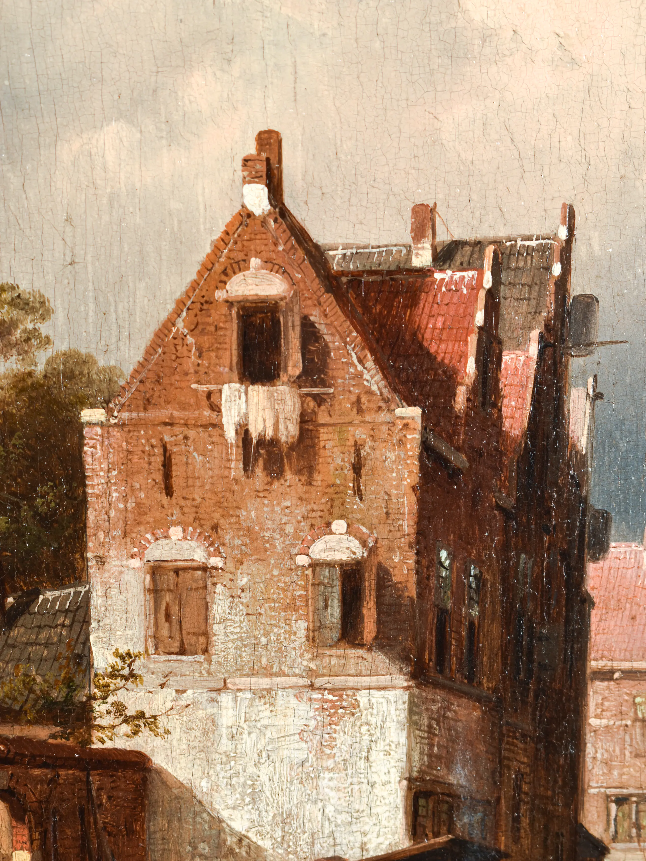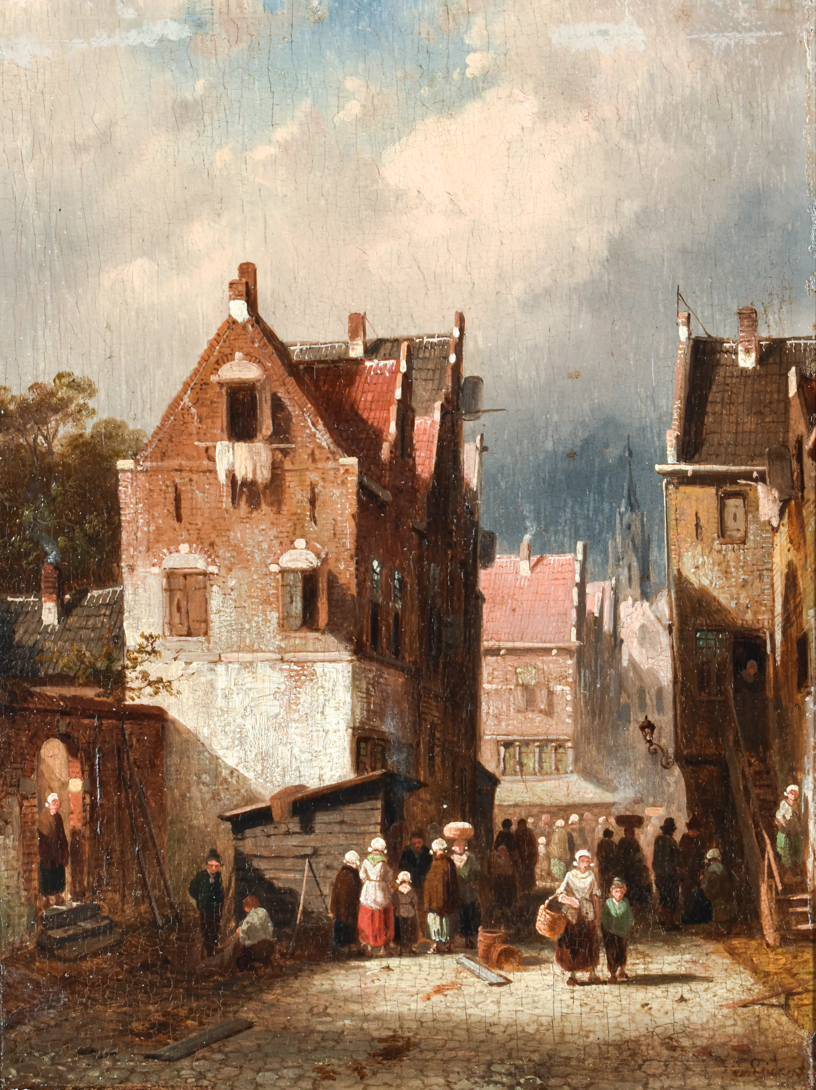 Het aangeboden schilderij toont een typisch werk uit het oeuvre van de kunstenaar, een fraai stadsgezicht in de zomer met talrijke figuren te midden van woningen met fraaie gevels.