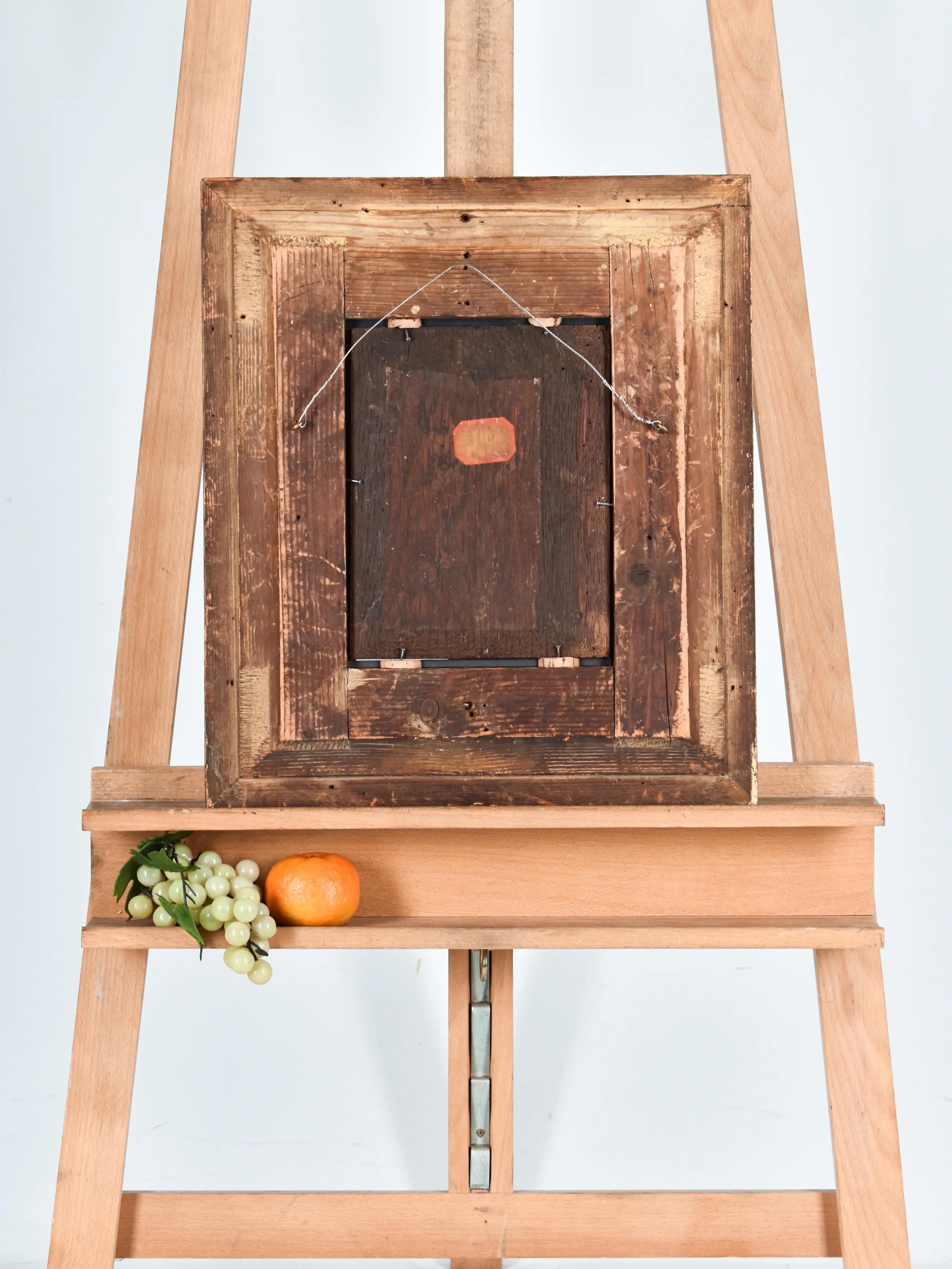 Afmetingen paneel: 22 x 17 cm. Het schilderij is ingelijst in een goudkleurige lijst met ornamenten op de hoeken.
