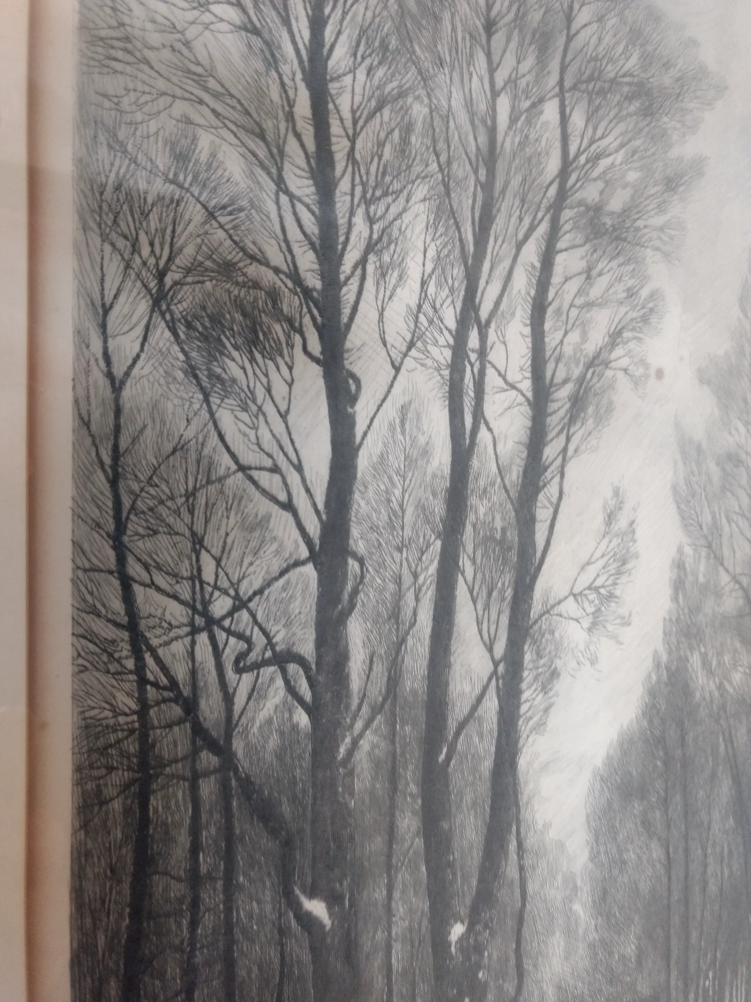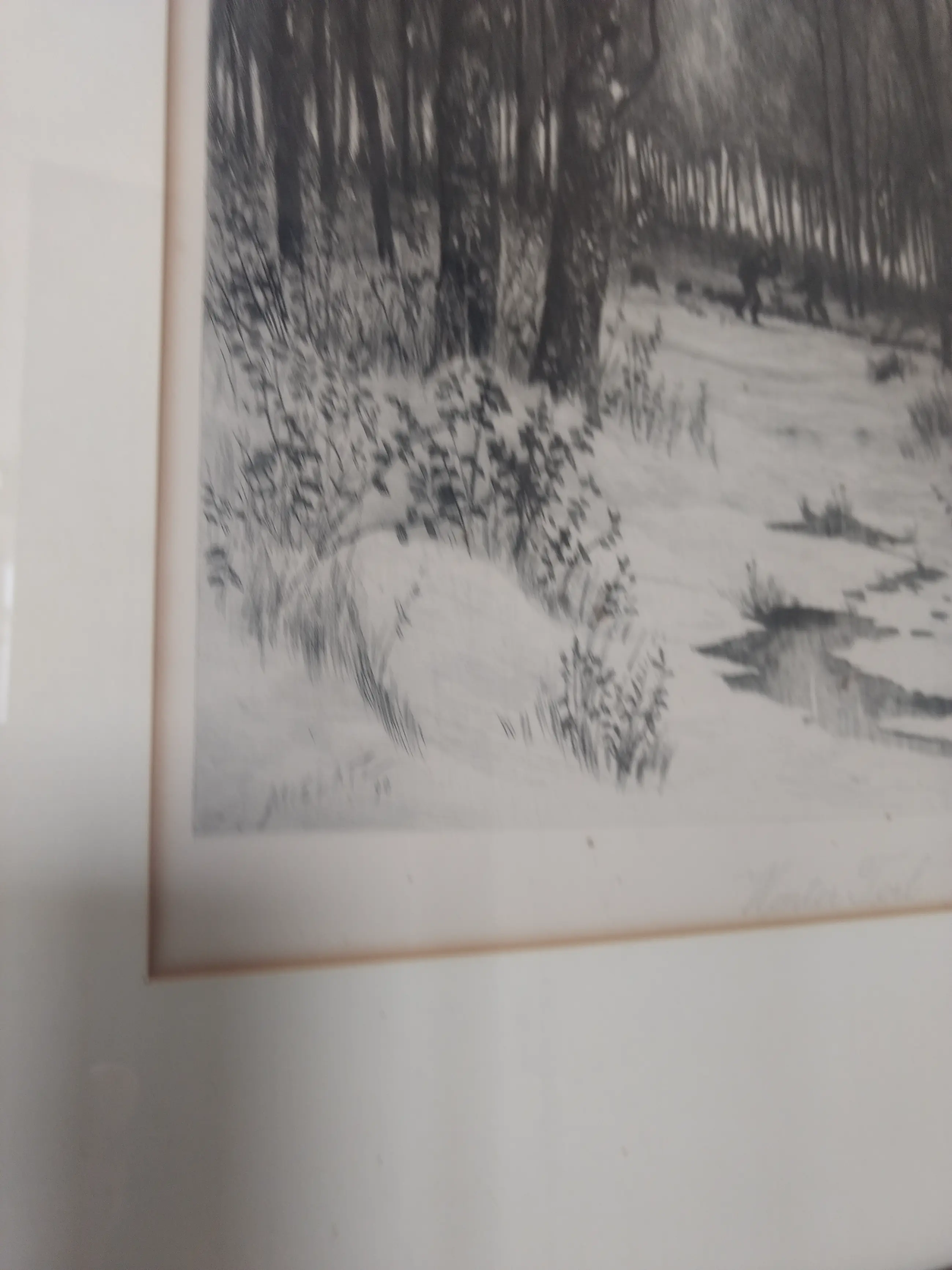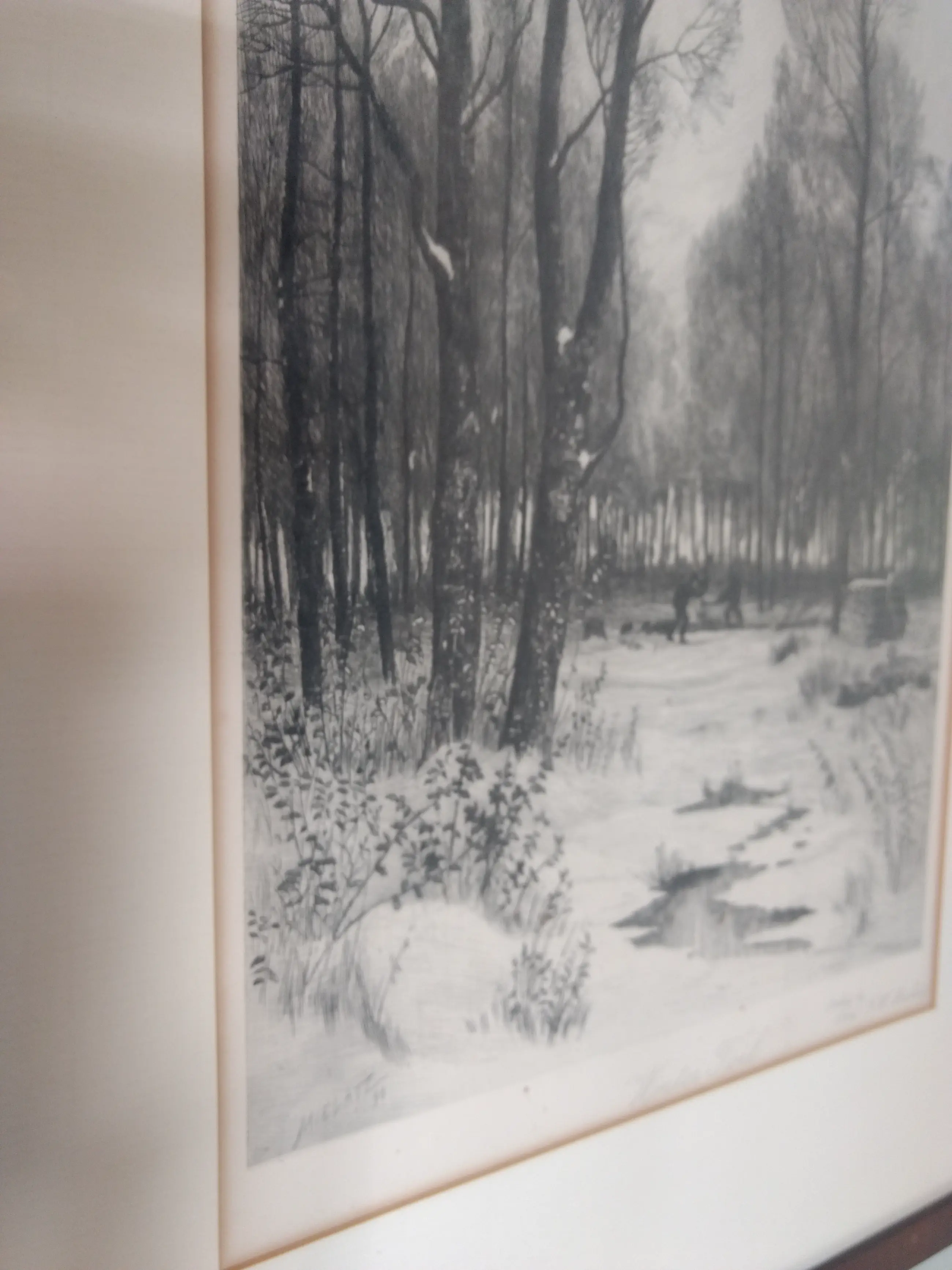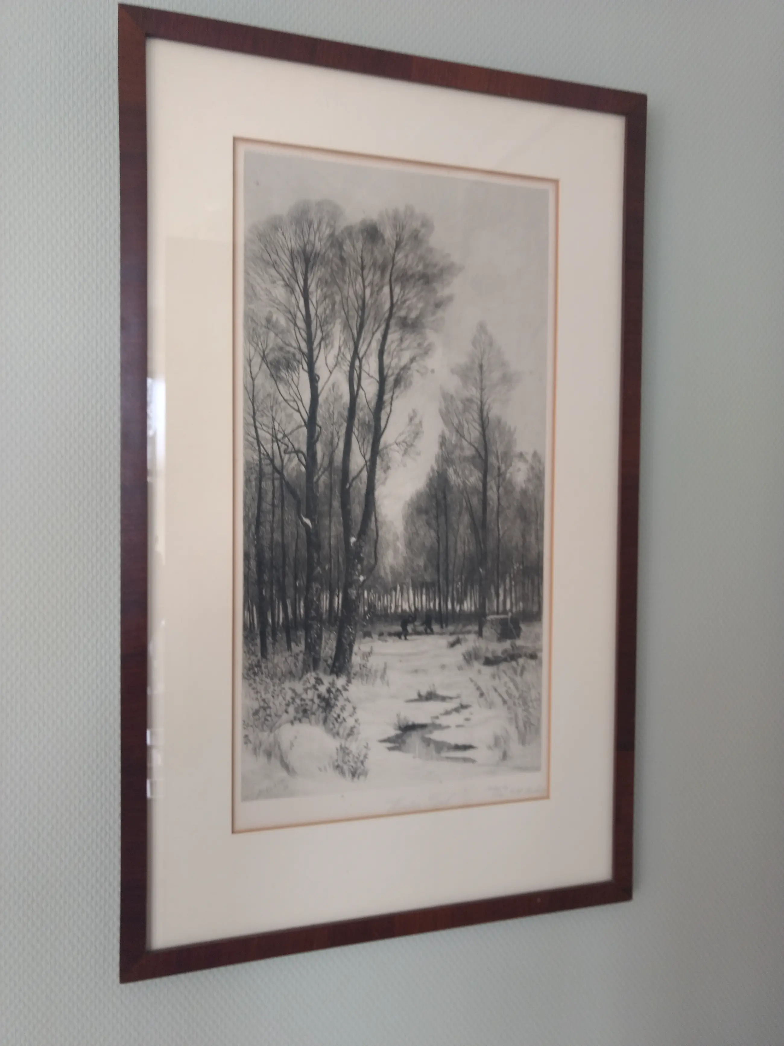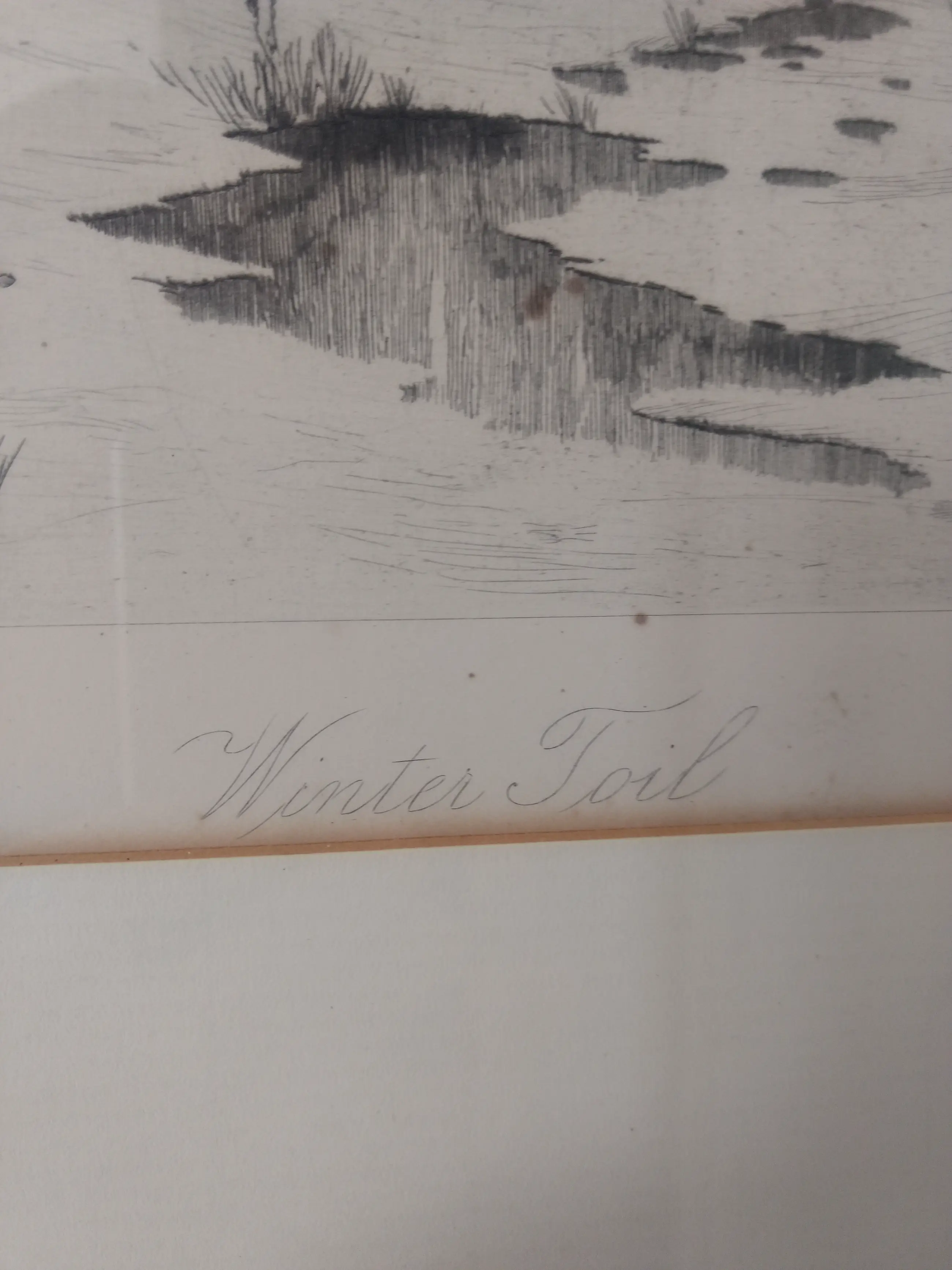 Mooie ets van Charles Mielatz. : "Winter Toil". Gesigneerd in de plaat linksonder en '90 (=1890). Afmetingen: h 53 x b 27,5 cm. Ophalen nabij Groningen.