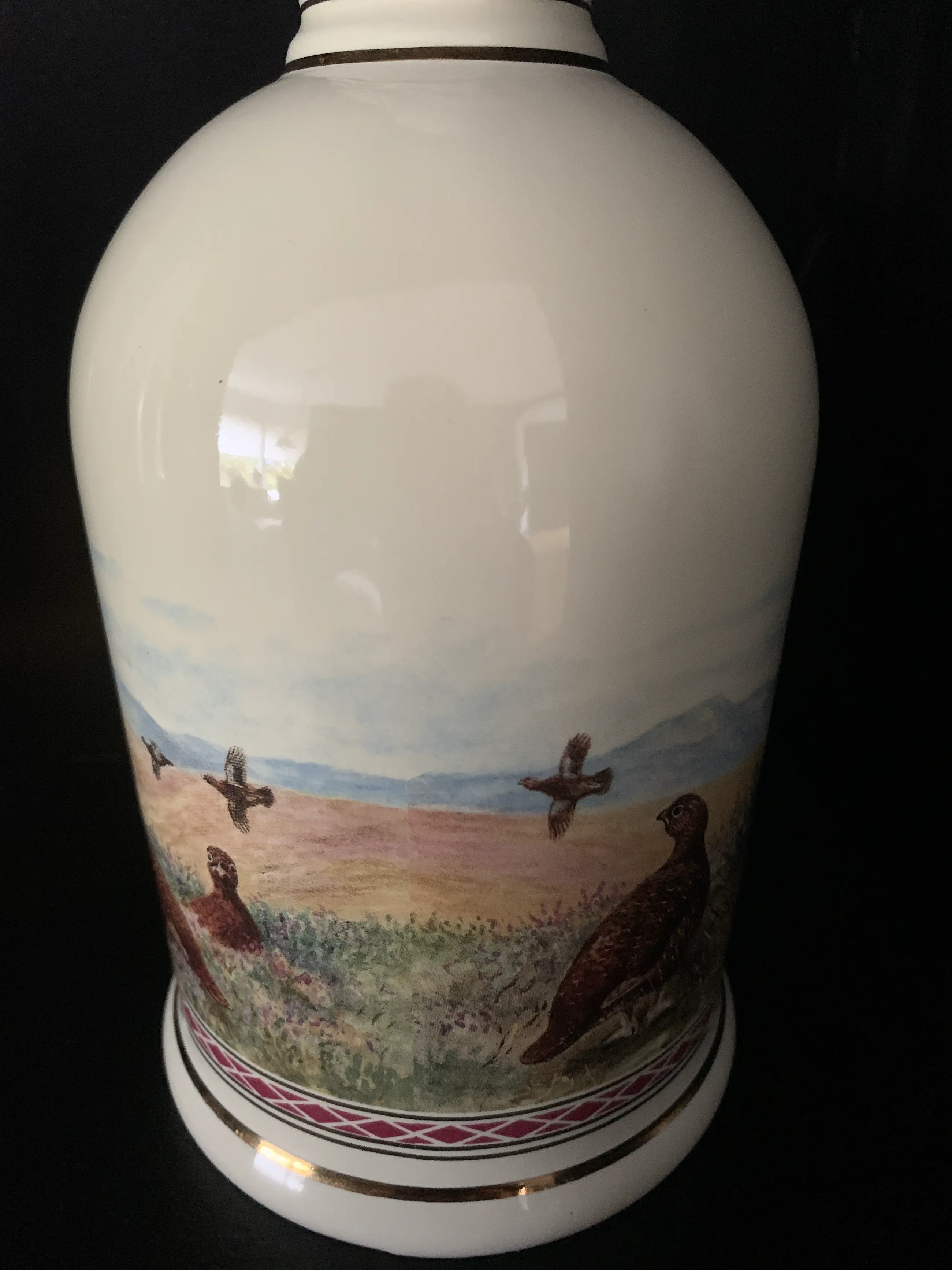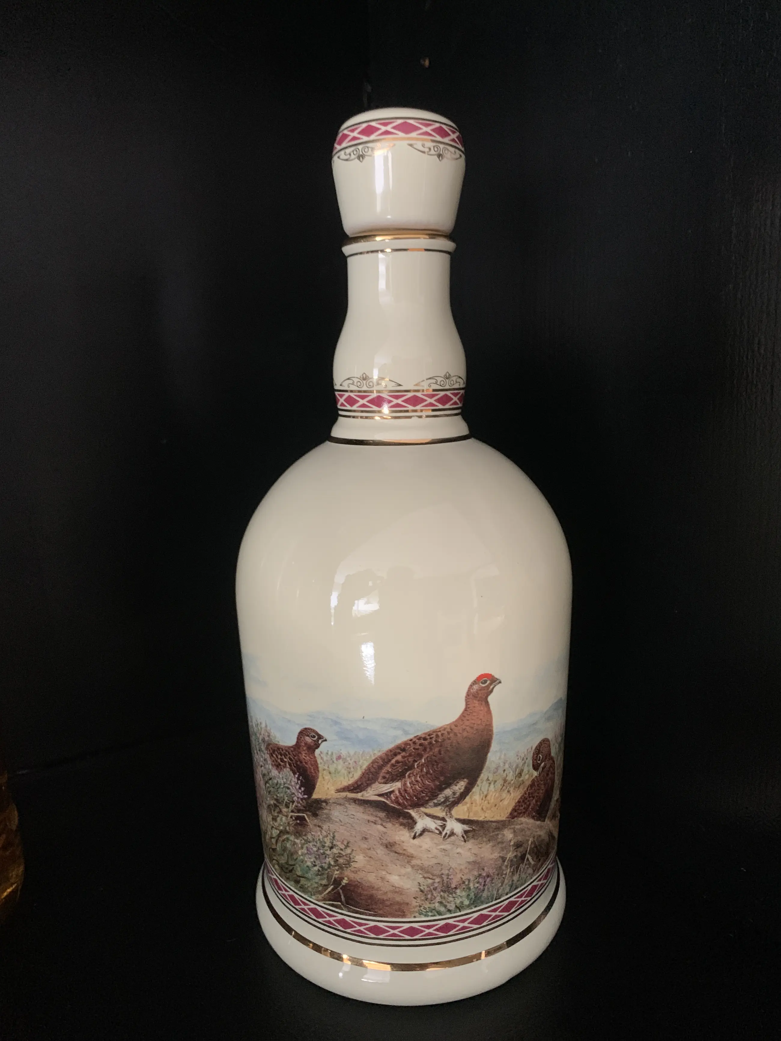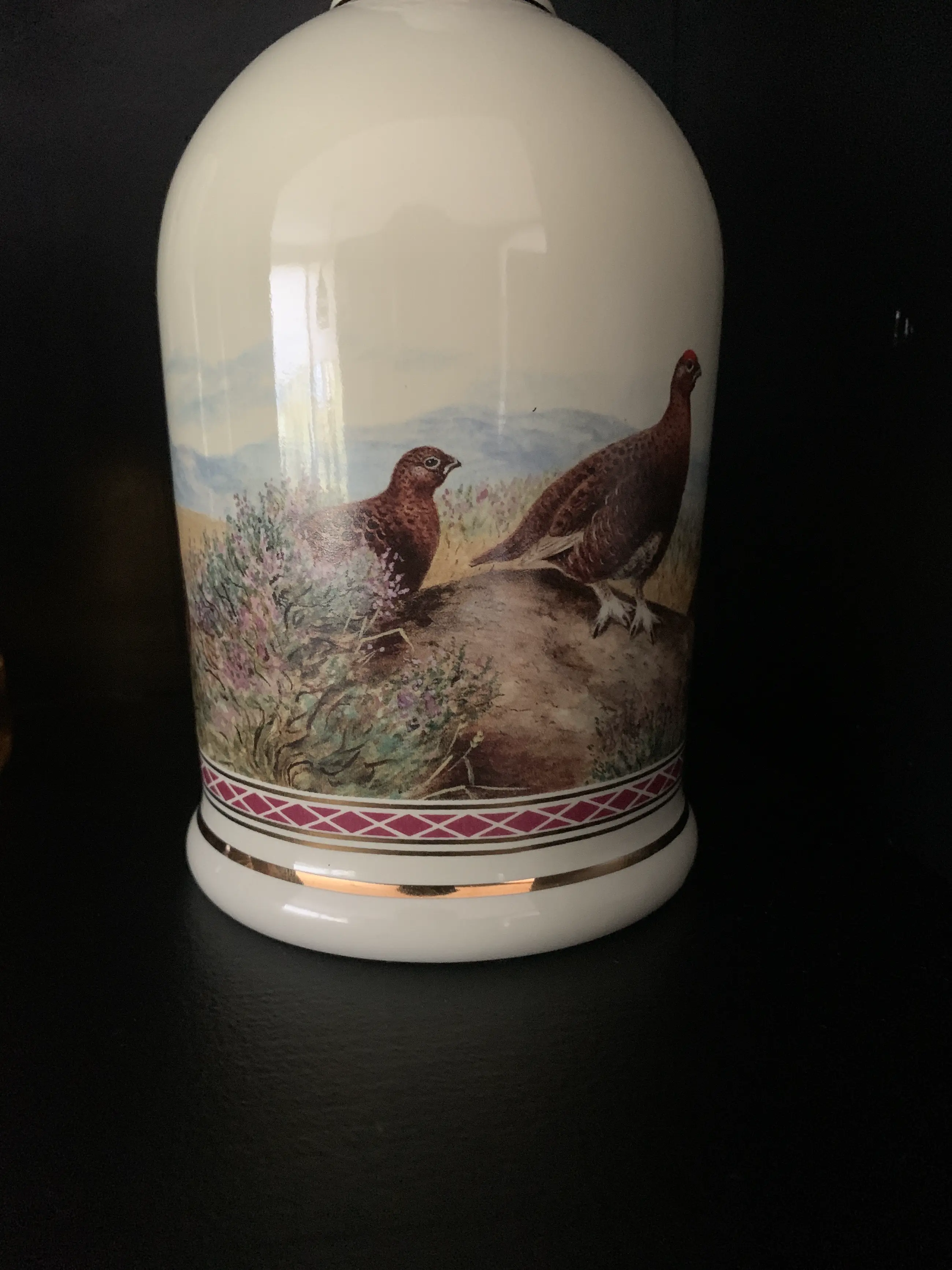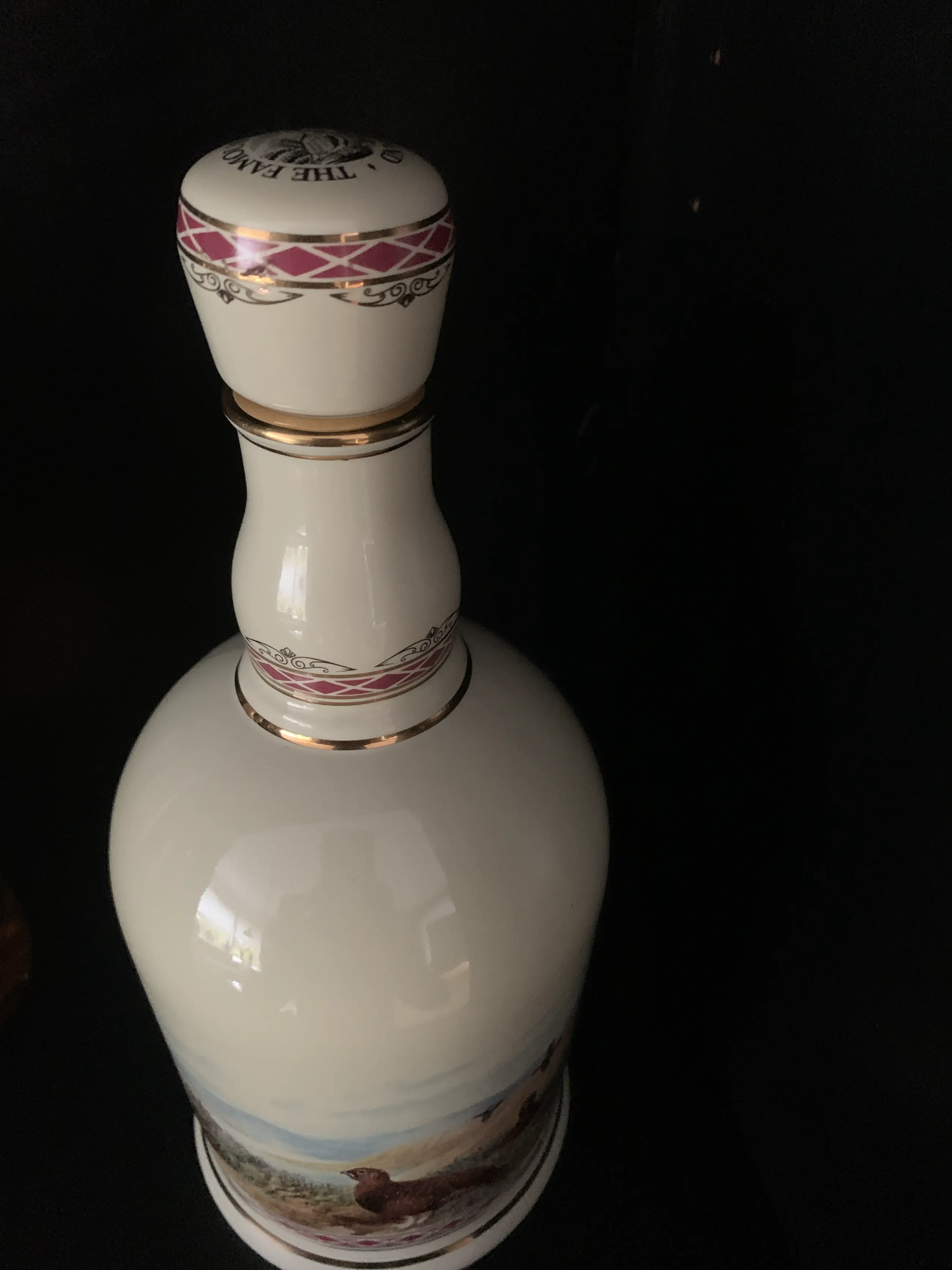 The Decanter features "summer in the highlands" by the Scottish artist Stanley Todd depicting the red grouse in its natural habitat.it is gilded with 24 carat gold.
