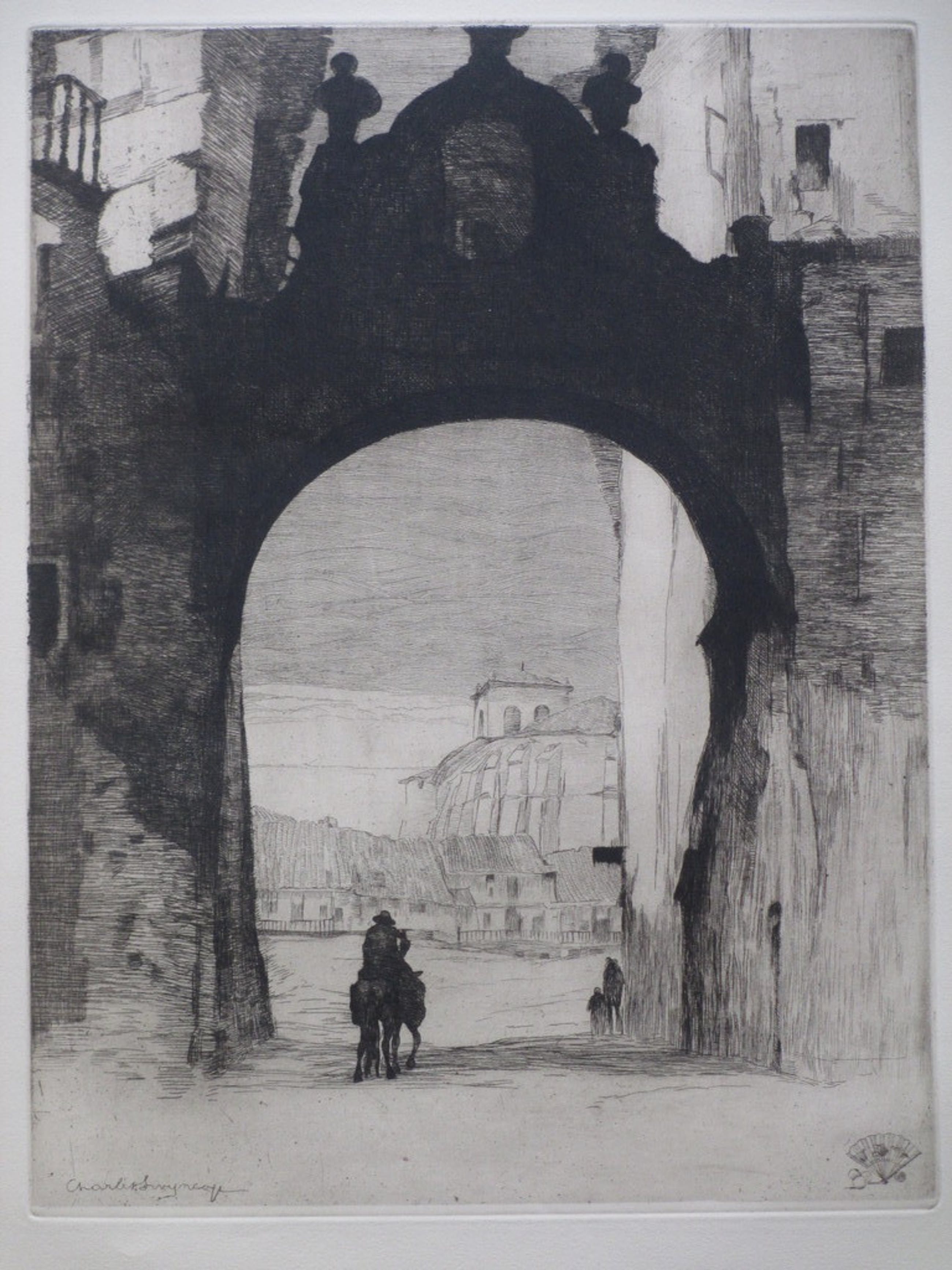 Voorstelling van een Spaanse poort met wandelaars en man op een ezel