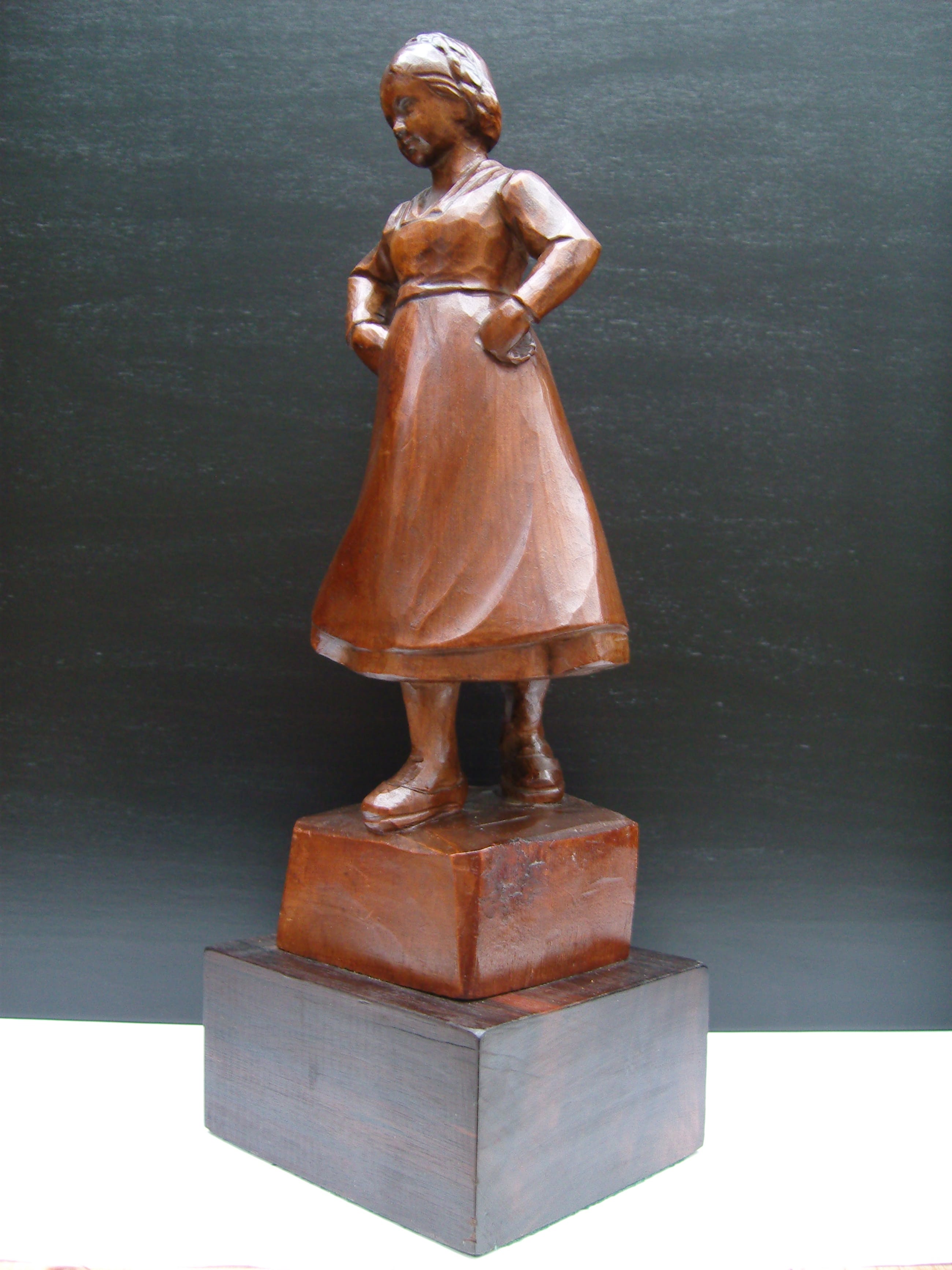 Schitterend beeld van deze geliefde beeldhouwer. v. Wijk was eigen lijk een bronskunstenaar bij uitstek. Dit houtsnijwerk mag dan ook zeer zeldzaam genoemd worden! Het beeld zonder de extra sokkel is ca. 35,8 hoog.