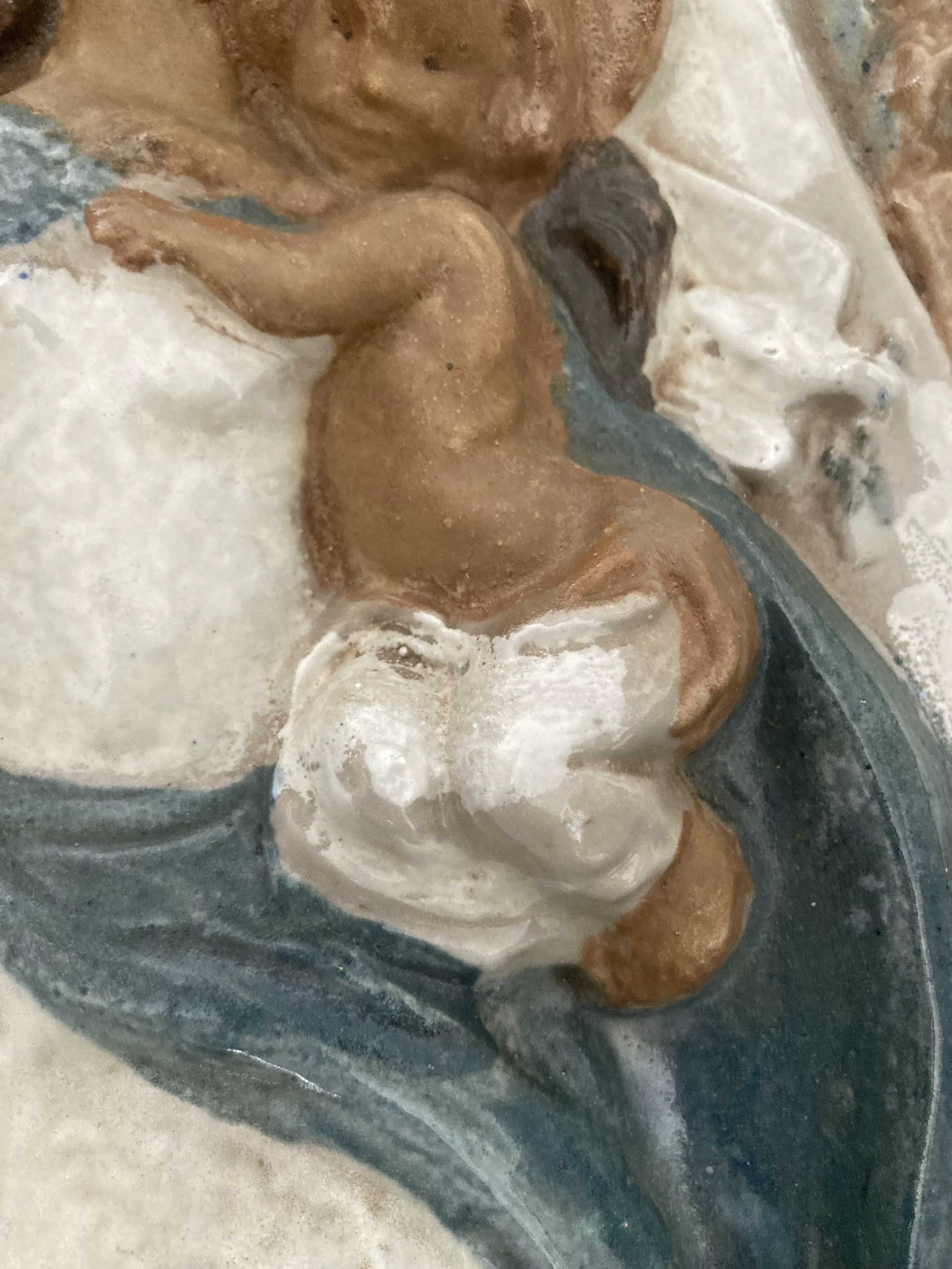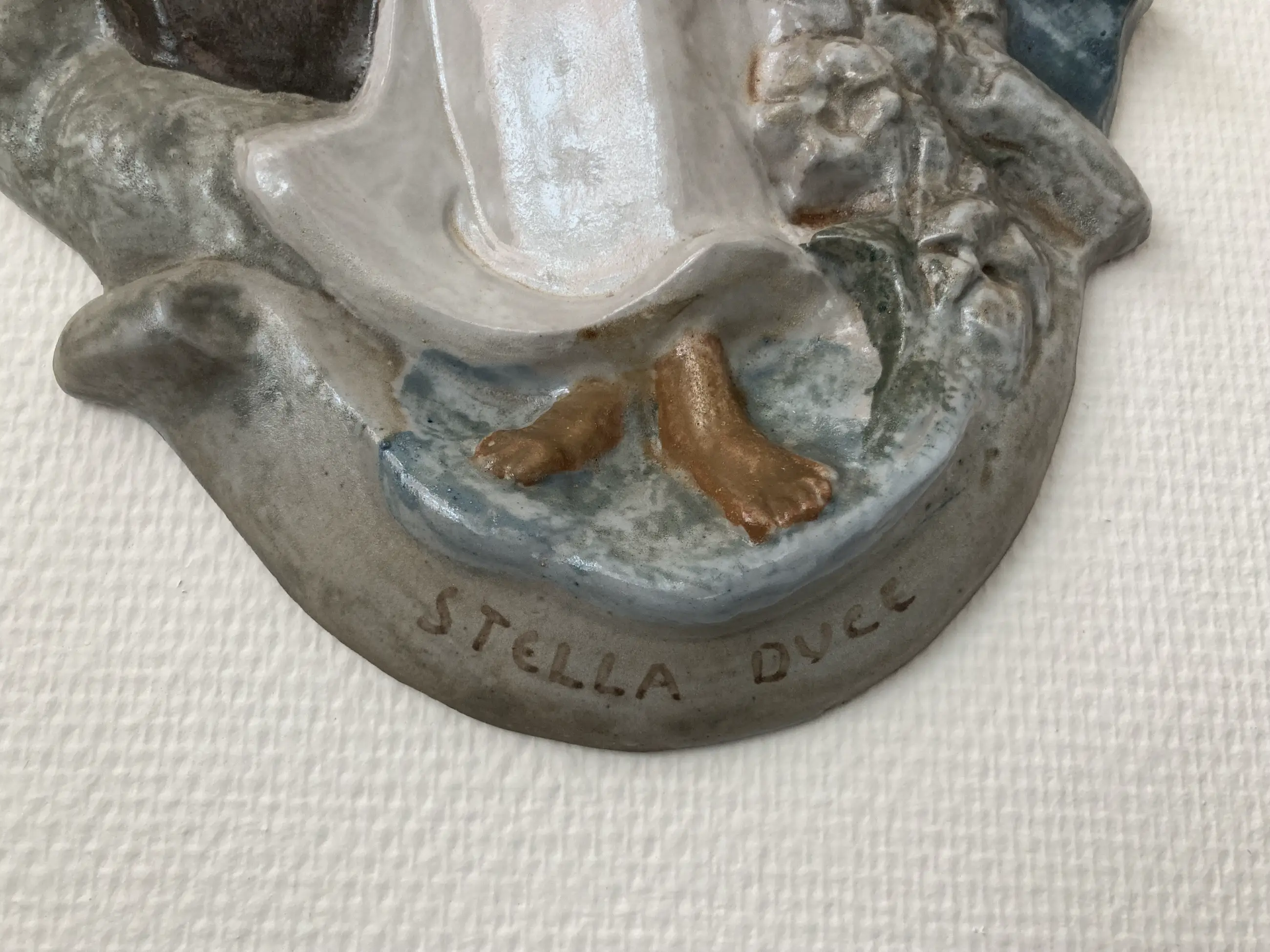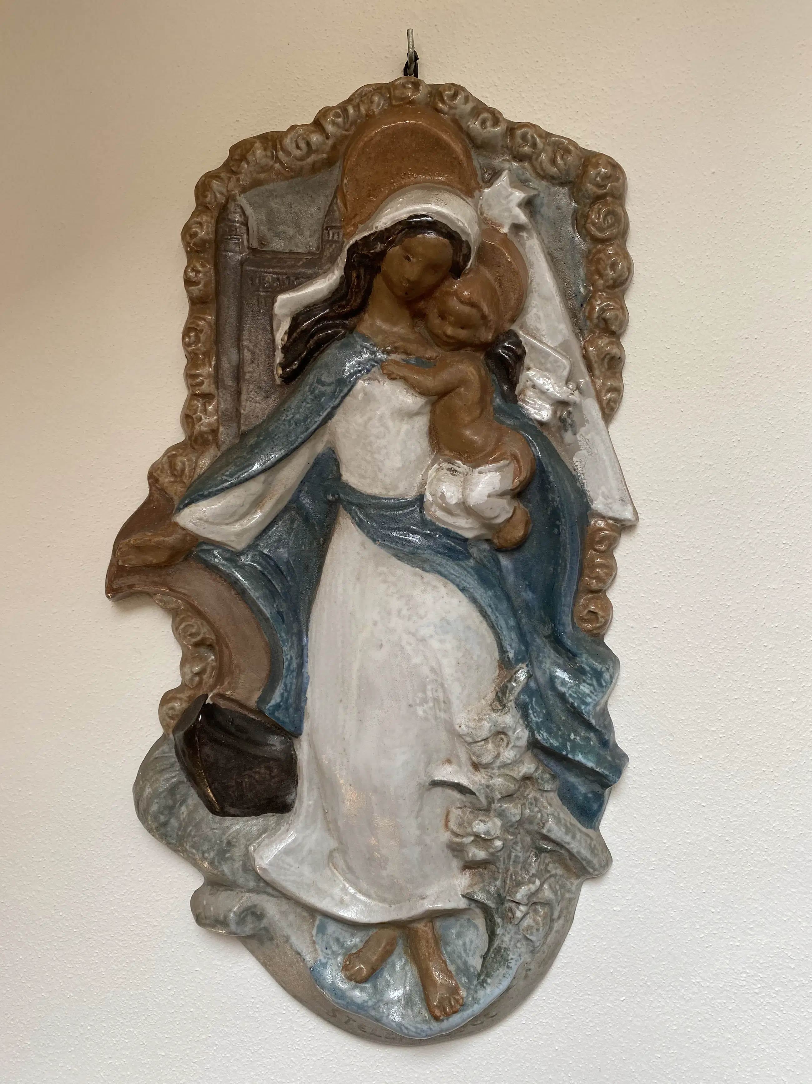 Reliëf van geglazuurd aardewerk in de bekende stijl van Charles Vos. Het toont Maria met Jezus, staande op een banderol met het opschrift "STELLA DUCE" (geleid door de ster). Op haar linkerarm draagt zij haar Kind; haar geopende rechterhand raakt het zeil van het scheepje dat op de golven deint. Rechts van haar hoofd een weergave van de Onze Lieve Vrouwe basiliek. Links van haar hoofd de ster van de Bidweg van Maastricht. Een zelfde plaquette hangt in de gevel van de Hof van Sint-Monica, Lenculenstraat 21 Hoek, Verwerhoek in Maastricht.