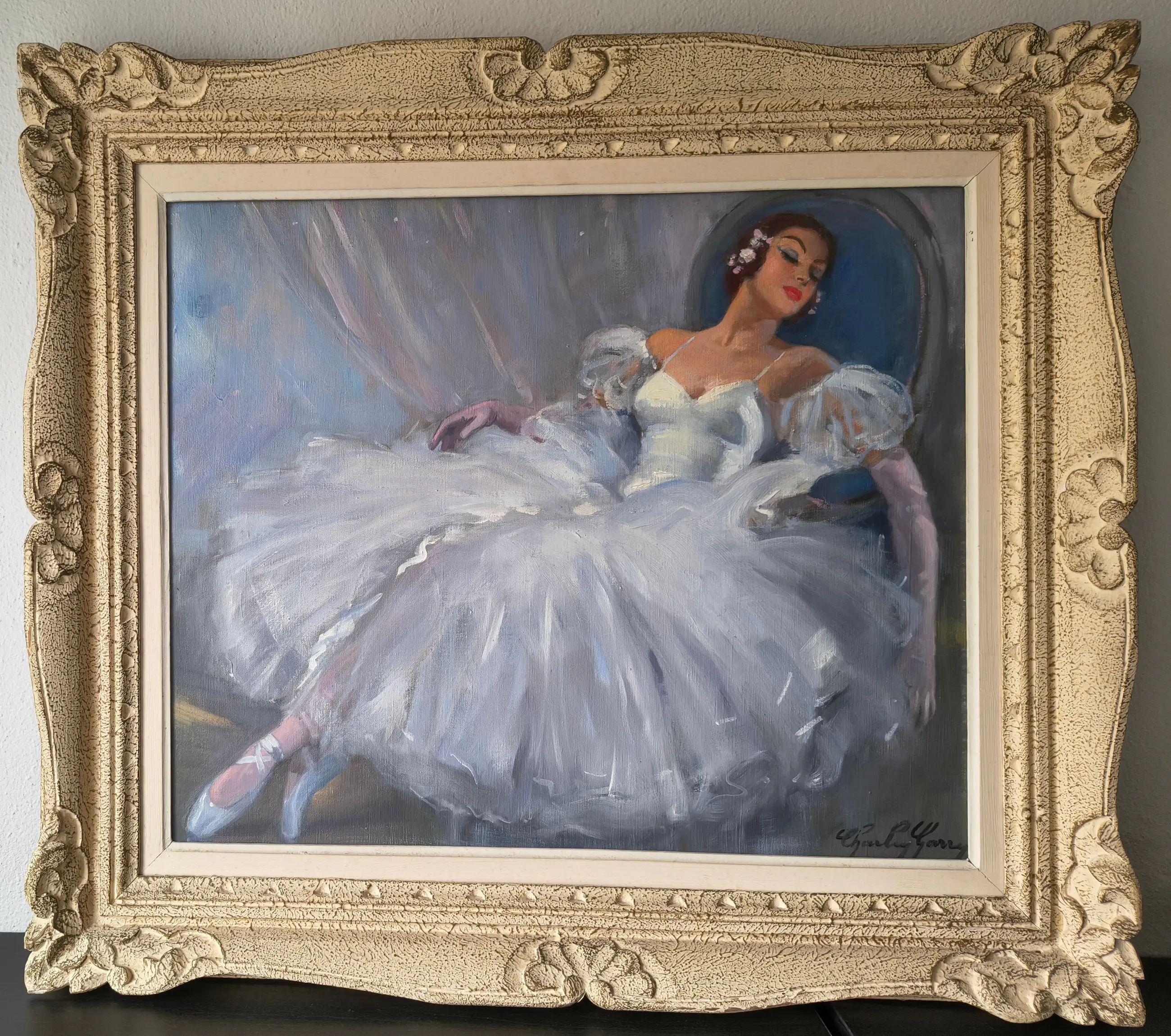 Dit is een schilderij van de Franse kunstenaar Charles Garry, die bekendstond om zijn sfeervolle, impressionistische ballerina’s. Het werk toont een danseres in rust en verkeert in uitstekende staat, met een zachte kleurstelling van wit- en paarstinten. Inclusief de sierlijke baroklijst die in elk interieur past.