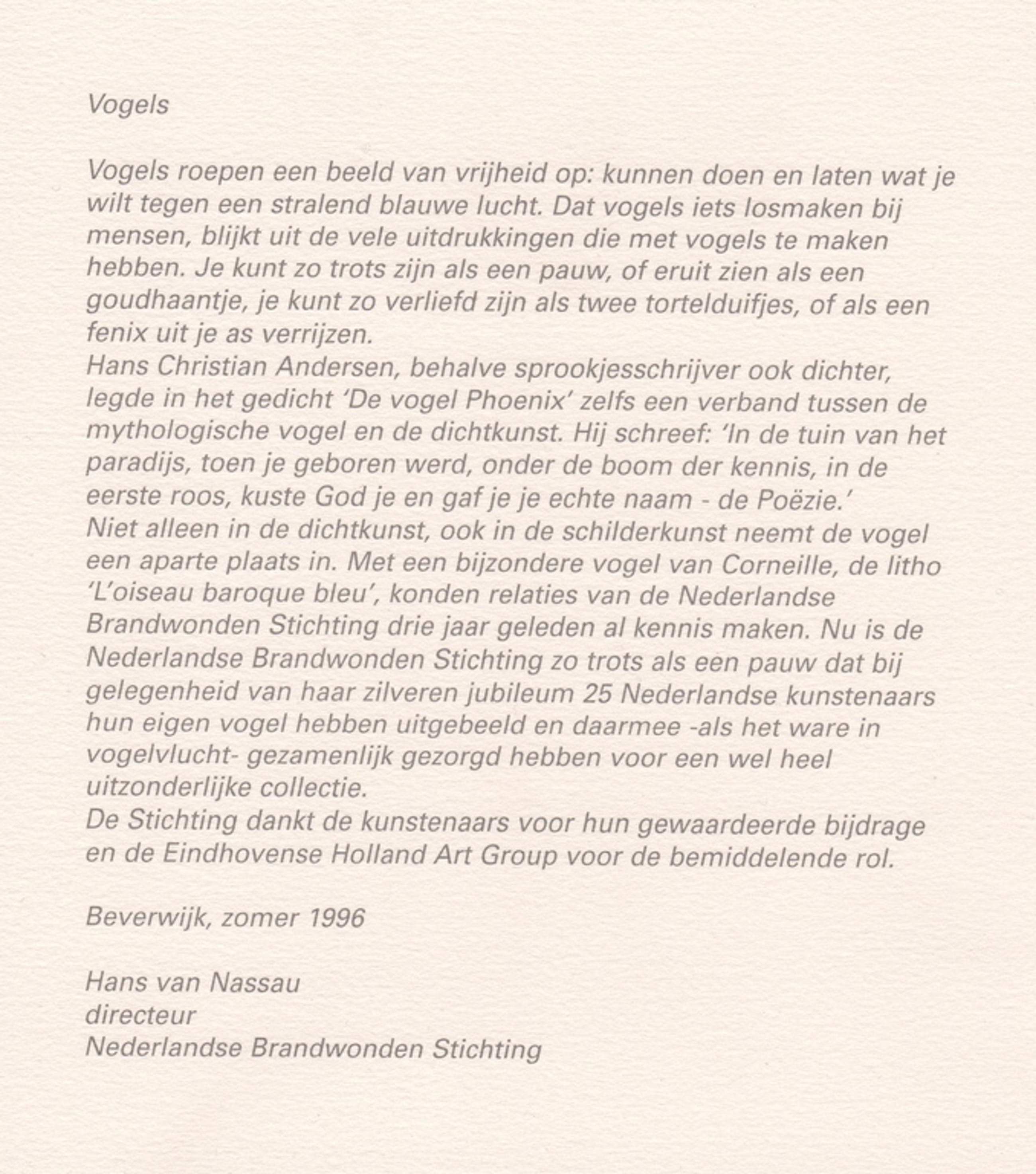 In 1996 uitgegeven ter ere van het 25-jarig bestaan van de Nederlandse Brandwonden Stichting. Voor deze gelegenheid hebben 25 kunstenaars hun interpretatie van een vogel vereeuwigd in een kunstwerk.
