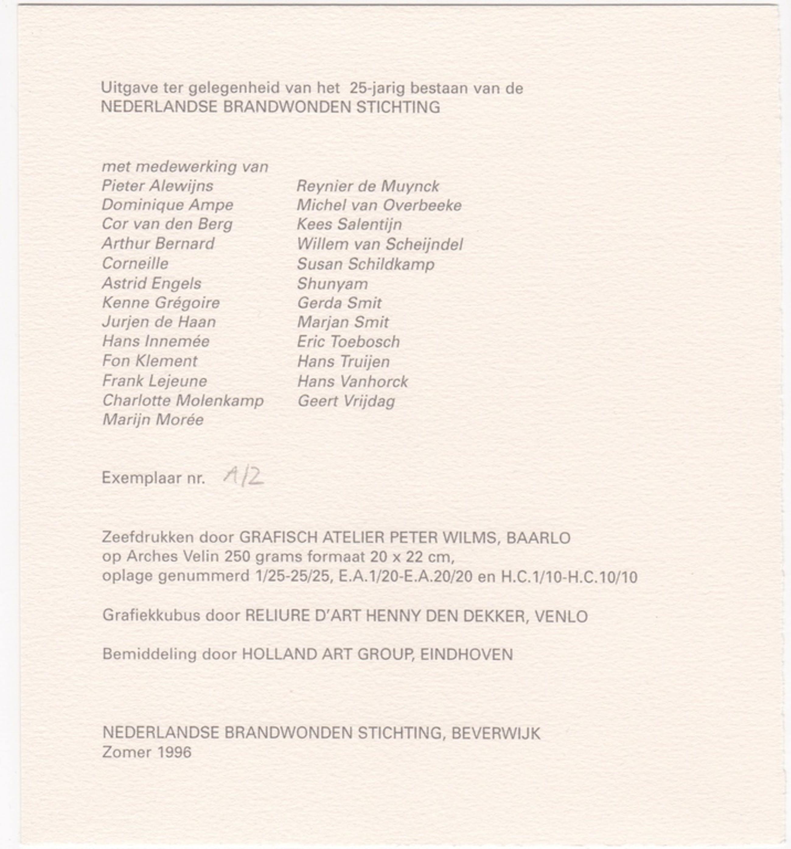 Deze zeefdruk is extreem zeldzaam, 'genummerd' A/Z. Het betreft de kunstenaarseditie. Alle kunstenaars hebben een complete box van 25 zeefdrukken ontvangen. Deze zeefdruk is eigendom geweest van Shunyam.
