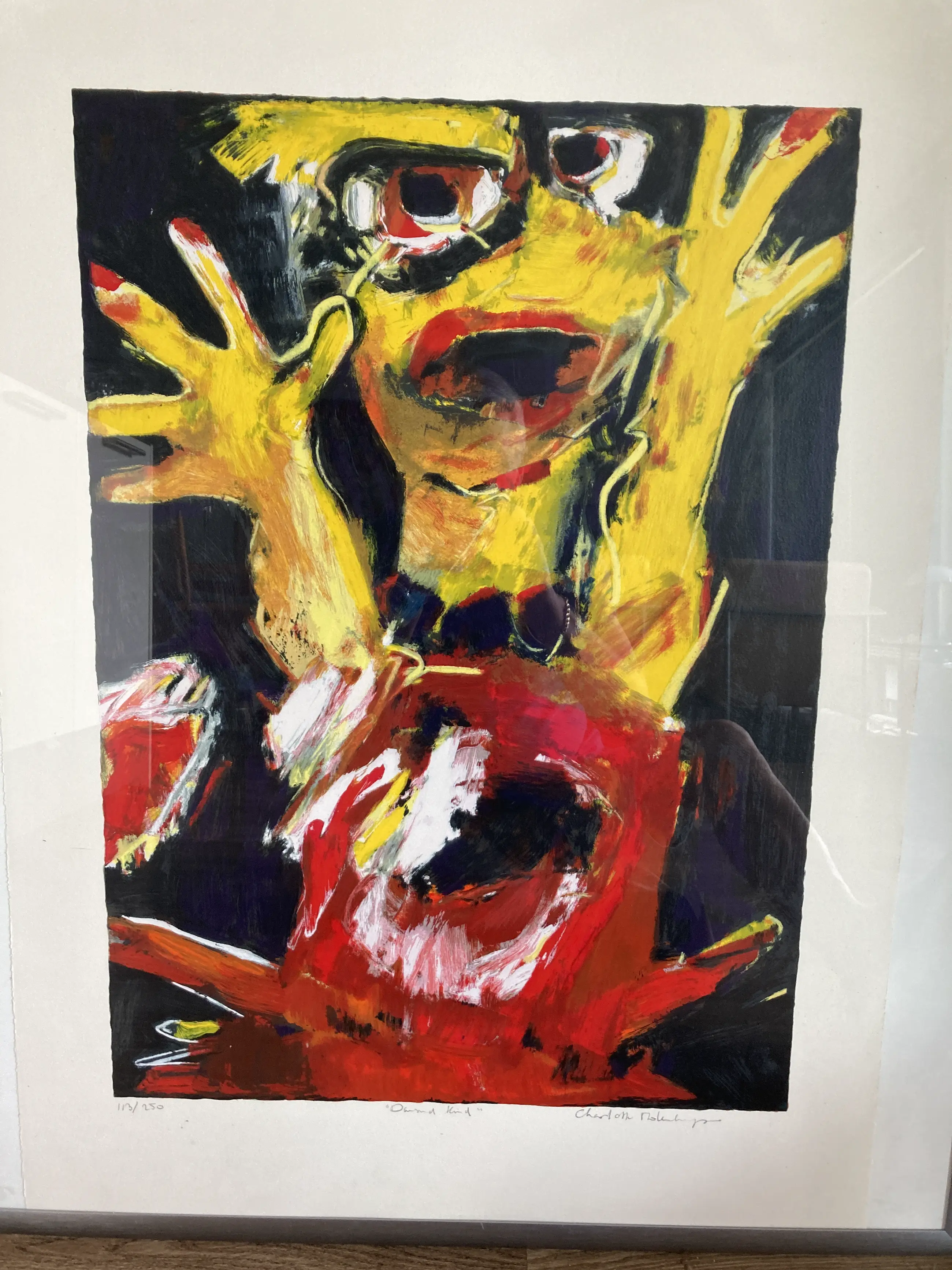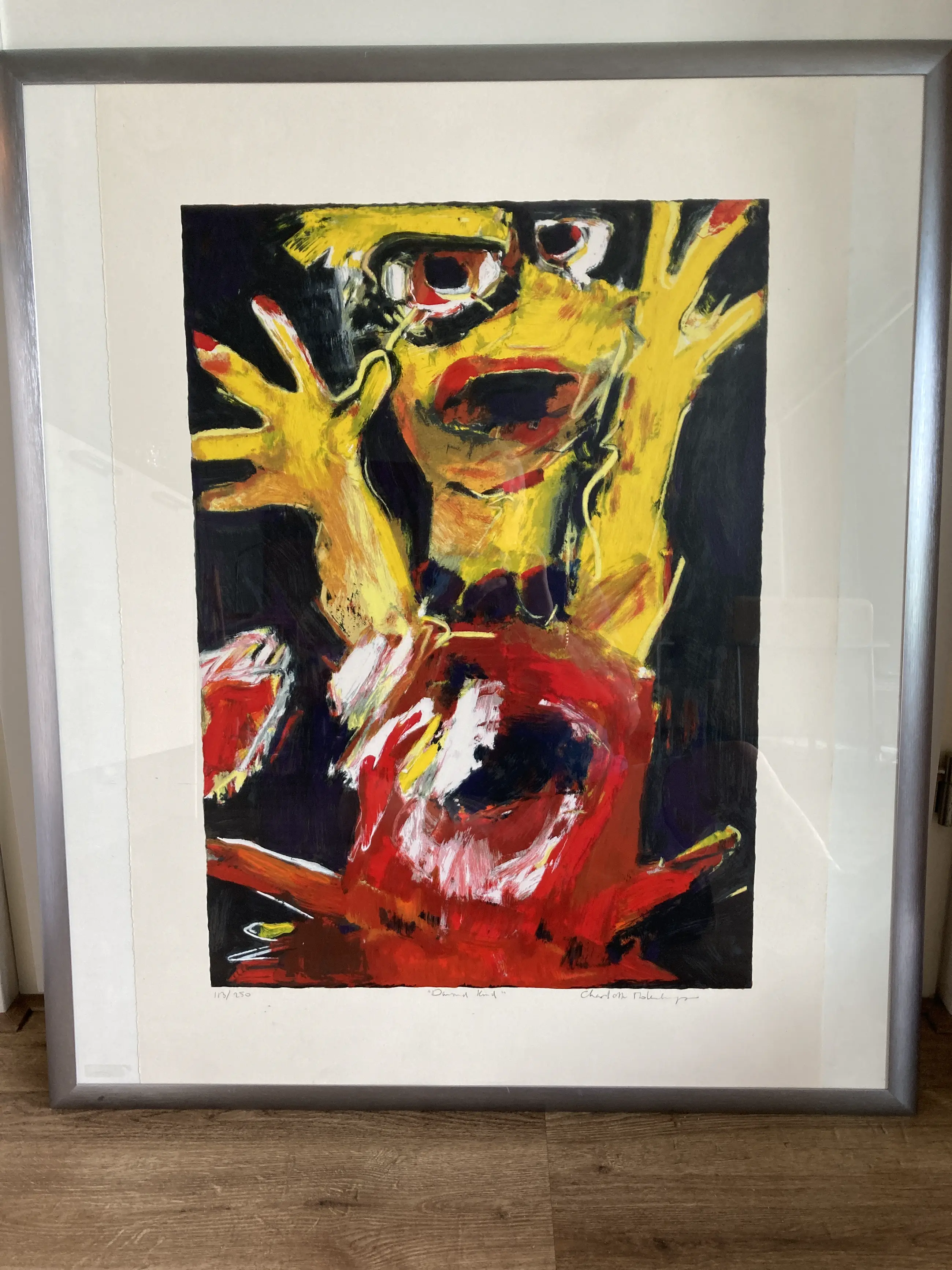 Met l.o. 113/250 met potlood, in het midden “Dansend kind ‘ met potlood en r.o. Charlotte Molenkamp met potlood. De zeefdruk zit in een prachtige aluminium halfronde lijst van 4 cm breed.