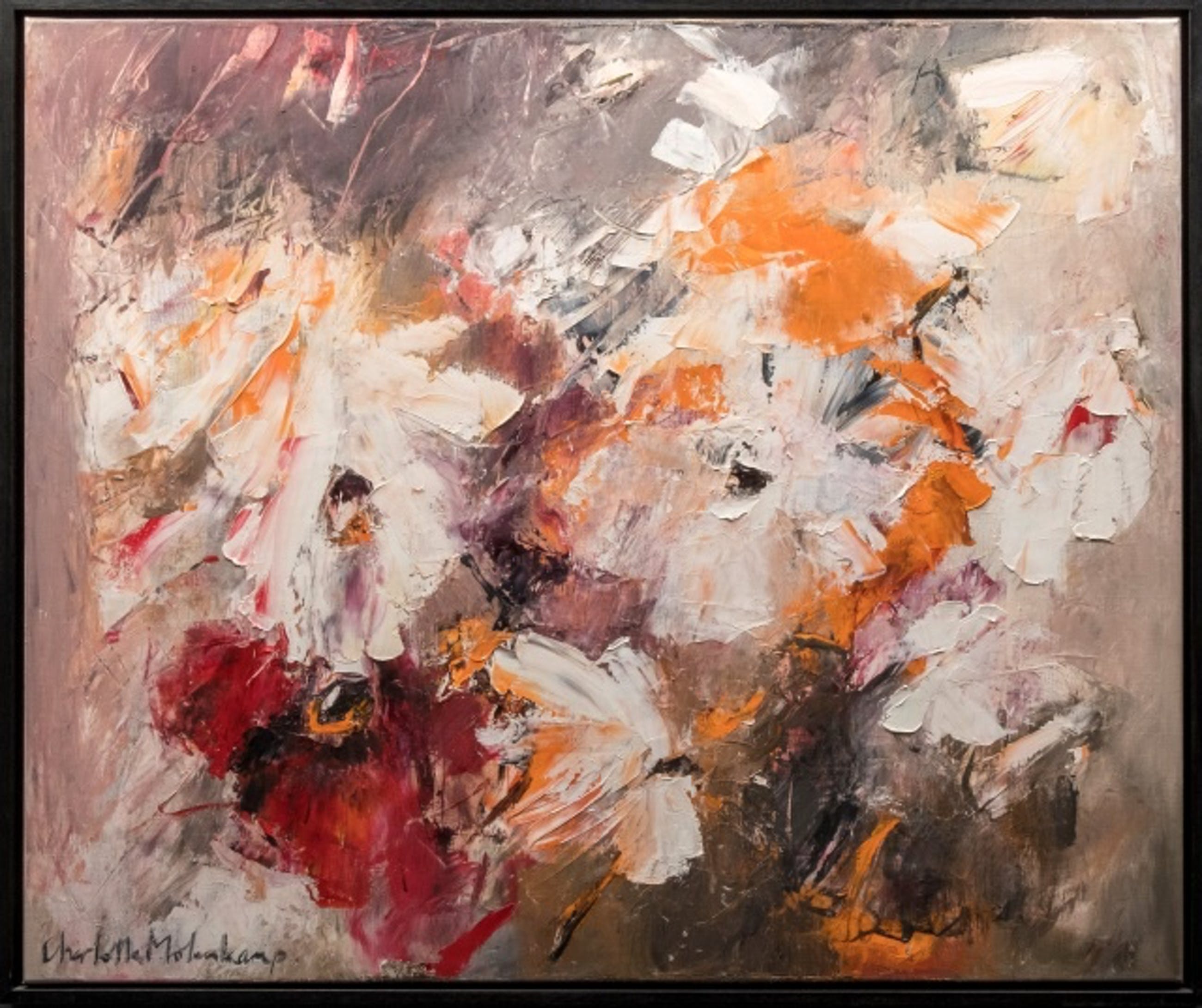 Prachtig olieverf op doek van Charlotte Molenkamp. Met dikke lagen olieverf is een prachtig boeket bloemen samengesteld. Afmetingen werk: H100 x b120 cm. De authenticiteit van het, aangeboden, werk wordt volledig gegarandeerd. Een certificaat van echtheid kan, op aanvraag, worden gemaild.