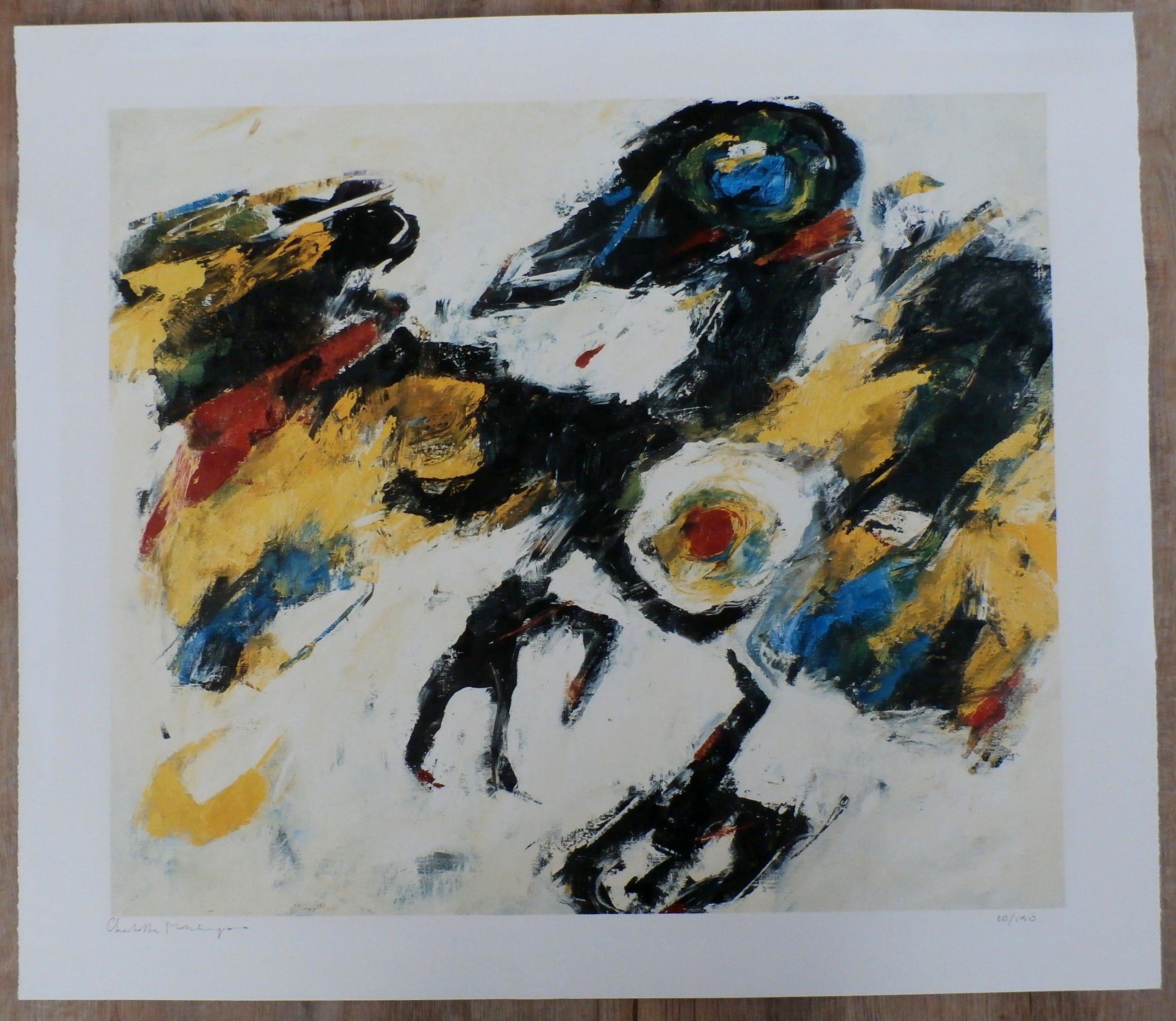 Grote zeefdruk van Charlotte Molenkamp. Titel: Vogel. Nummer: 20/150. Afmetingen blad : H80 x b90 cm. Afmetingen voorstelling: H58 x b67. De zeefdruk is , met potlood, linksonder gesigneerd door de kunstenares. De authenticiteit van dit werk wordt voor 100% gegarandeerd. Een certificaat van echtheid kan, op aanvraag, worden