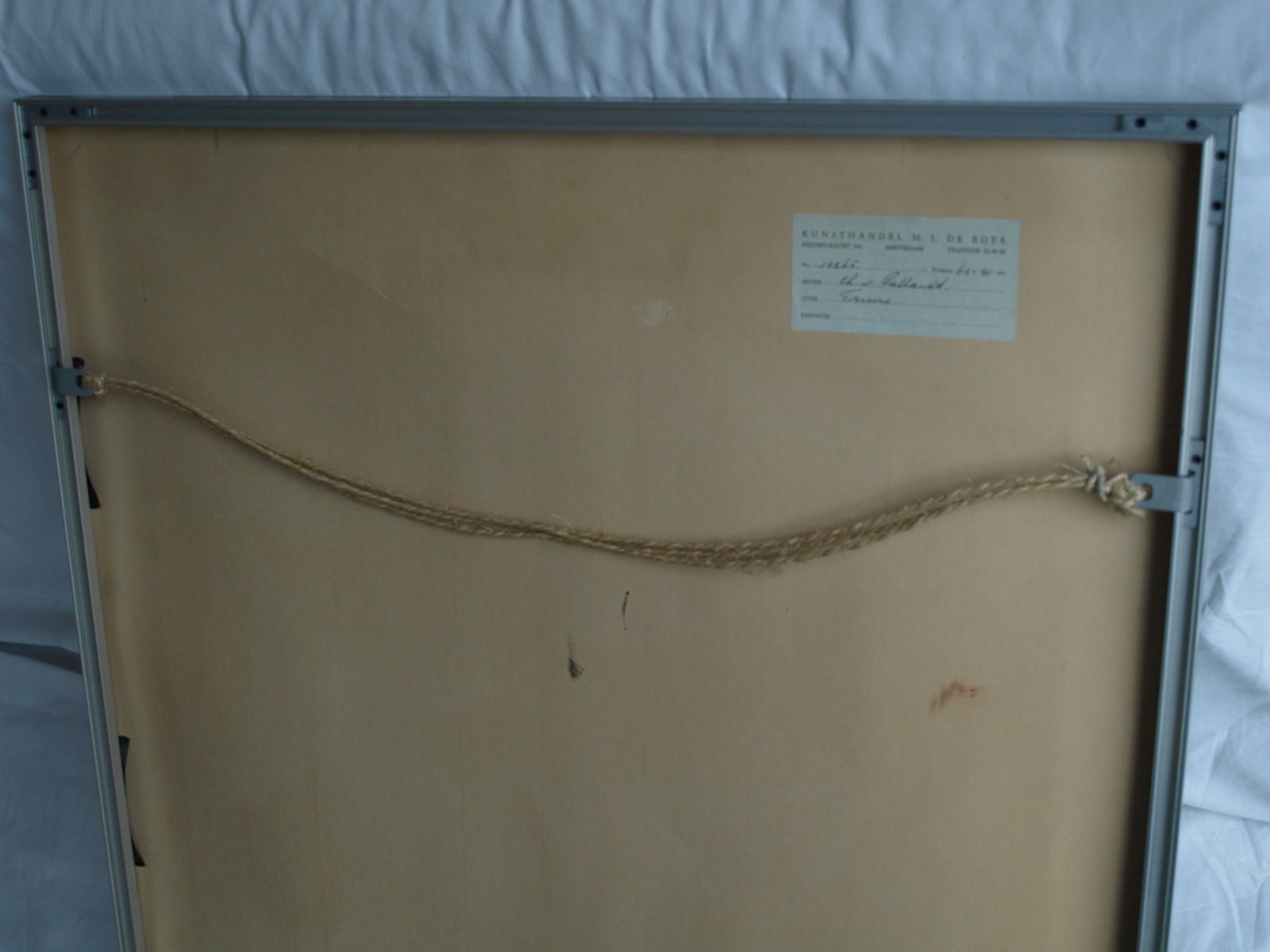 Ingelijst: Ingelijst in een metalen lijst met passe-partout en glasplaat.