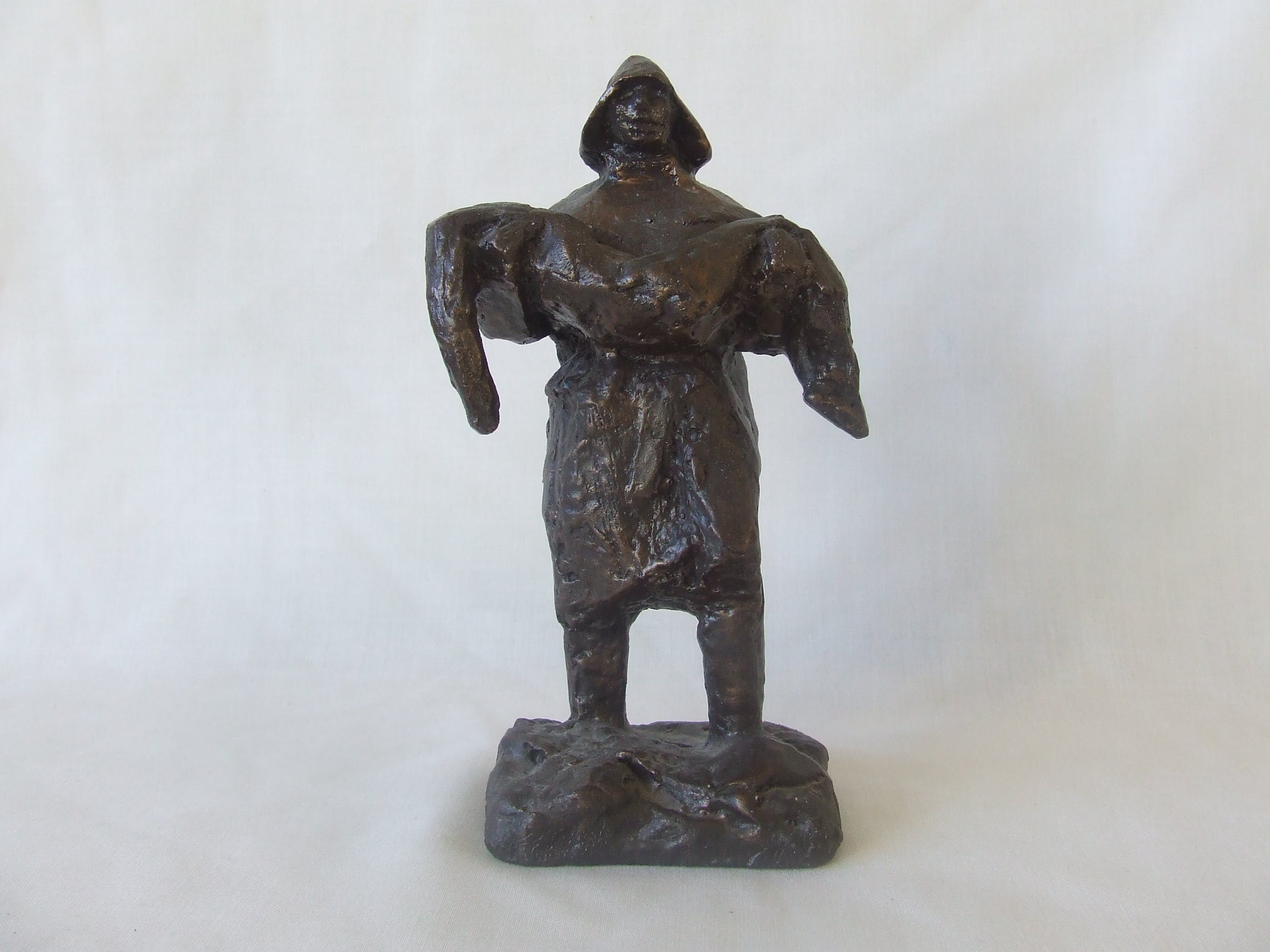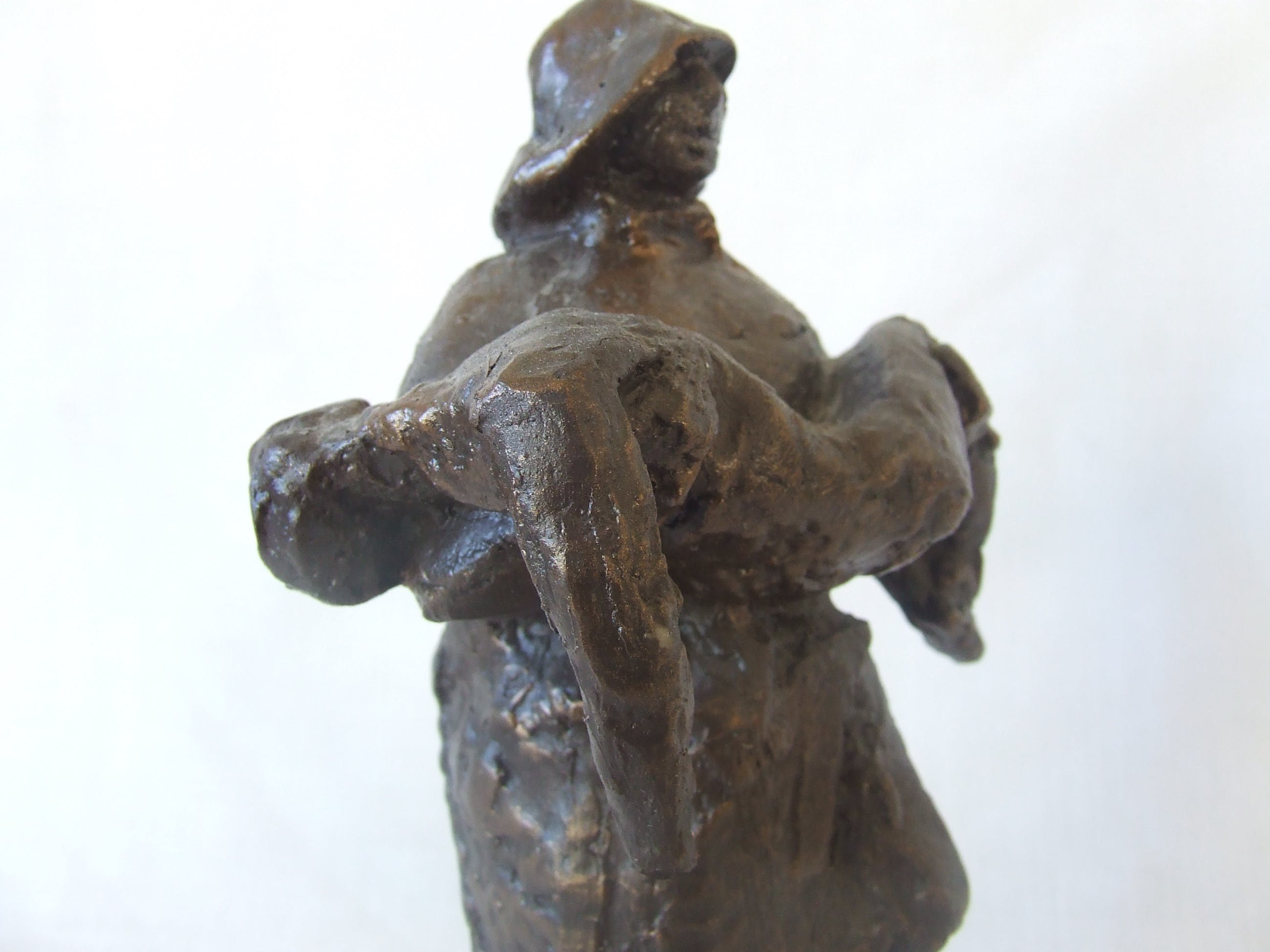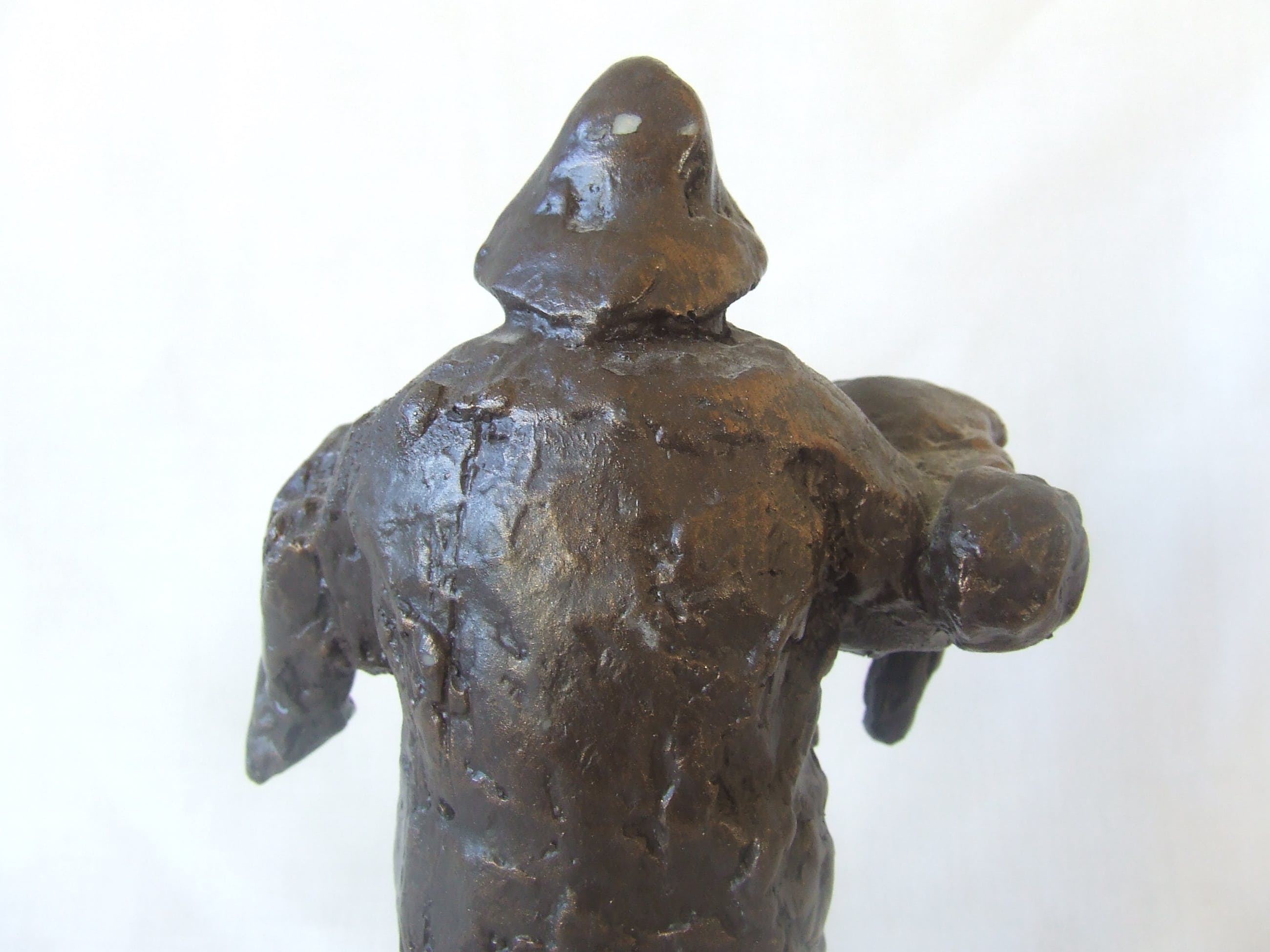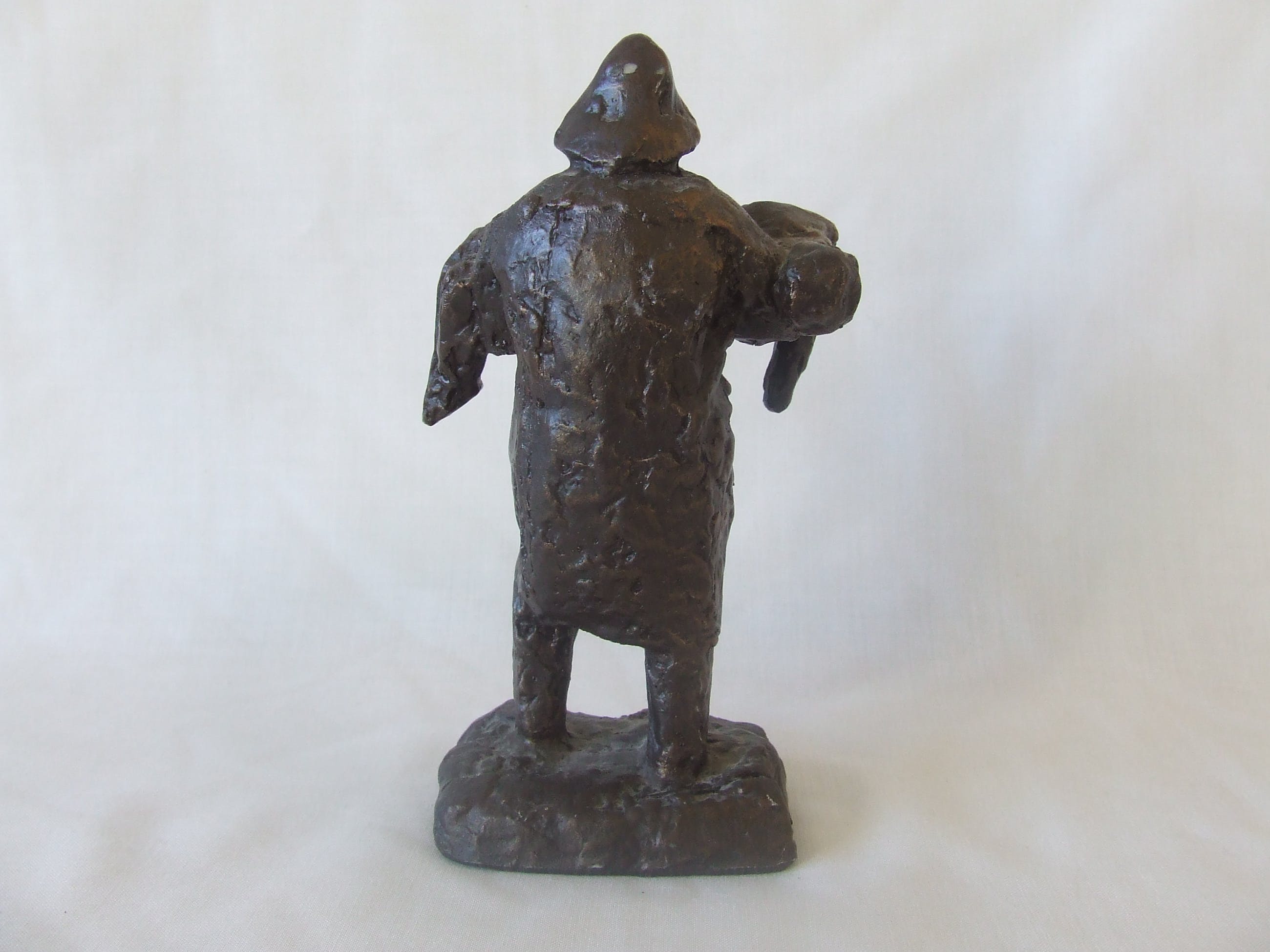 Dit beeldje is een resin replica naar het originele grote beeld in Noordwijk aan Zee. Mooi extra is het lichtglanzende zwarte patina dat het beeldje de uitstraling geeft van, hier heel toepasselijk, door-en-doornat te zijn.