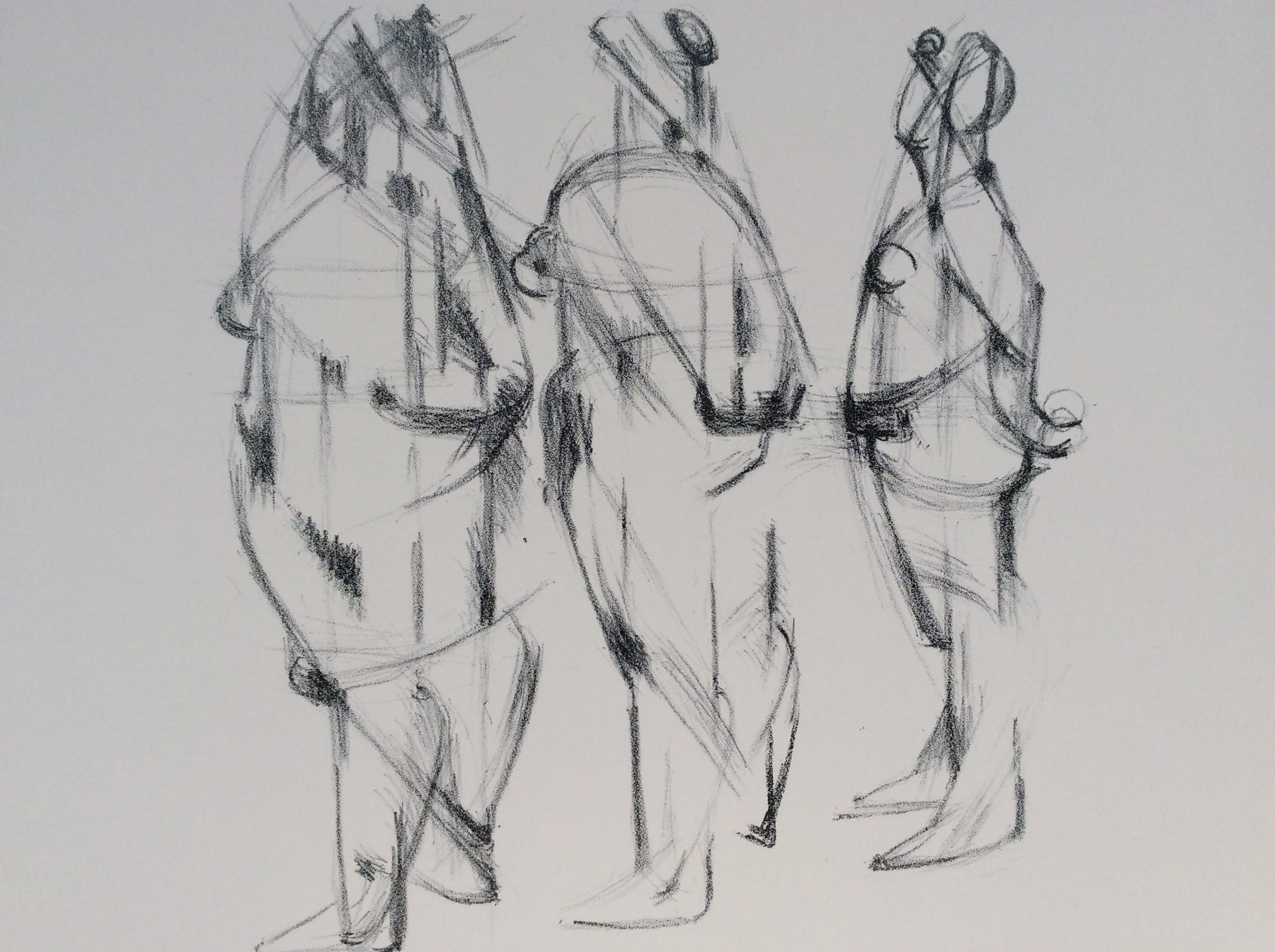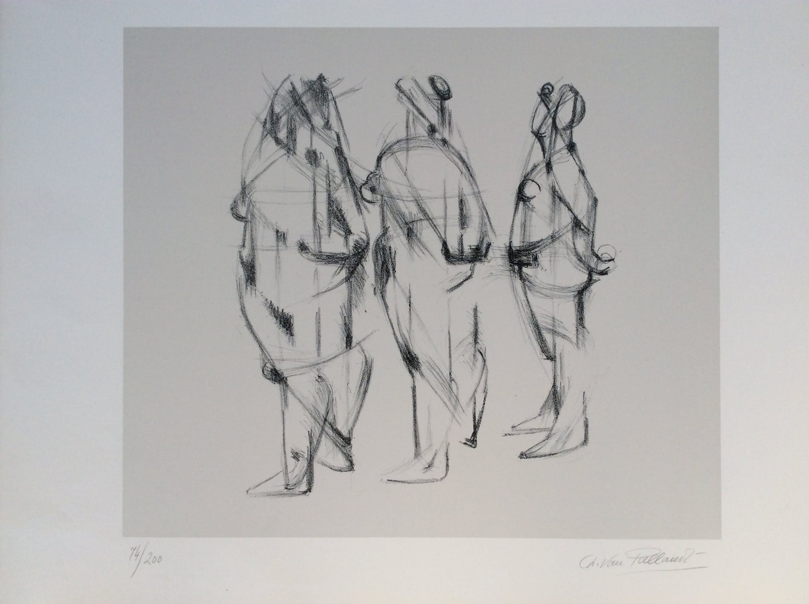Fraaie lithografie van Charlotte van Pallandt: voorstelling van 3 vrouwelijke figuren. Op geschept papier. Formaat incl. 65 x 50 cm, beeld 46 x 39 cm. Oplage 74/200. Ca. 1970. R.o. potlood gesigneerd ‘Ch.van Pallandt’ In mooie staat, zeer minimale gebruikssporen aan rand.