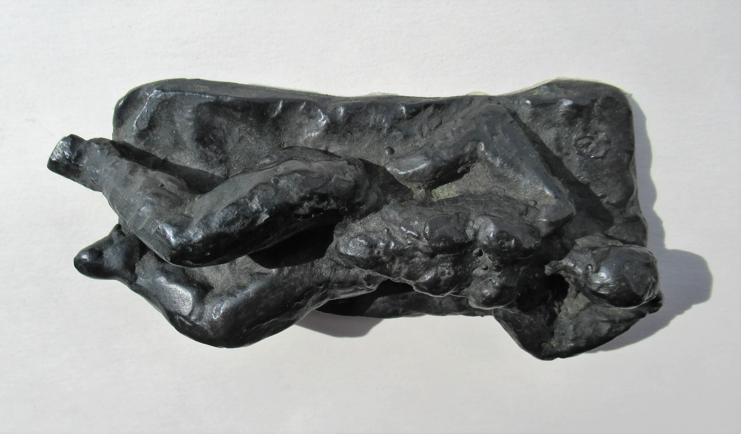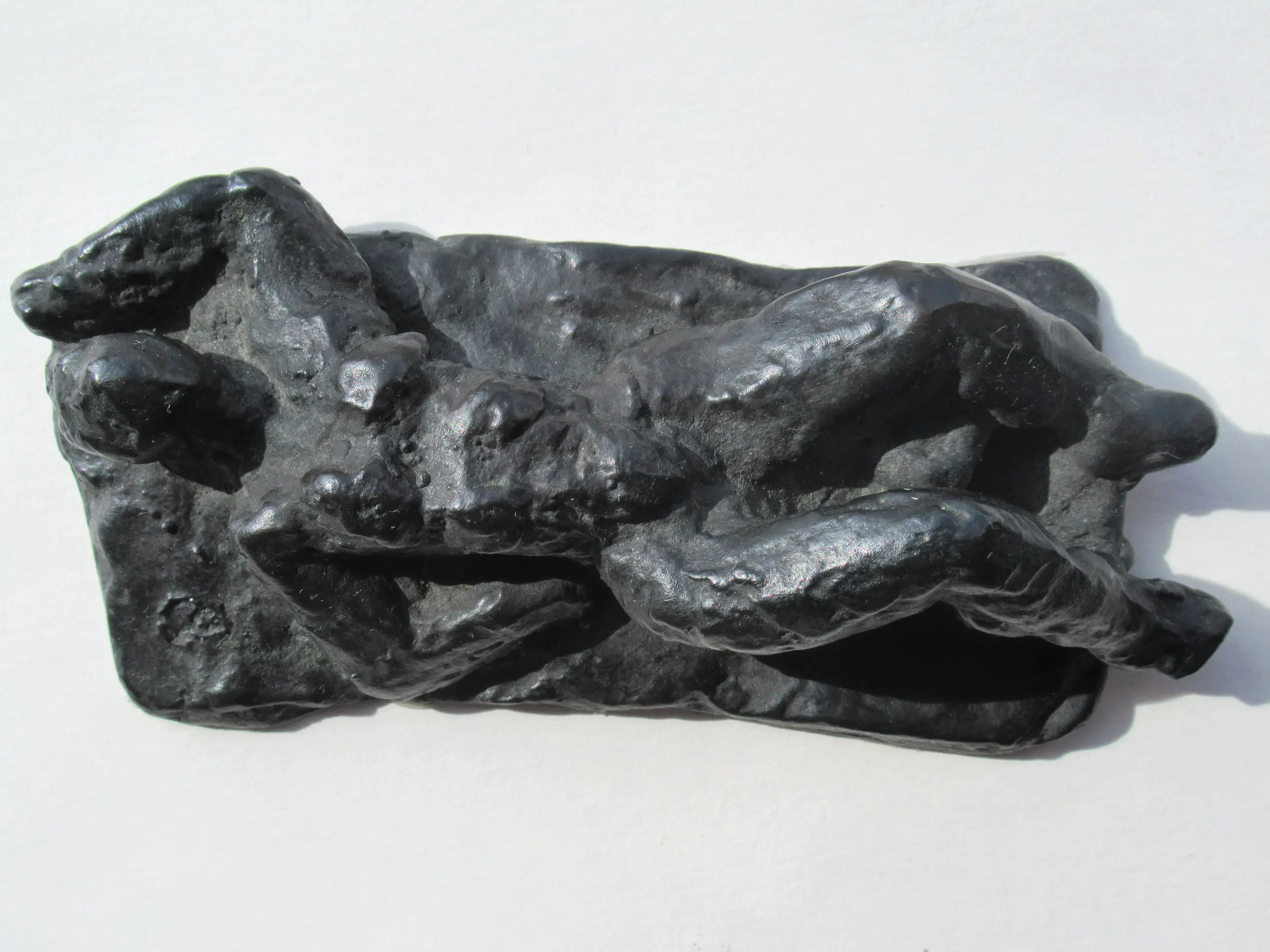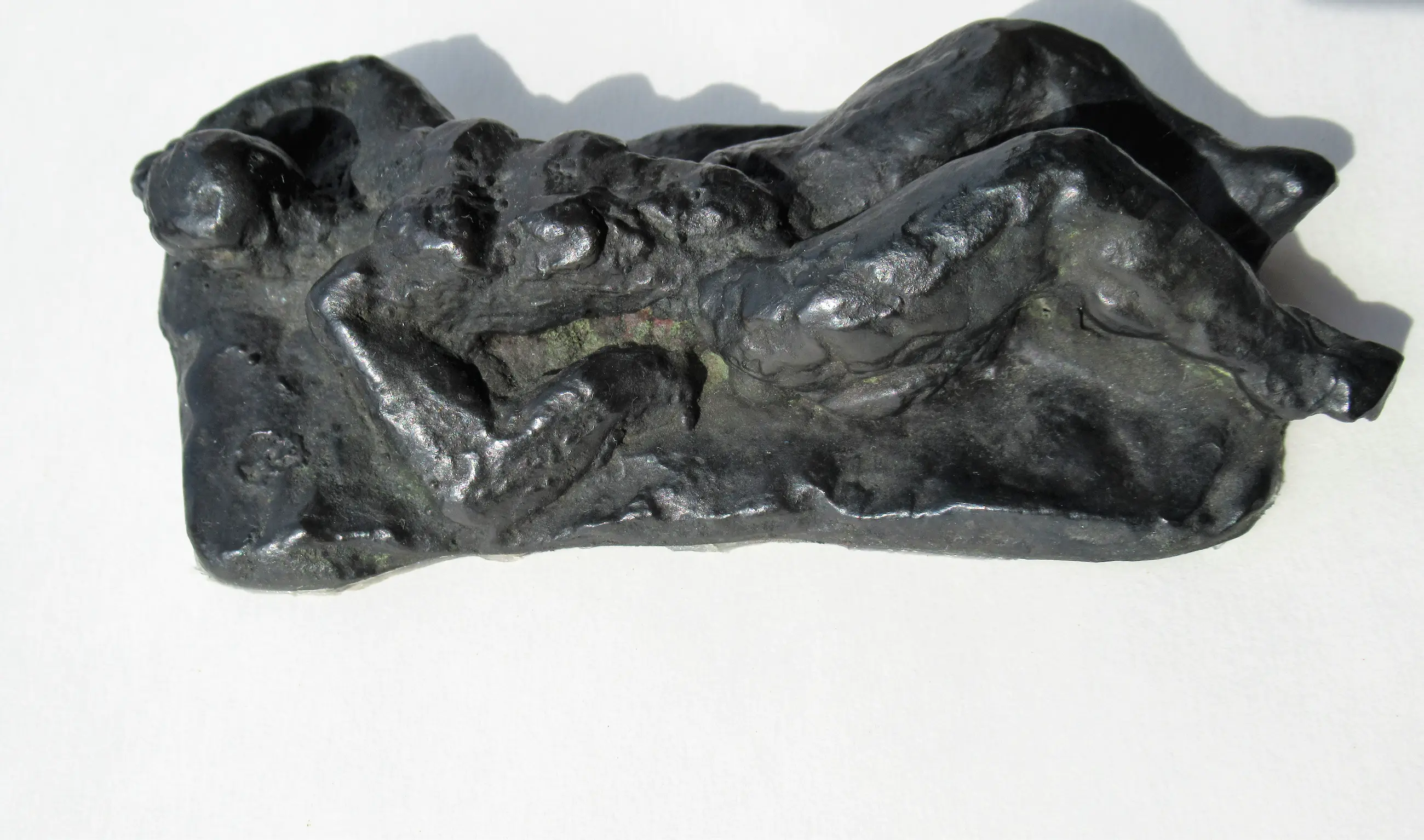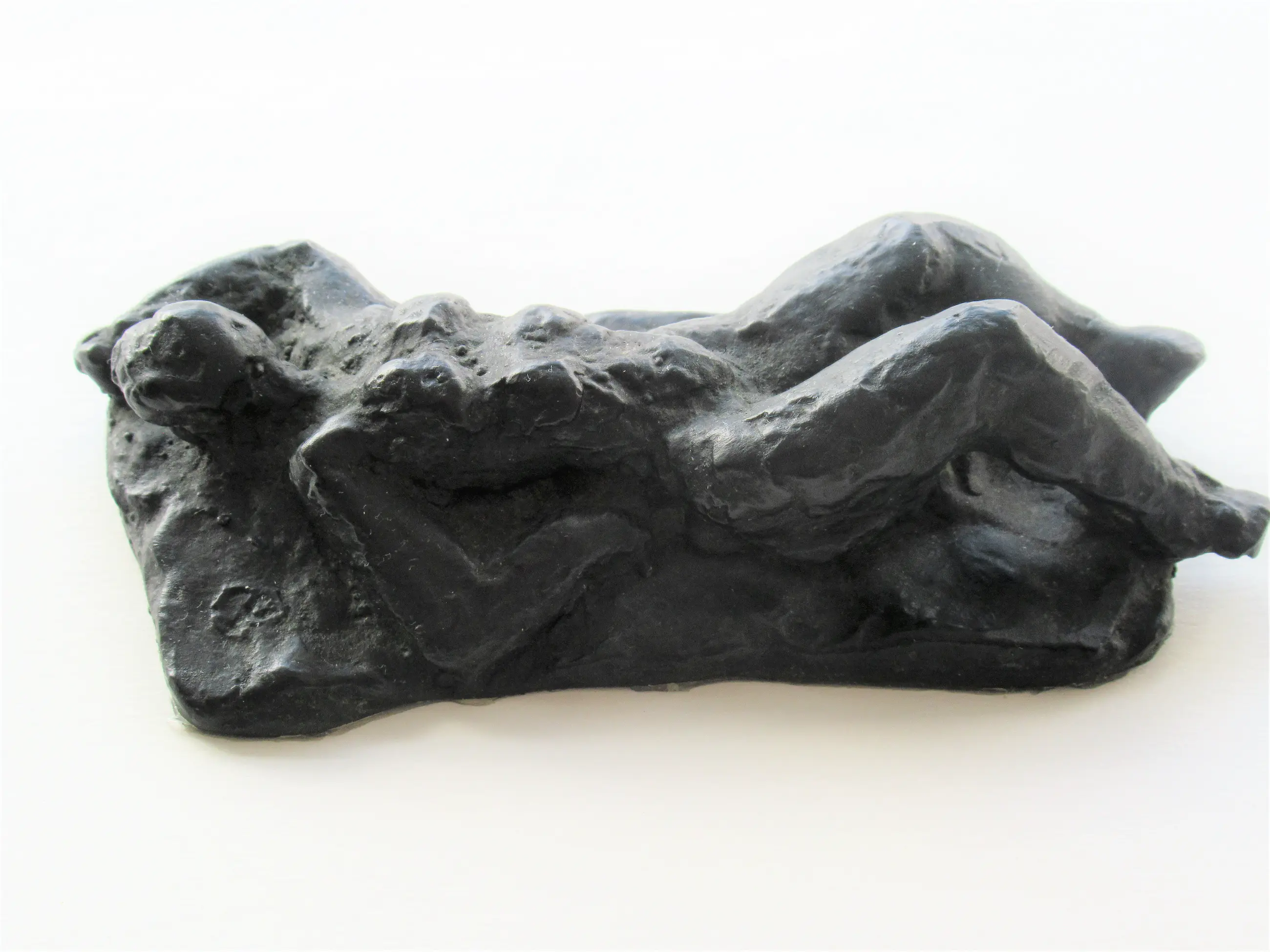 Een zeer klein beeldje van Charlotte van Pallandt. Een liggend vrouwelijk naakt, één arm in de zij, één arm boven het hoofd. Brons met zeer donker patina (zwart). Voorzien van een monogram (CP) in de linker bovenhoek van de voetplaat.