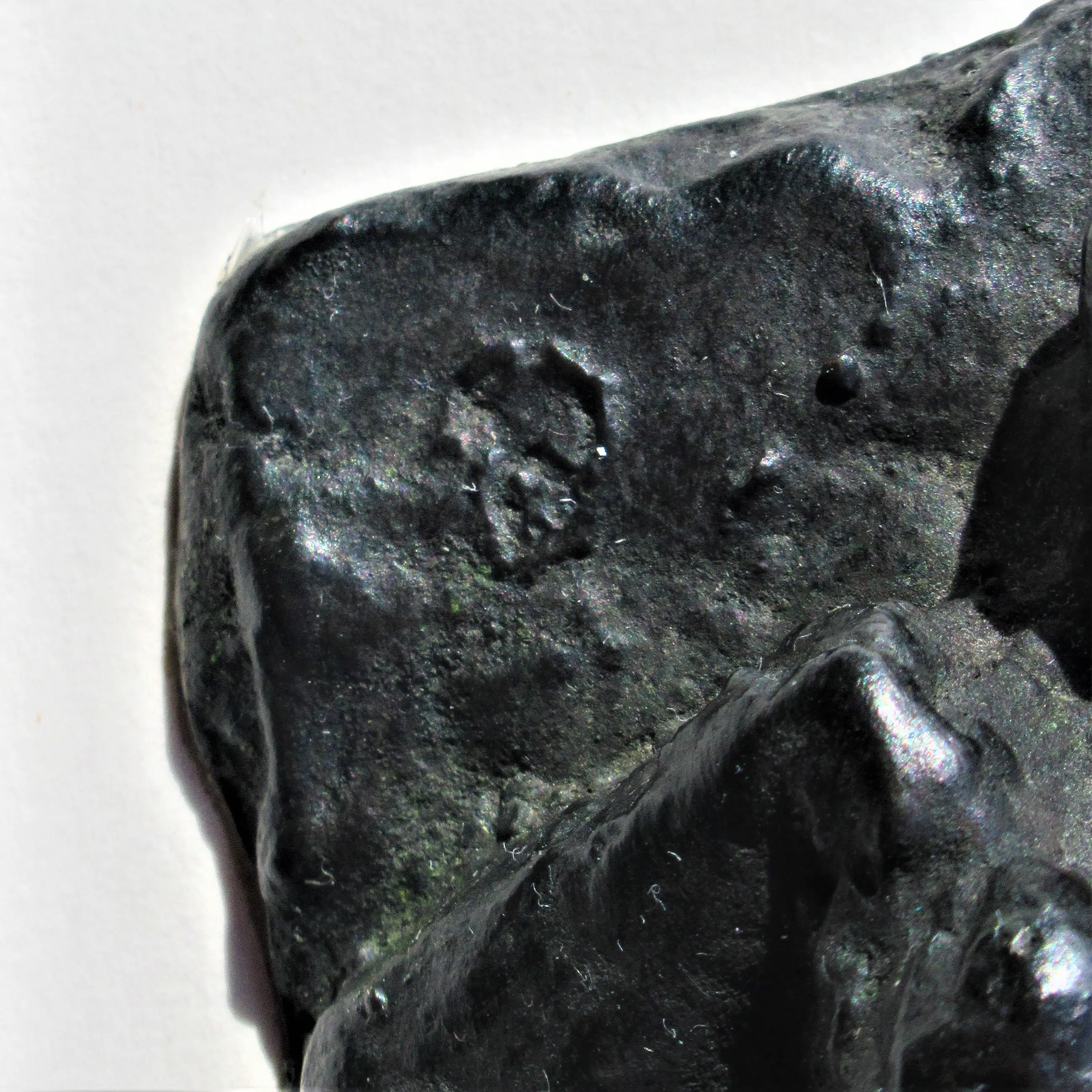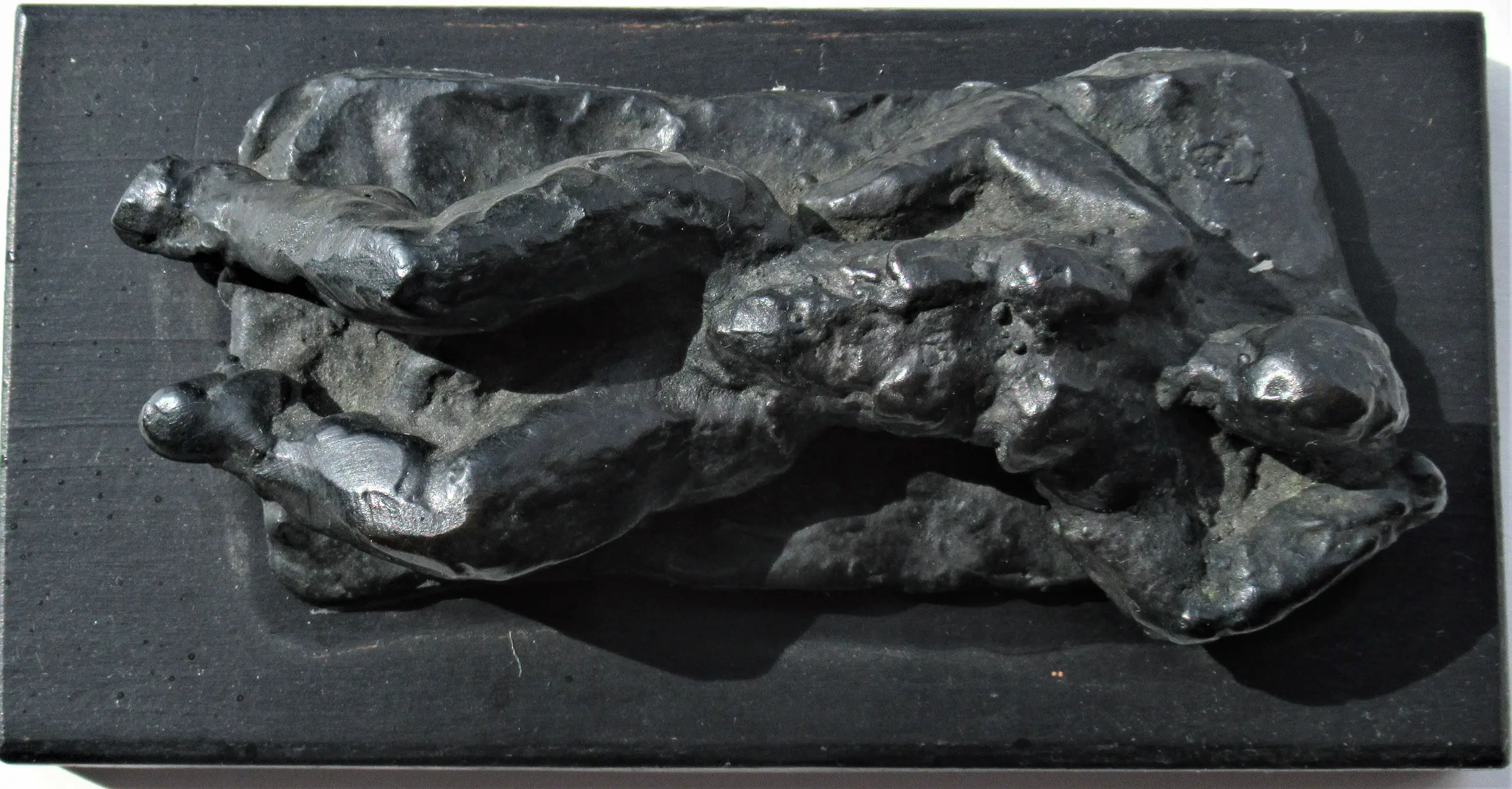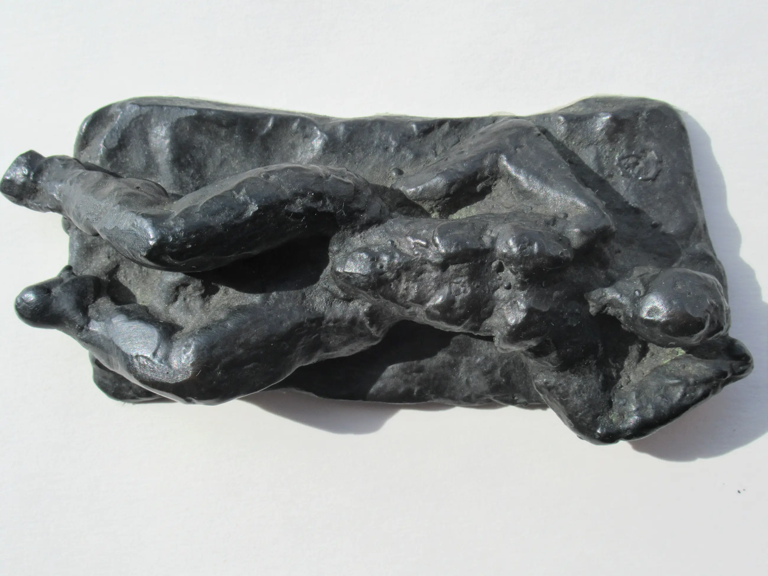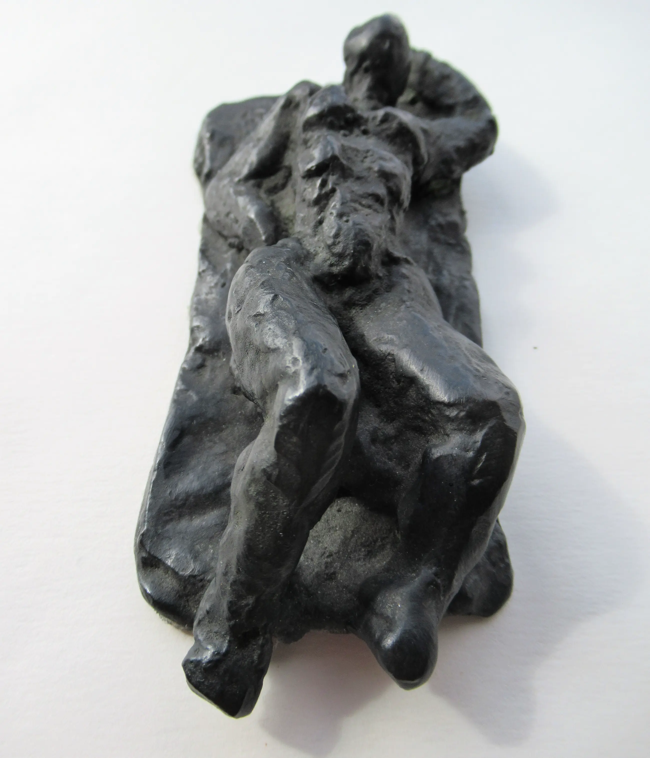 Een zeer klein beeldje van Charlotte van Pallandt. Een liggend vrouwelijk naakt, één arm in de zij, één arm boven het hoofd. Brons met zeer donker patina (zwart). Voorzien van een monogram (CP) in de linker bovenhoek van de voetplaat.