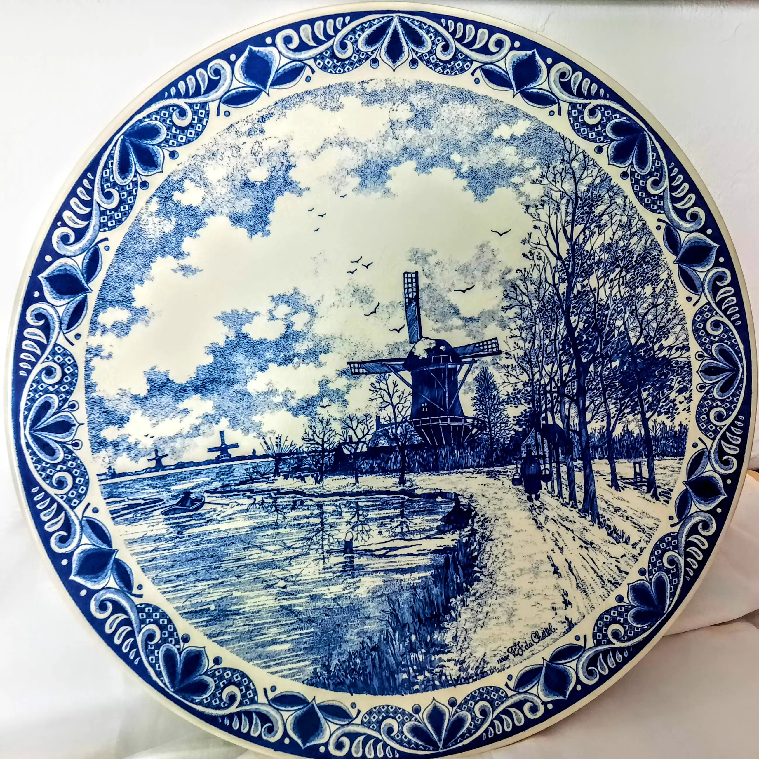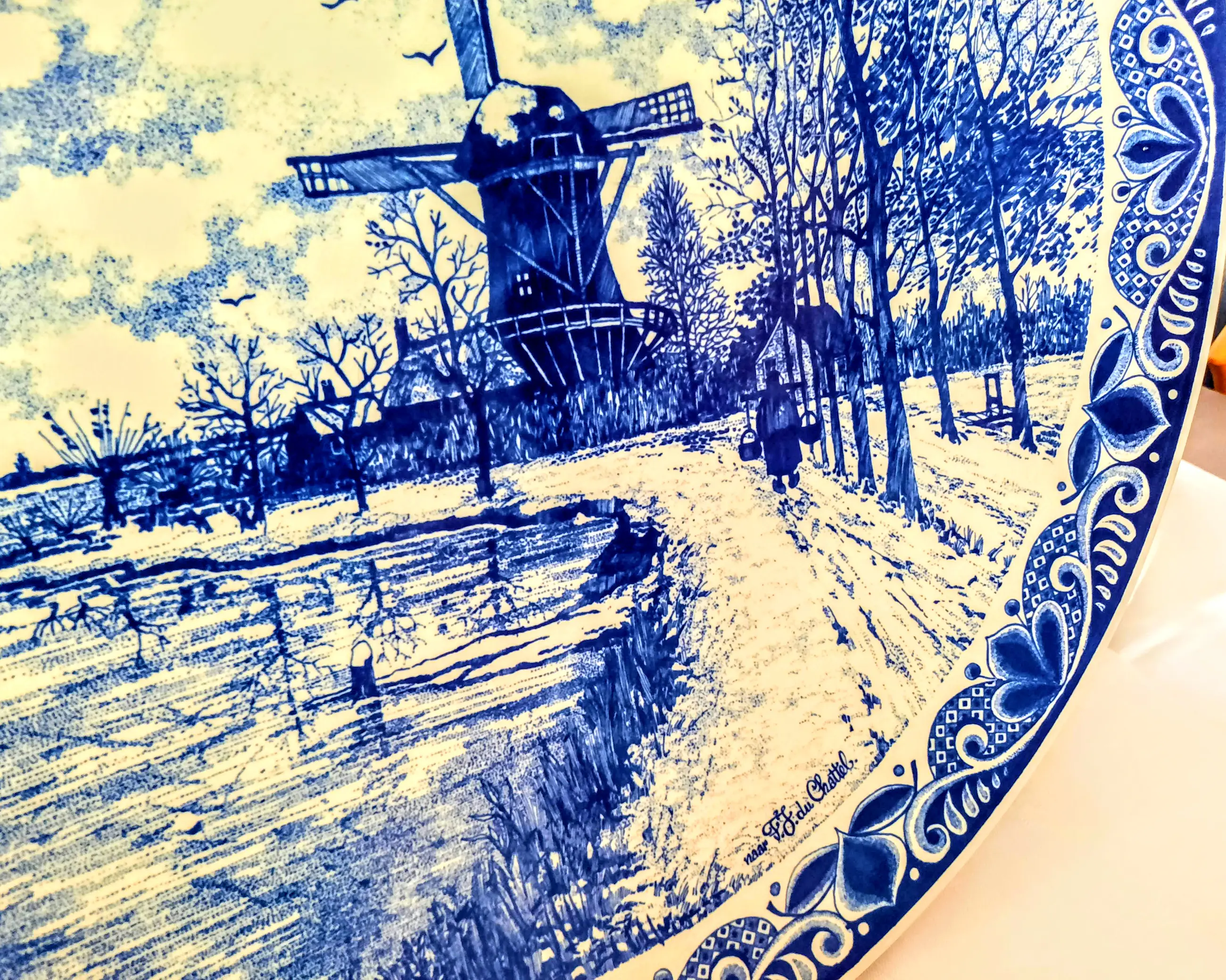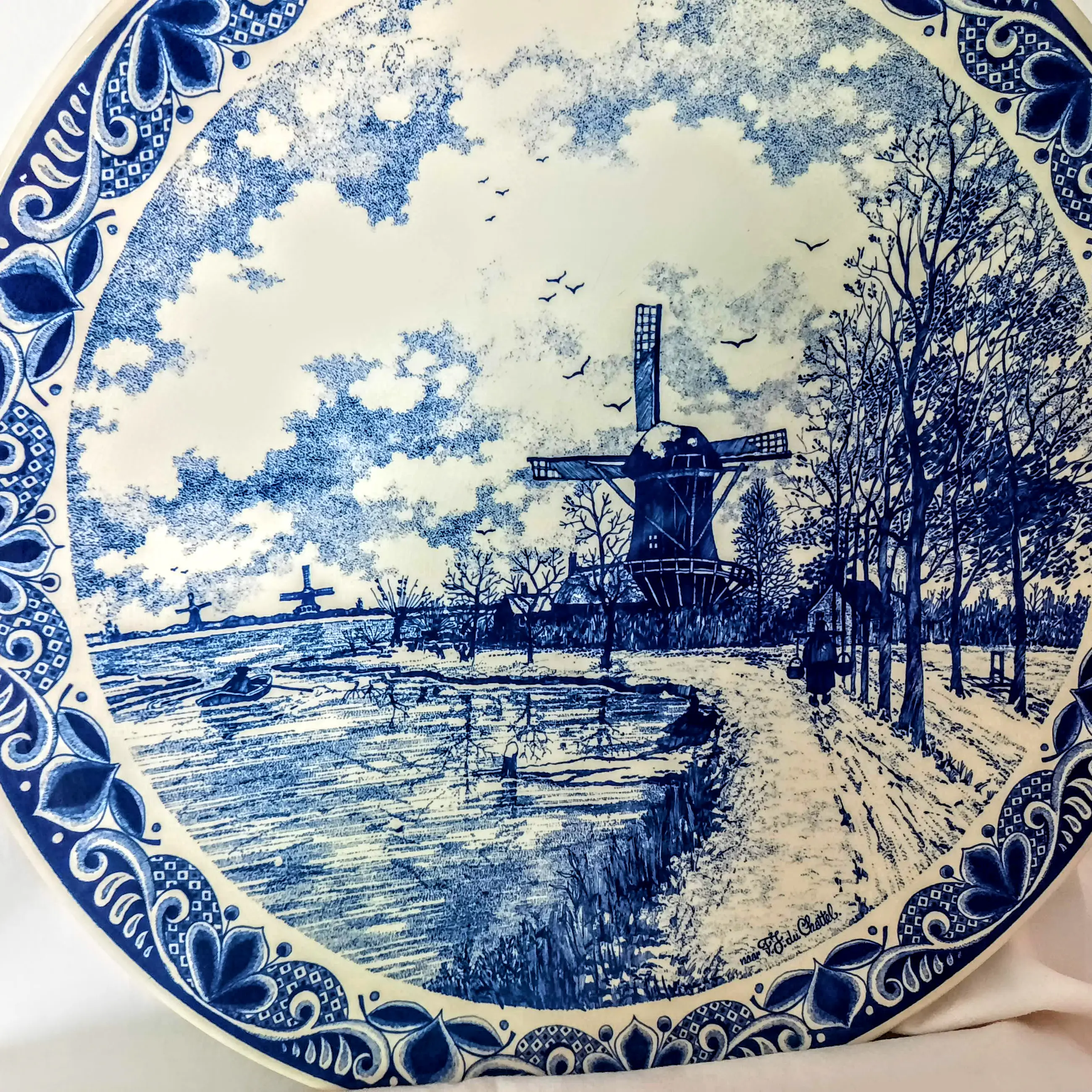 De wandplaat toont het schilderij "Windmolens in een besneeuwd landschap" van de bekende Nederlandse schilder FJ du Chattel, met signatuur.