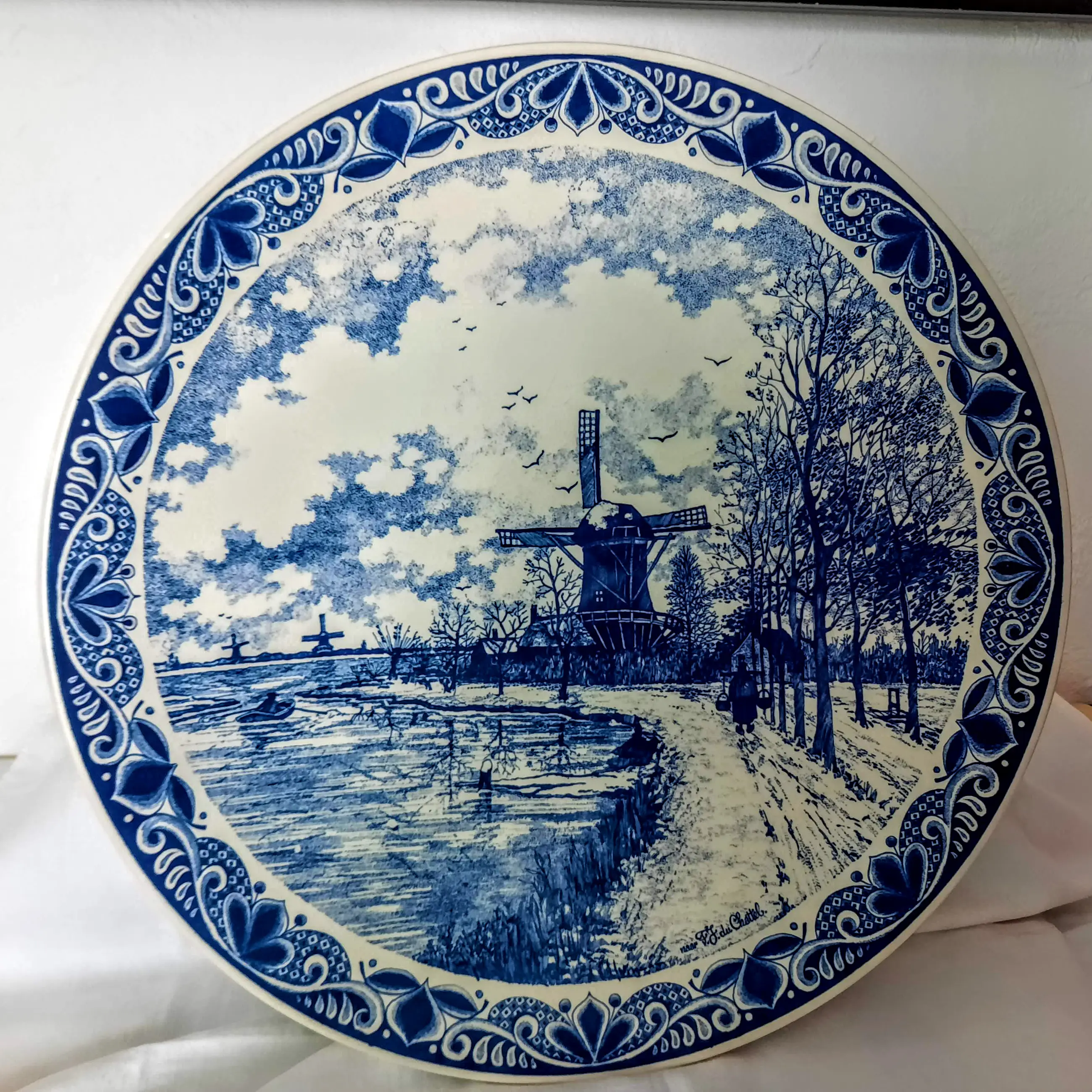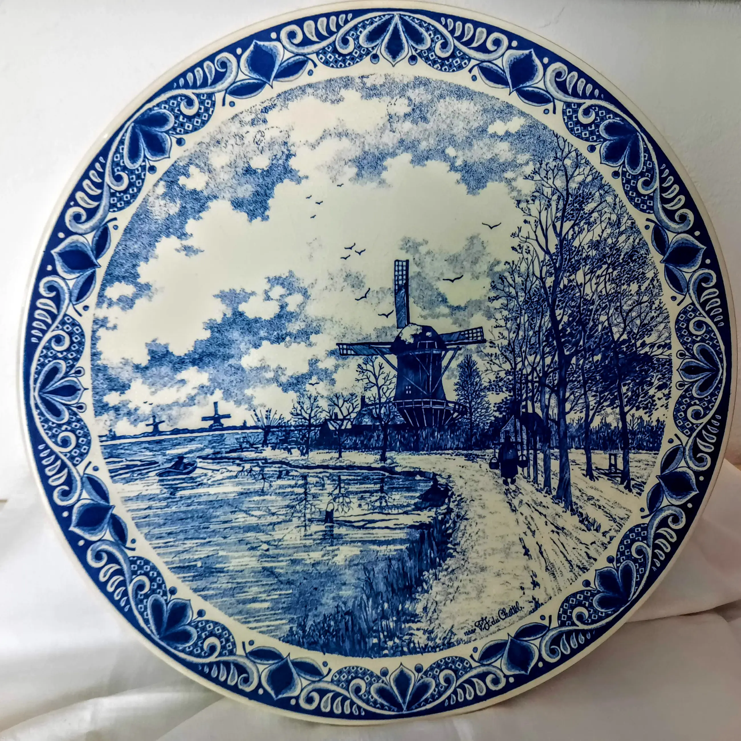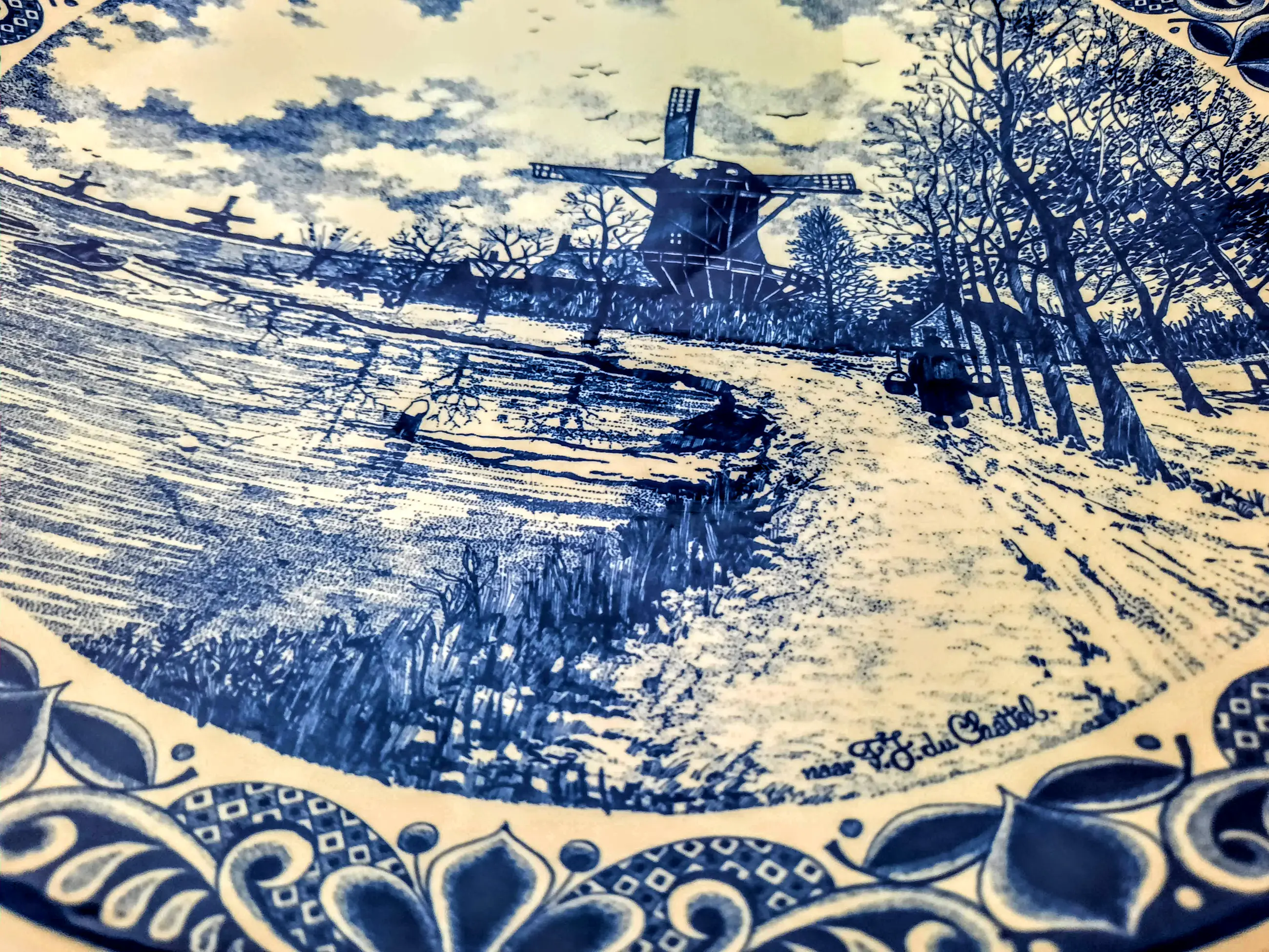 Het bord toont een prachtig winterlandschap, gebaseerd op het schilderij "Windmolens in een besneeuwd landschap" van de bekende Nederlandse schilder FJ du Schattel, met een handtekening in de rechterbenedenhoek van het bord.