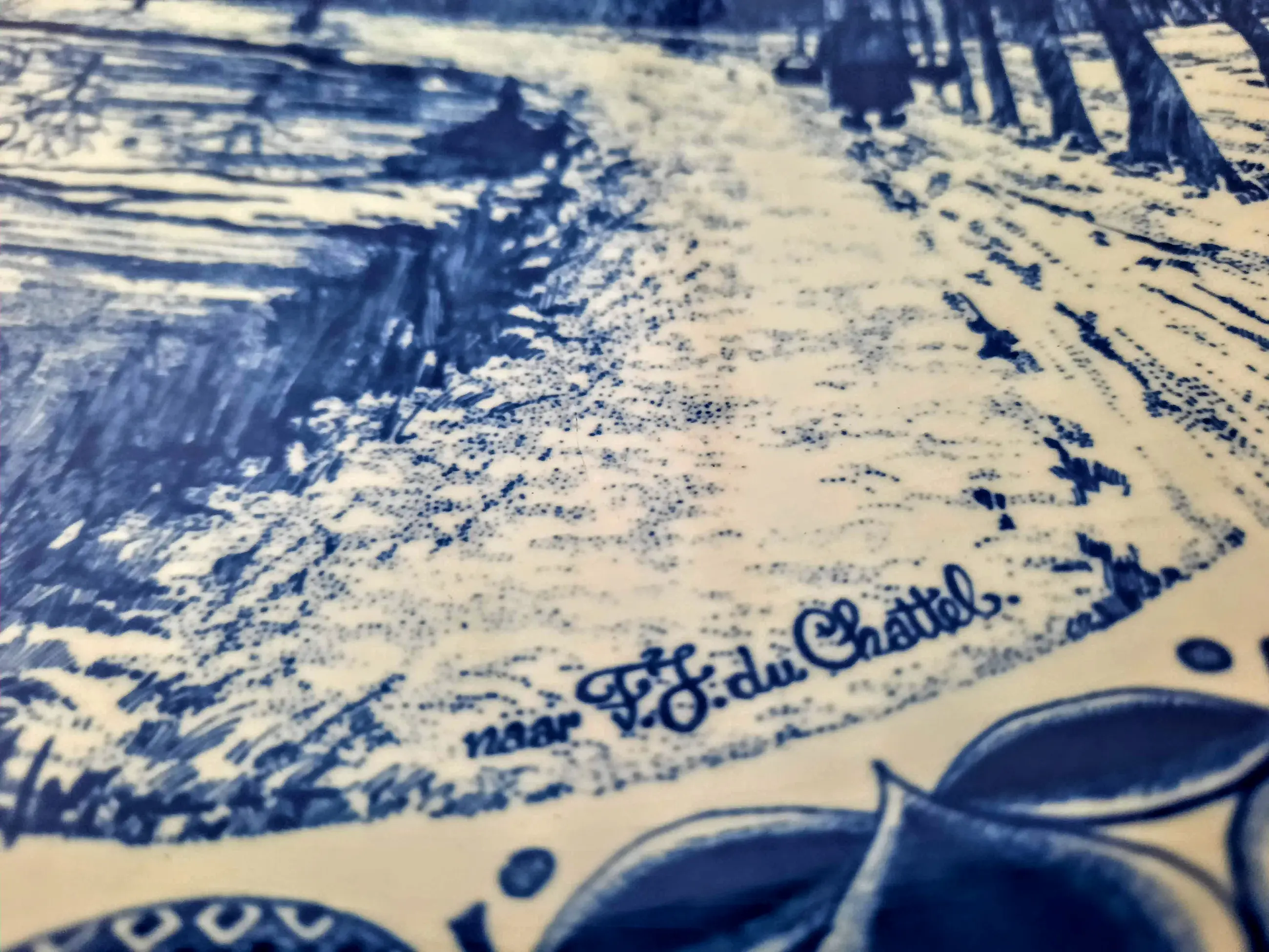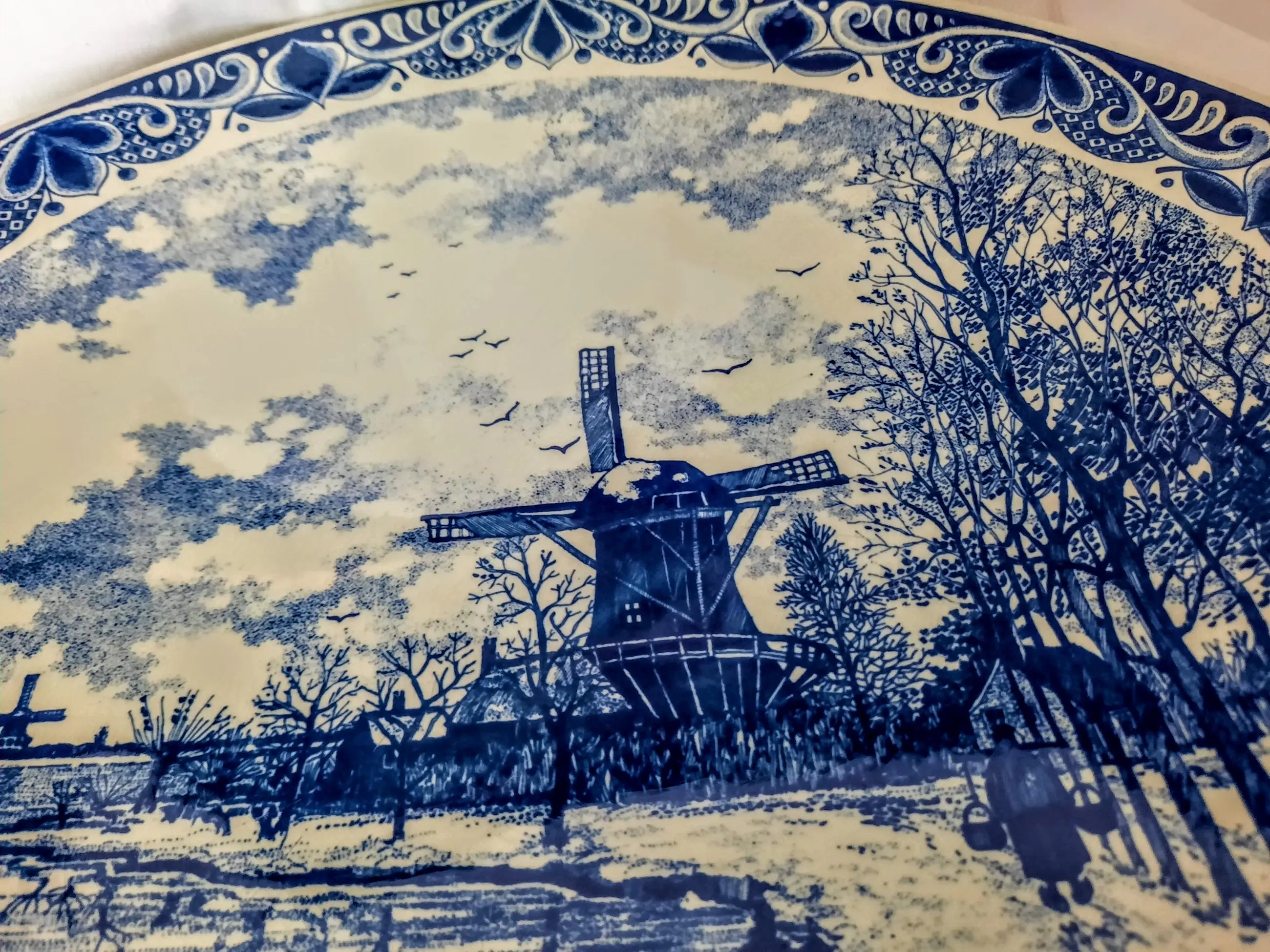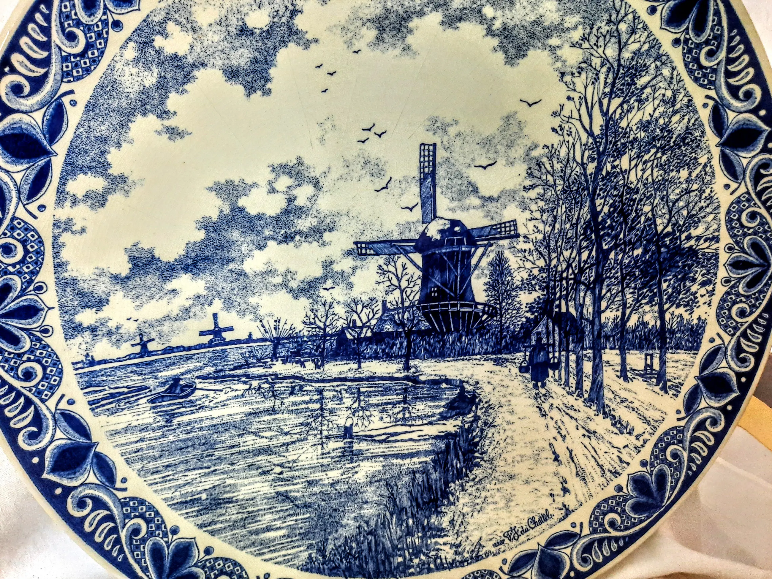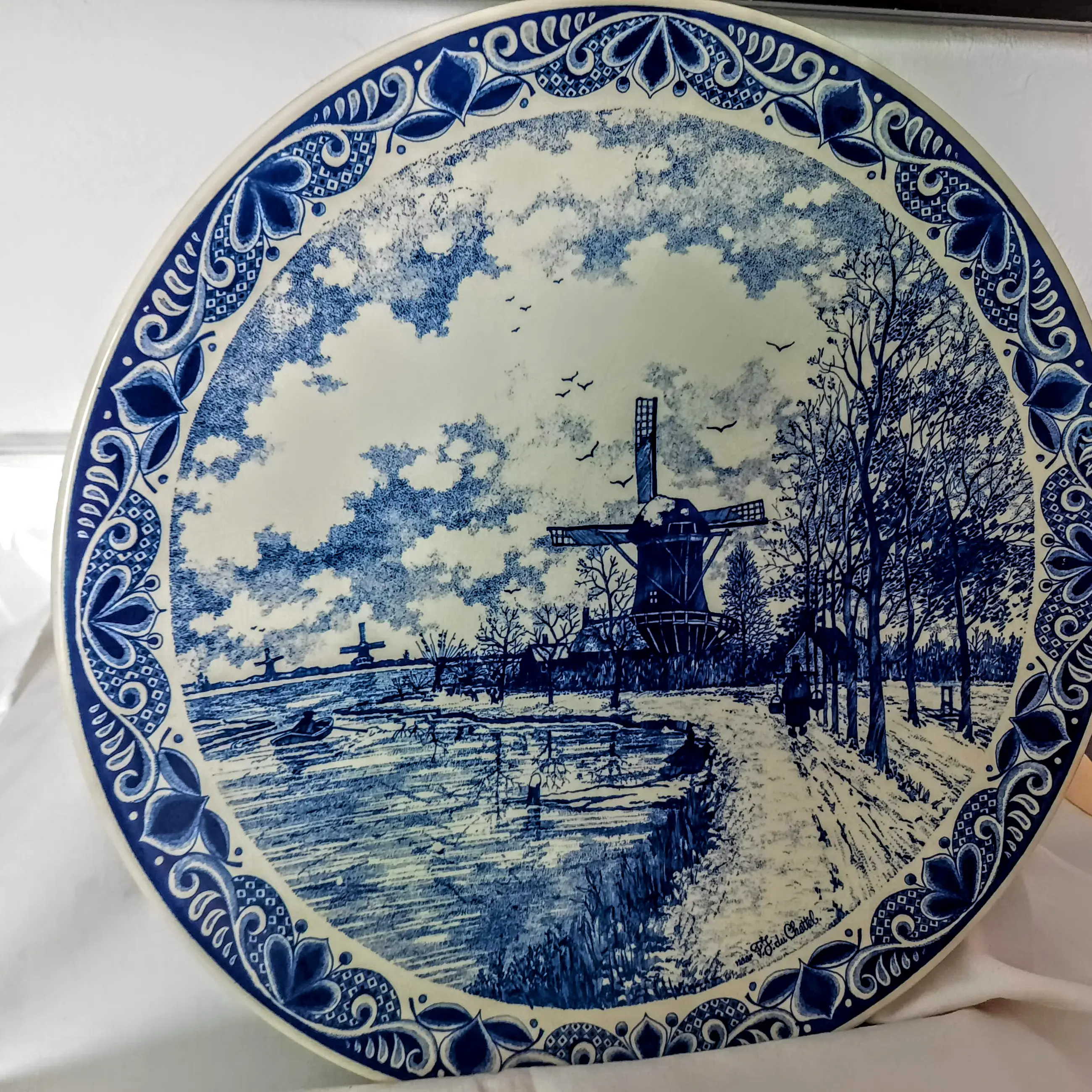 Het bord toont een prachtig winterlandschap, gebaseerd op het schilderij "Windmolens in een besneeuwd landschap" van de bekende Nederlandse schilder FJ du Schattel, met een handtekening in de rechterbenedenhoek van het bord.