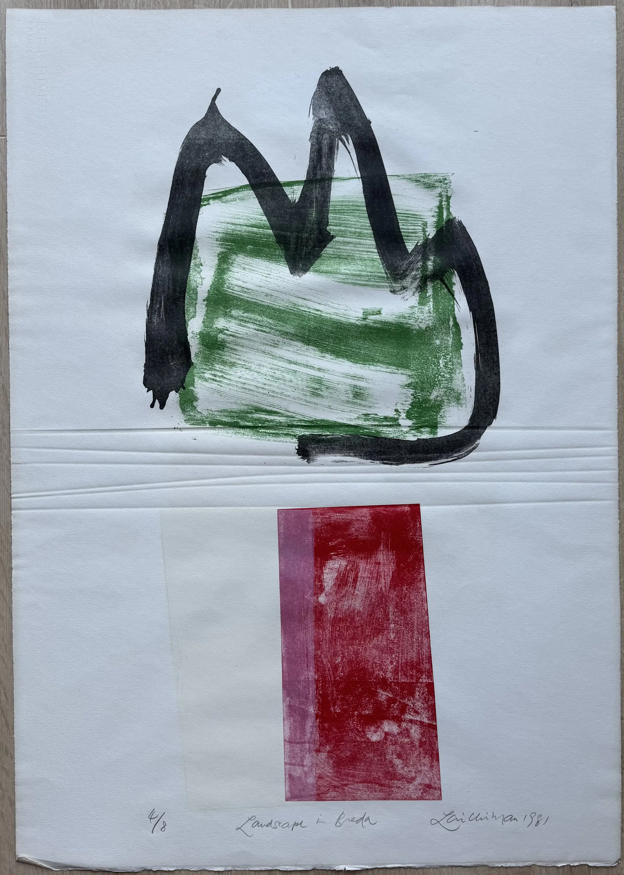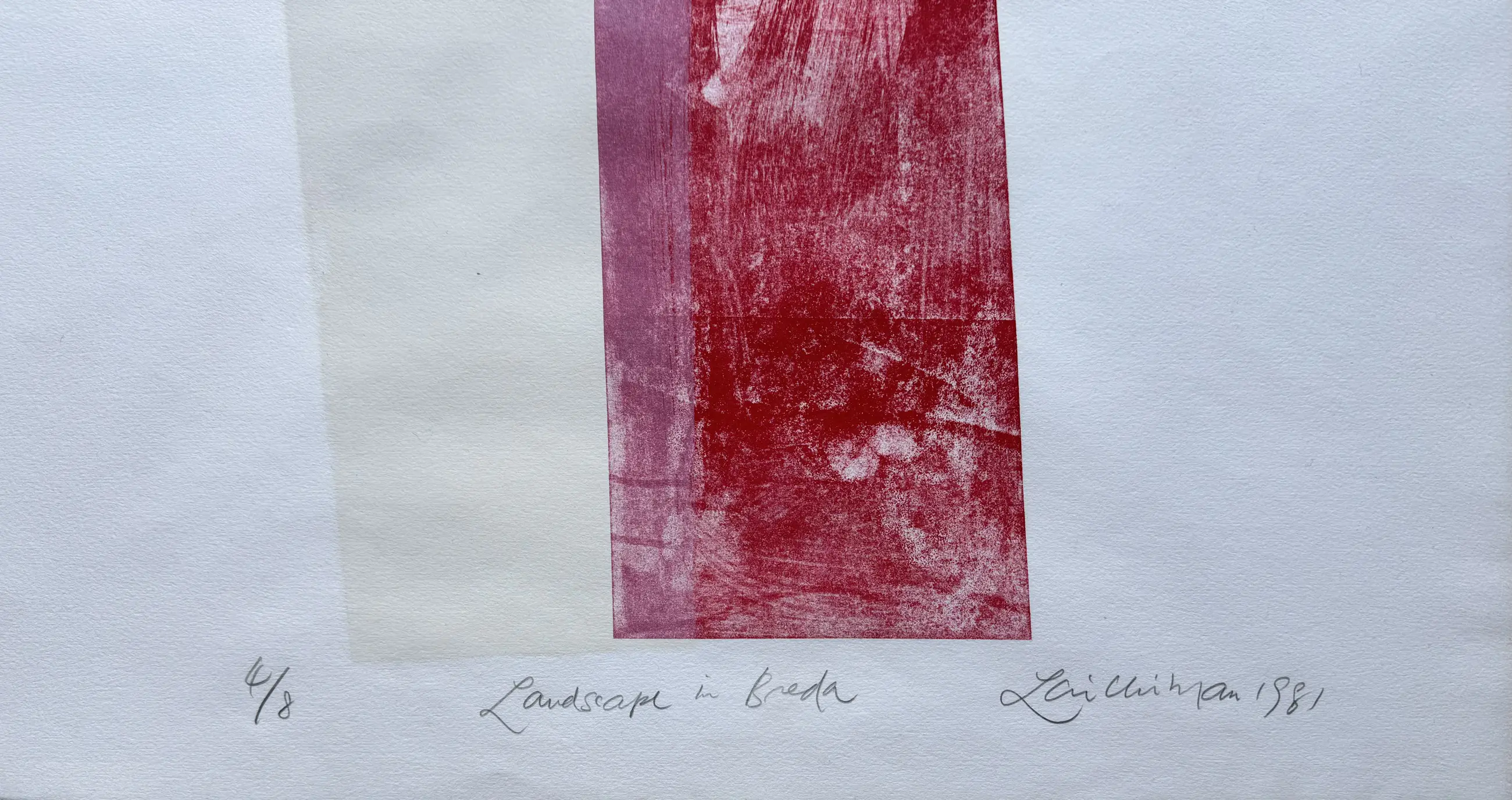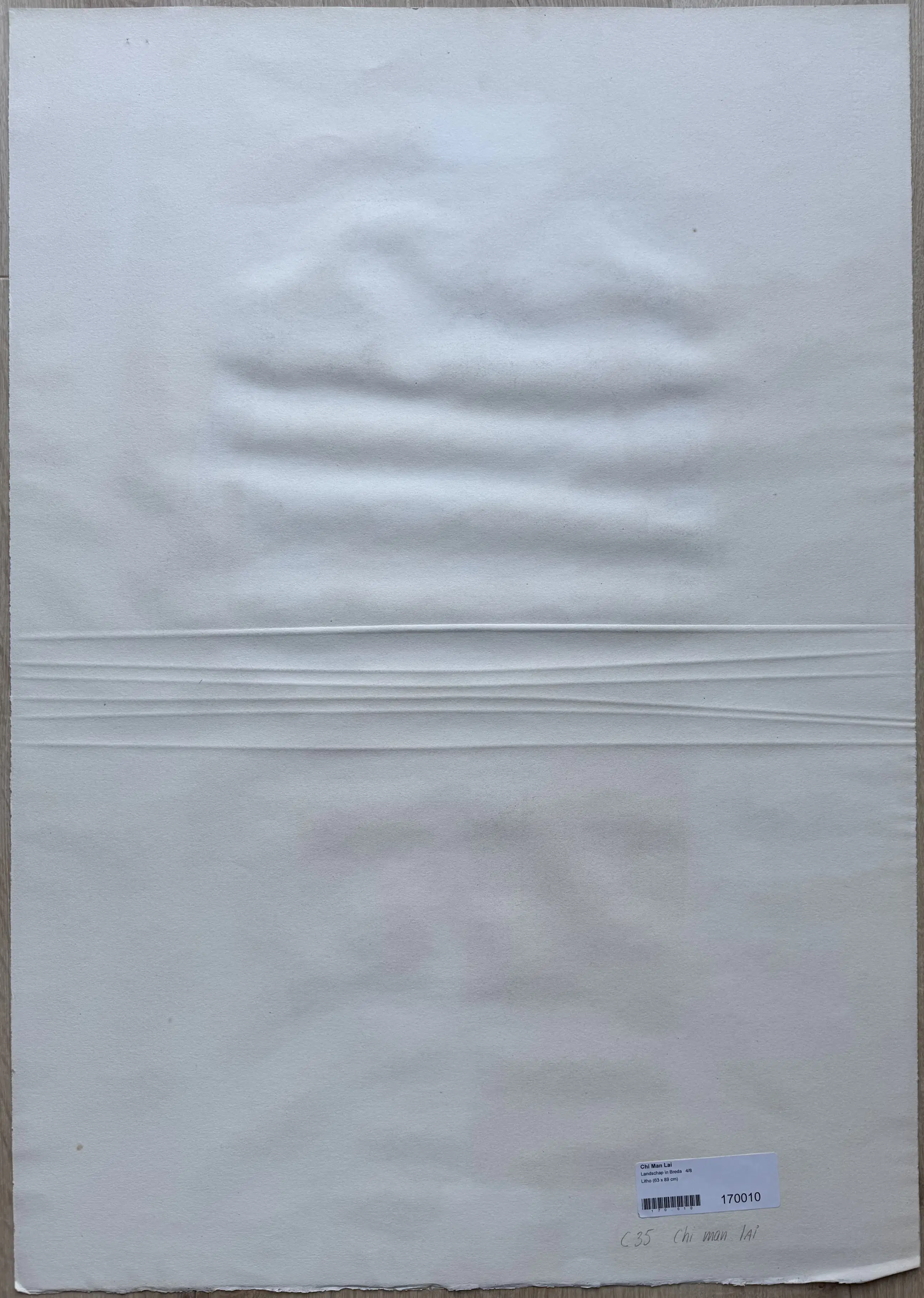 Fraaie litho van Chi Man Lai. De stroken over de breedte zijn blinddruk/preegdruk, een techniek die de kunstenaar vaker in zijn werk gebruikt.
