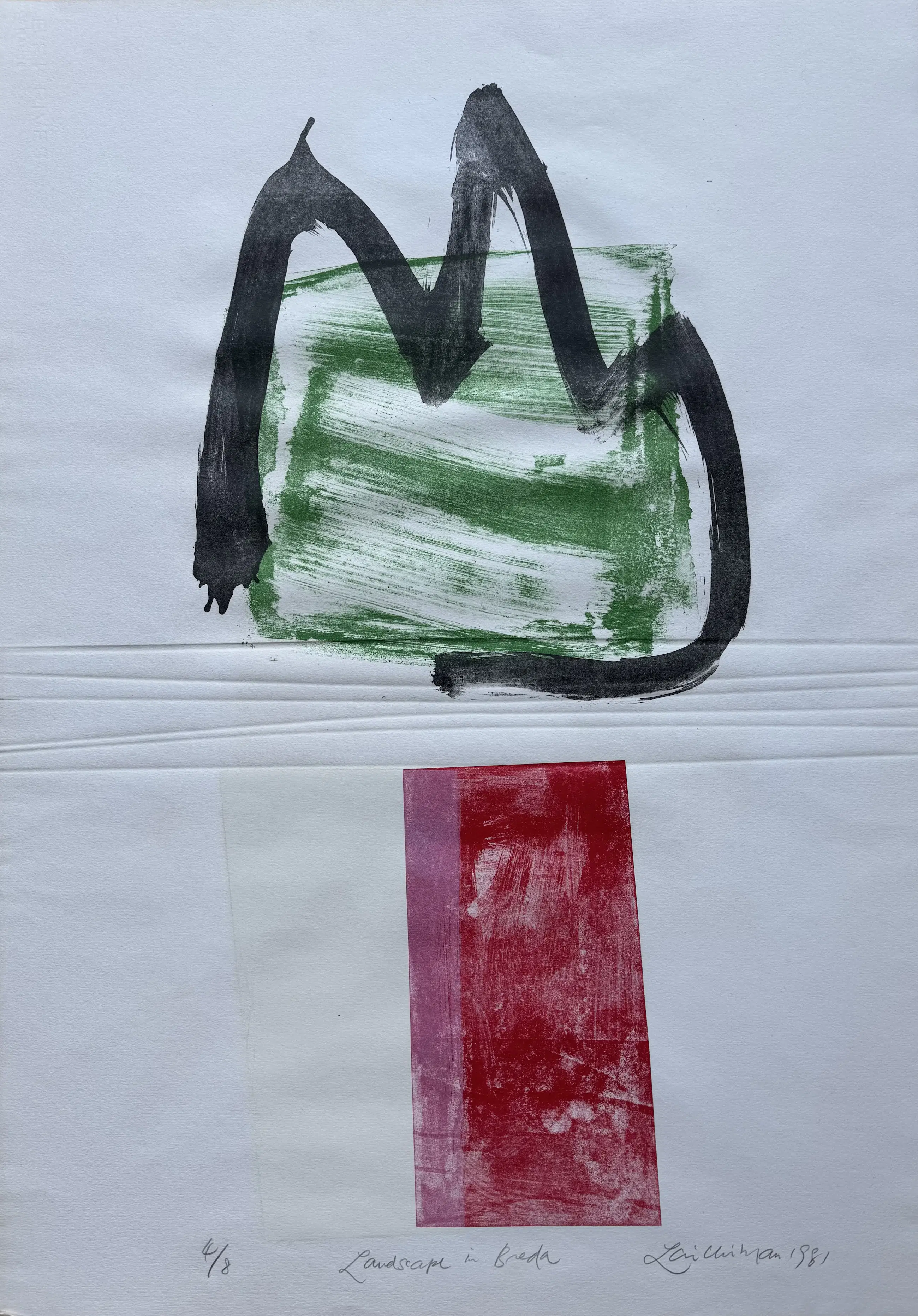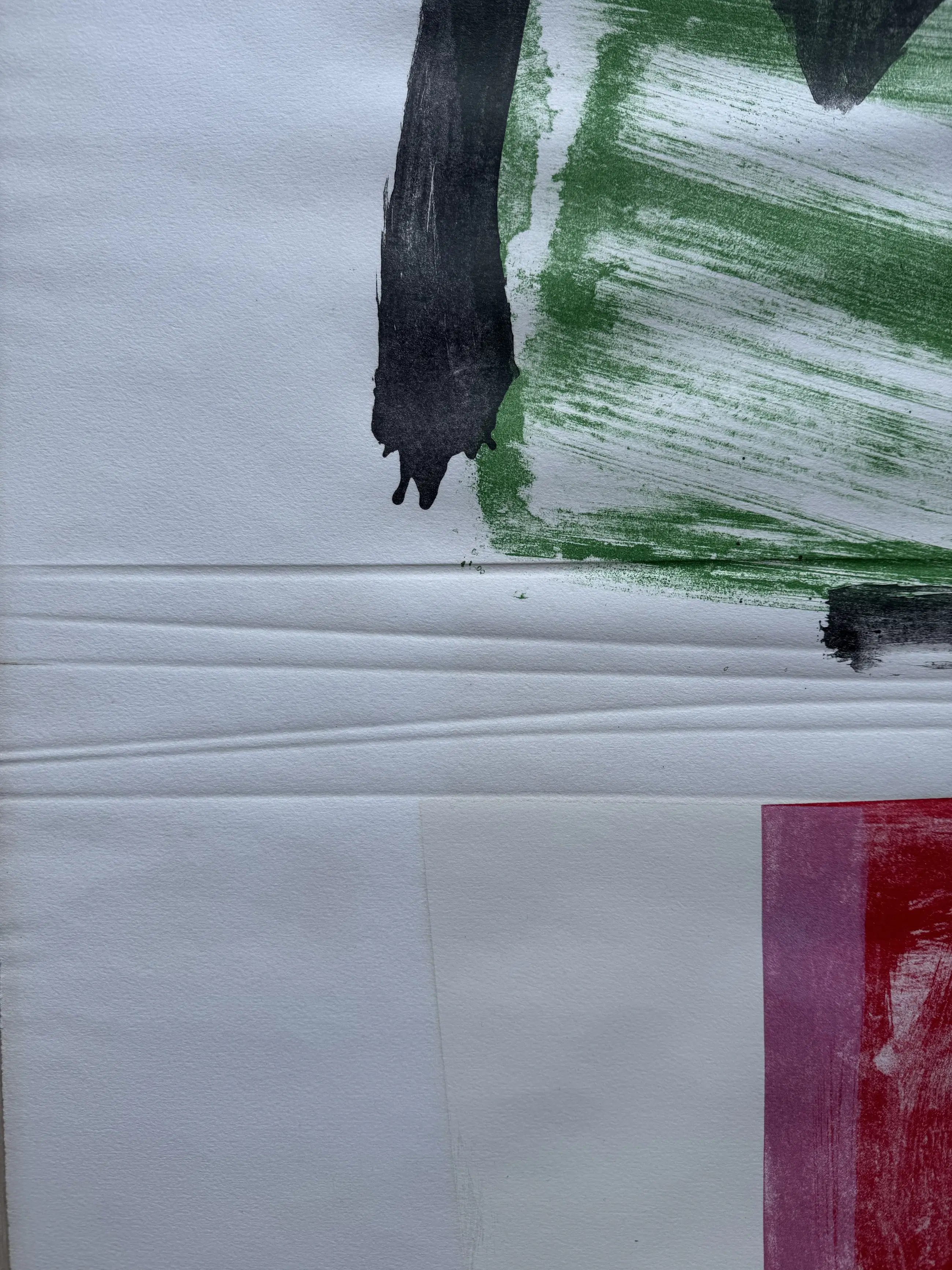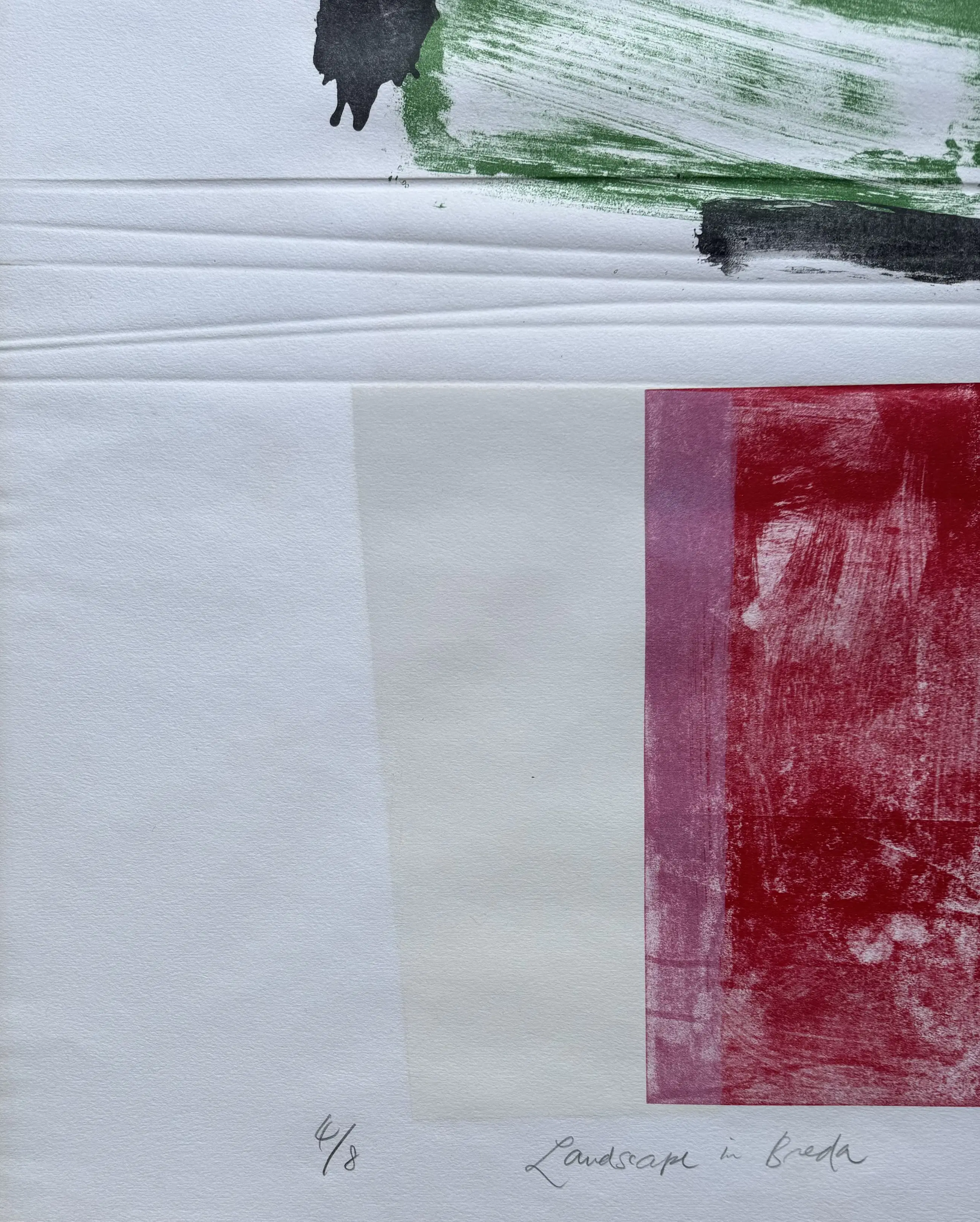 Fraaie litho van Chi Man Lai. De stroken over de breedte zijn blinddruk/preegdruk, een techniek die de kunstenaar vaker in zijn werk gebruikt.