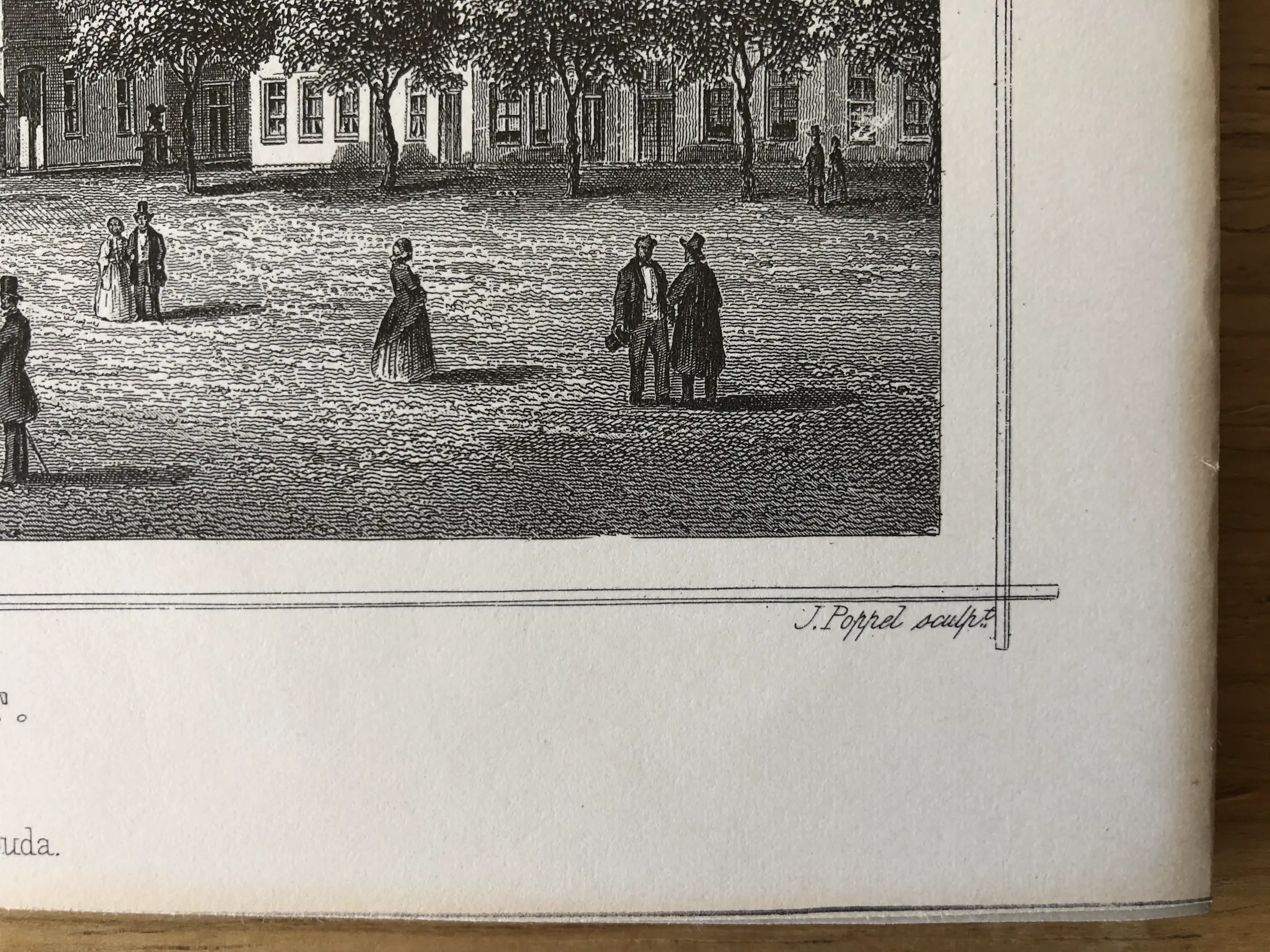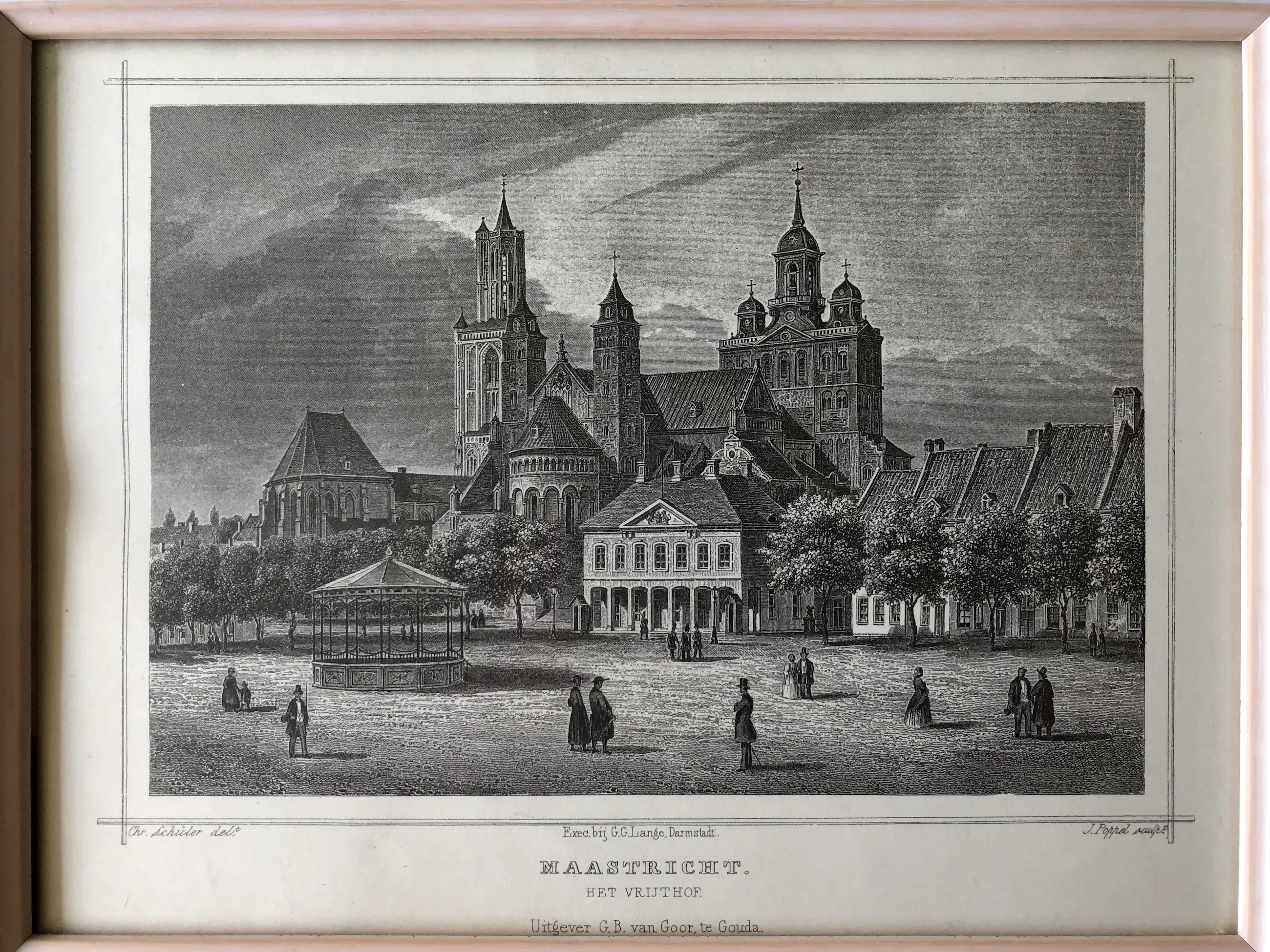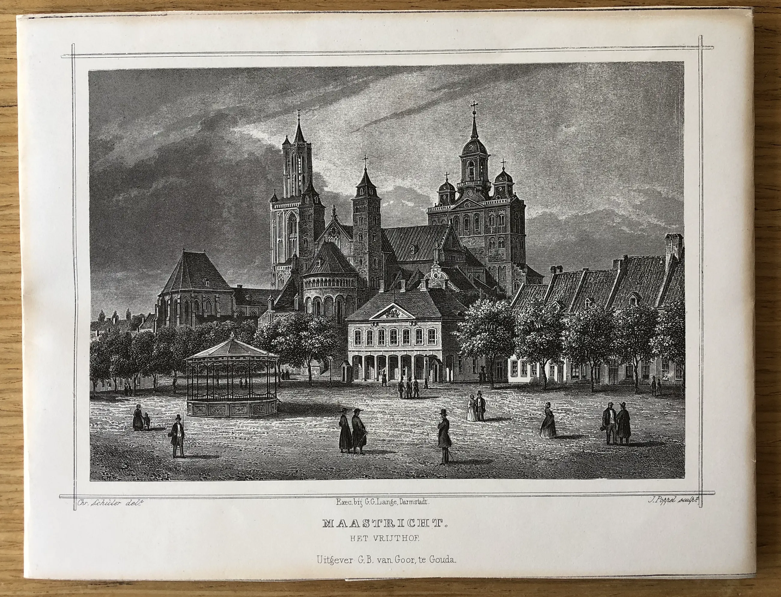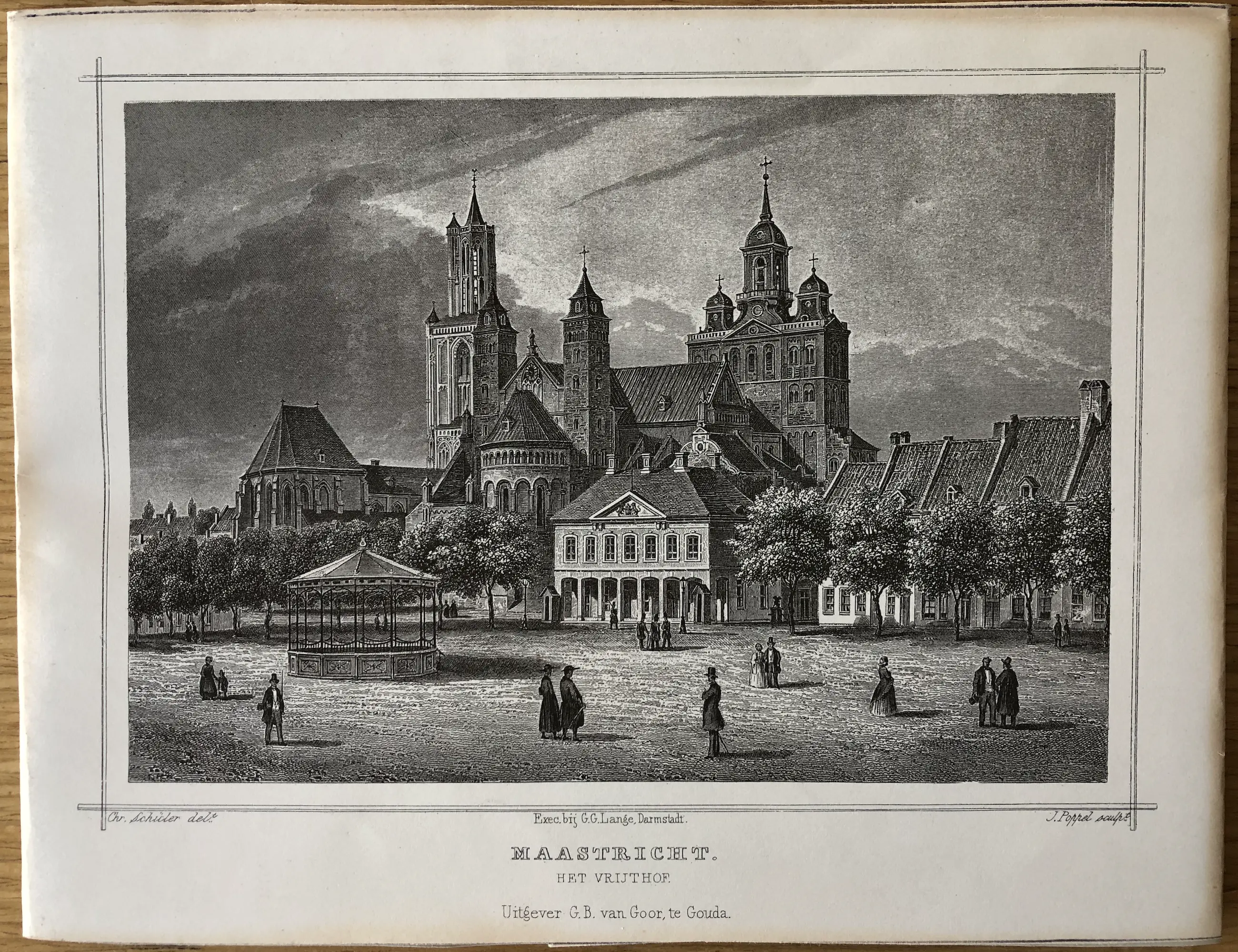 Originele staalgravure door J. Poppel naar een tekening van Chr. Schüler. Uitgegeven in 1858 te Gouda door Gerrit Benjamin van Goor in 'Het koningrijk der Nederlanden, voorgesteld in eene reeks van naar de natuur geteekende schilderachtige gezigten,' Johannes Leonardus Terwen.