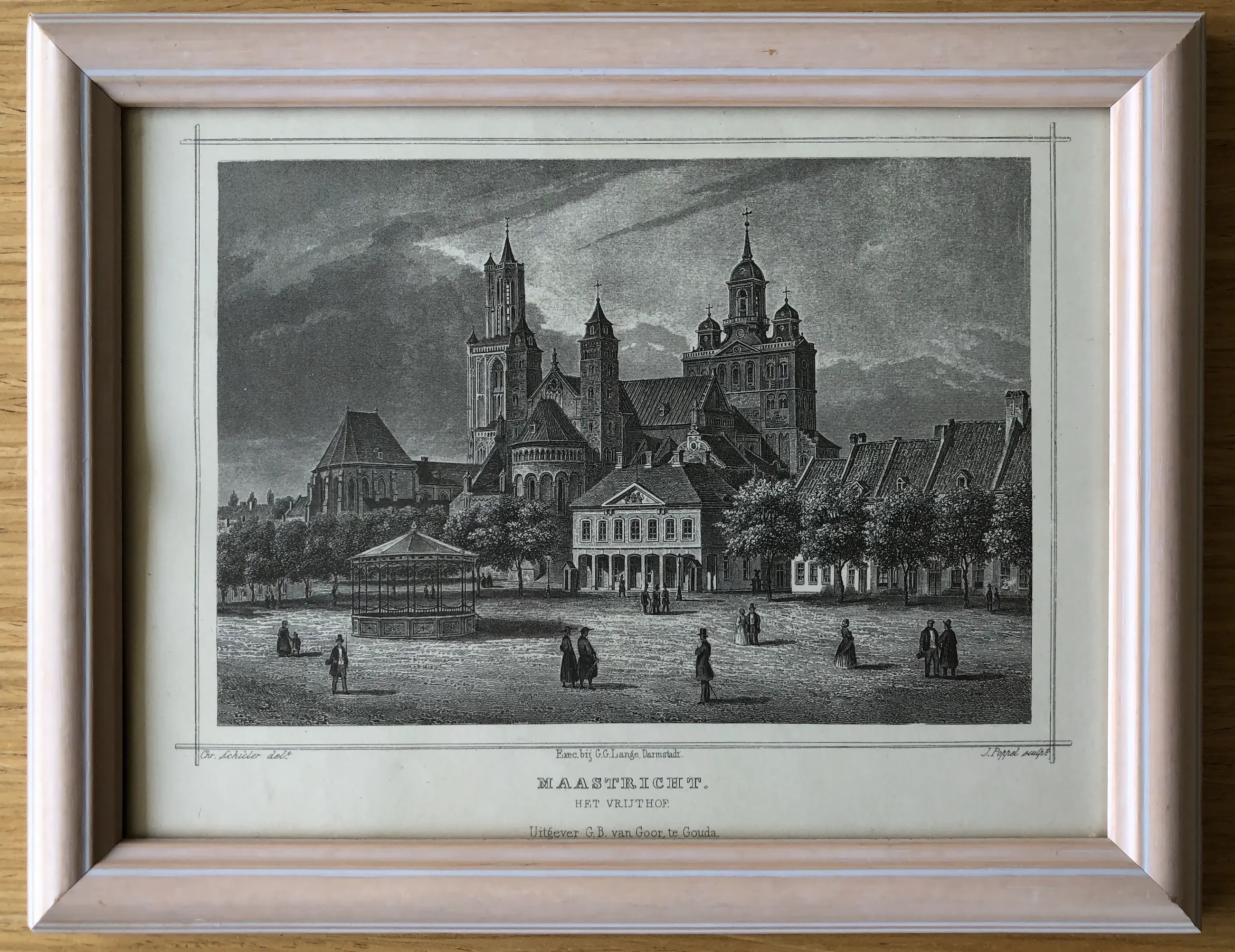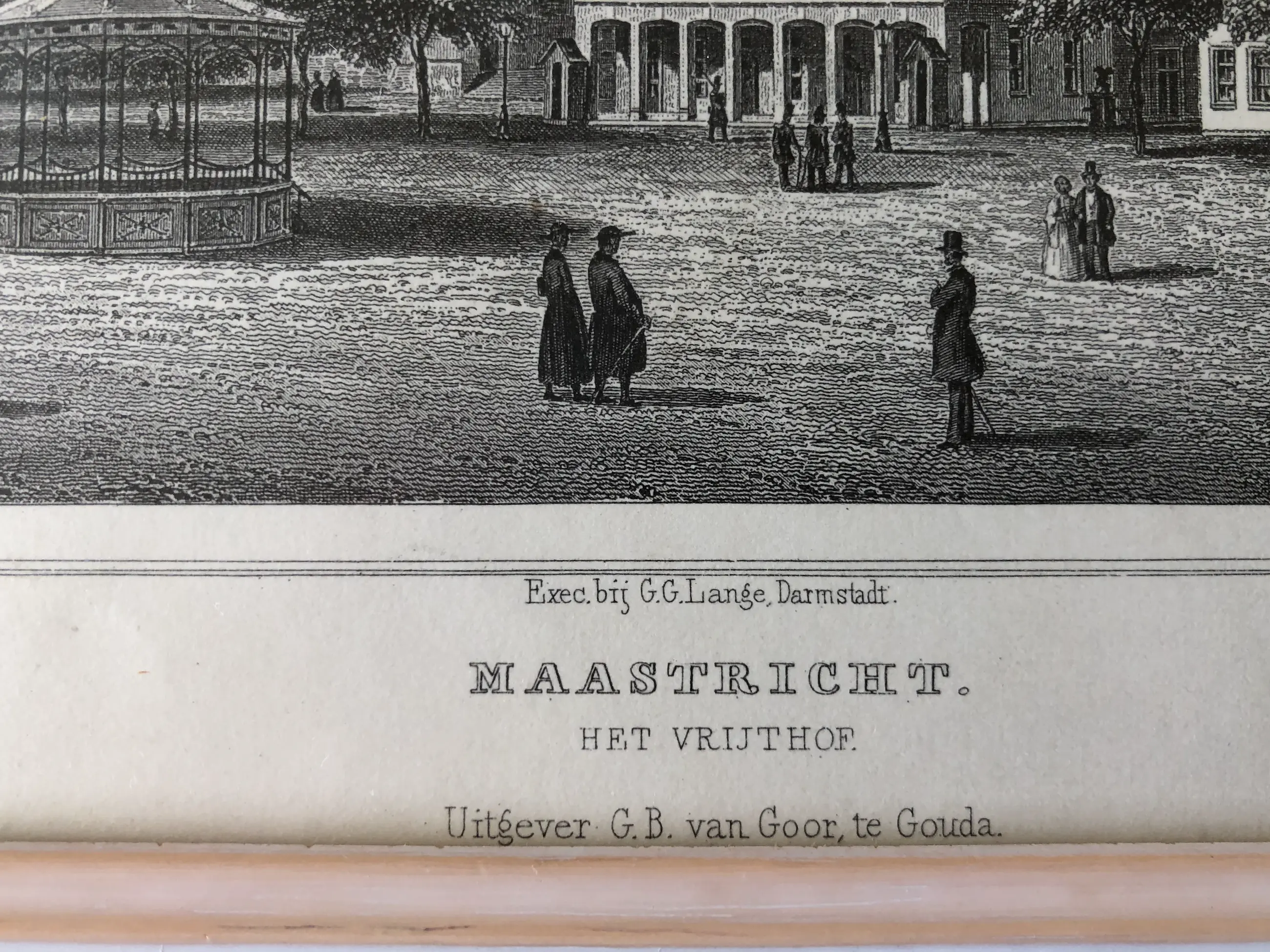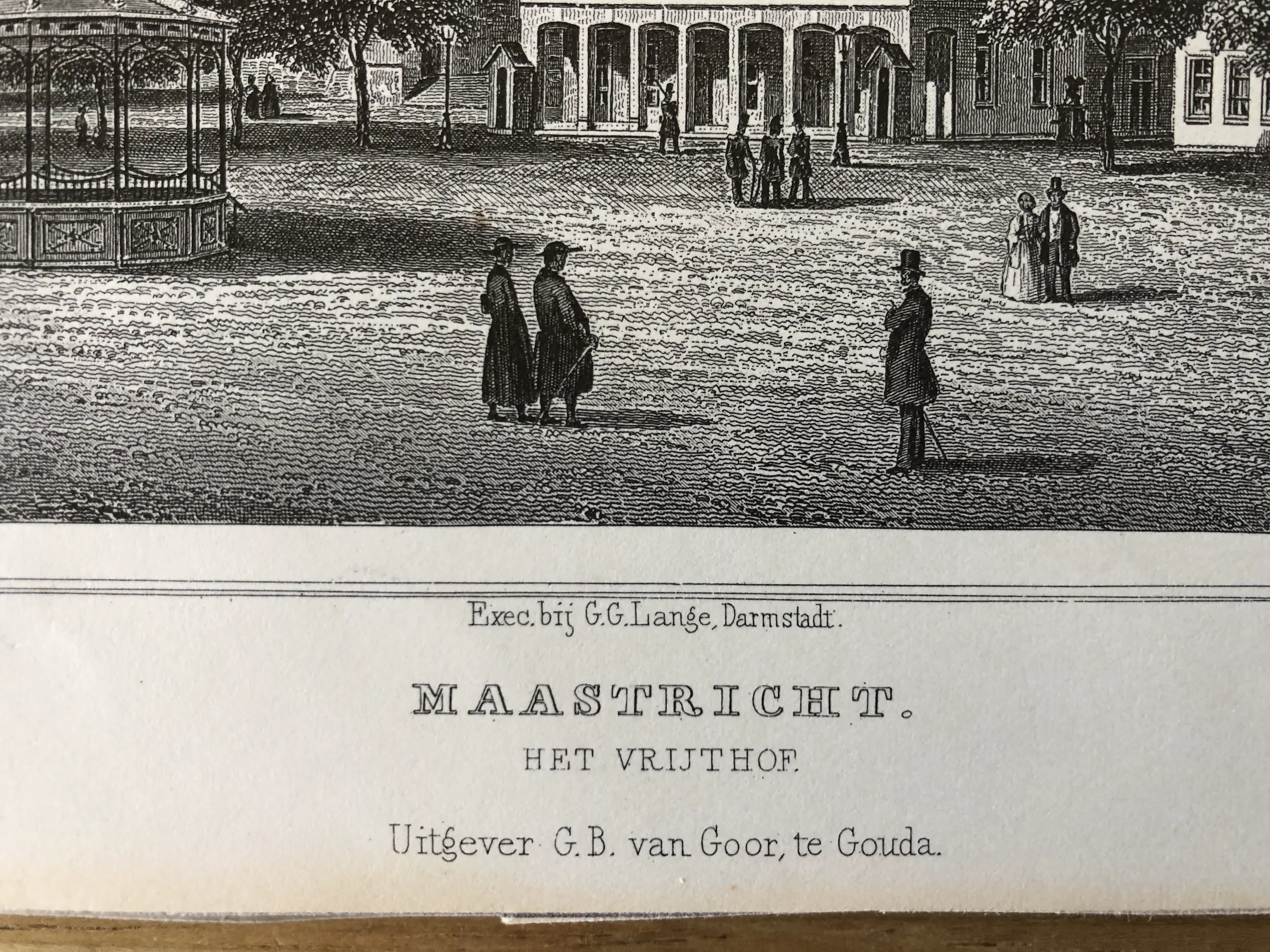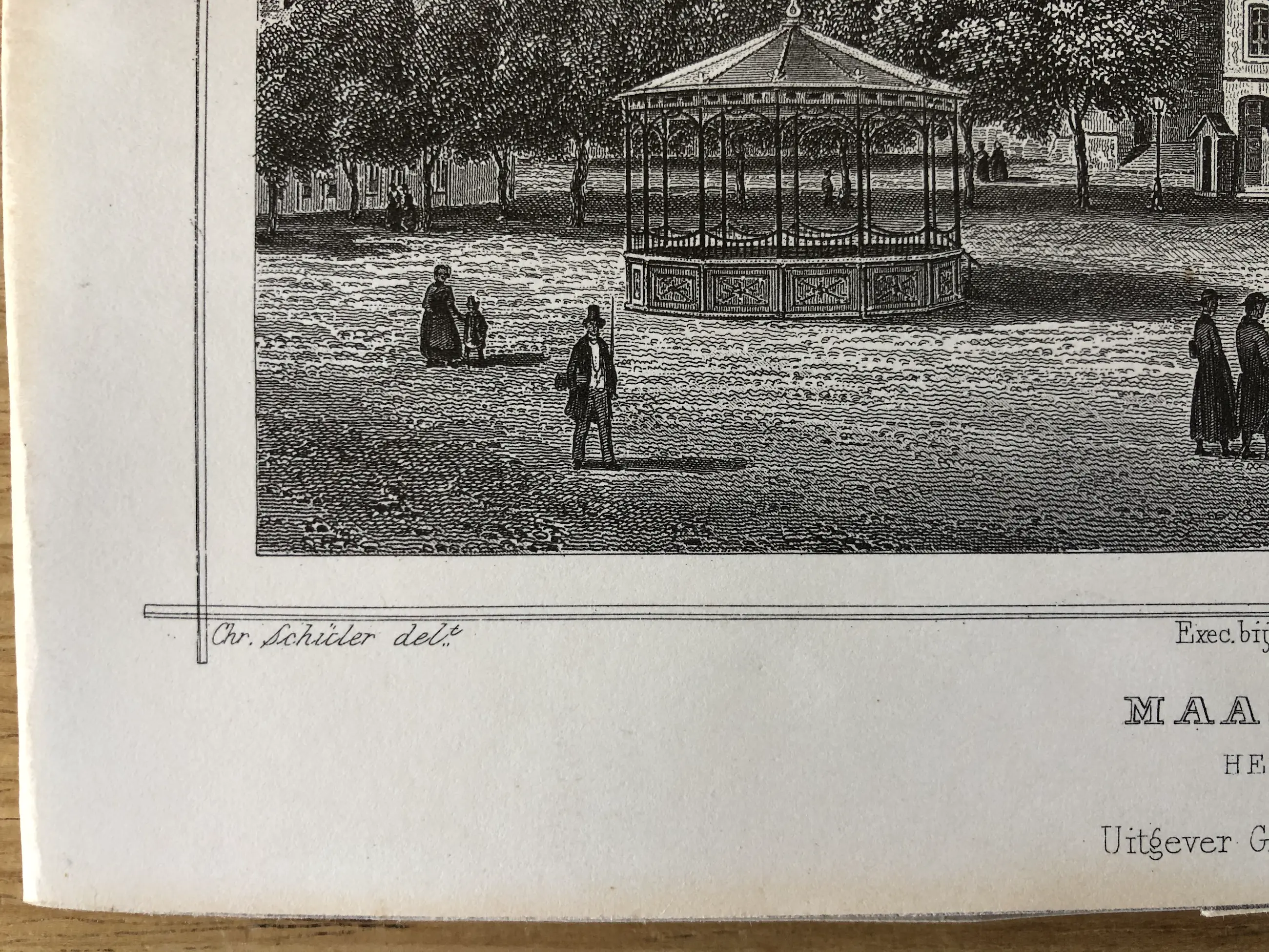 Originele staalgravure door J. Poppel naar een tekening van Chr. Schüler. Uitgegeven in 1858 te Gouda door Gerrit Benjamin van Goor in 'Het koningrijk der Nederlanden, voorgesteld in eene reeks van naar de natuur geteekende schilderachtige gezigten,' Johannes Leonardus Terwen.