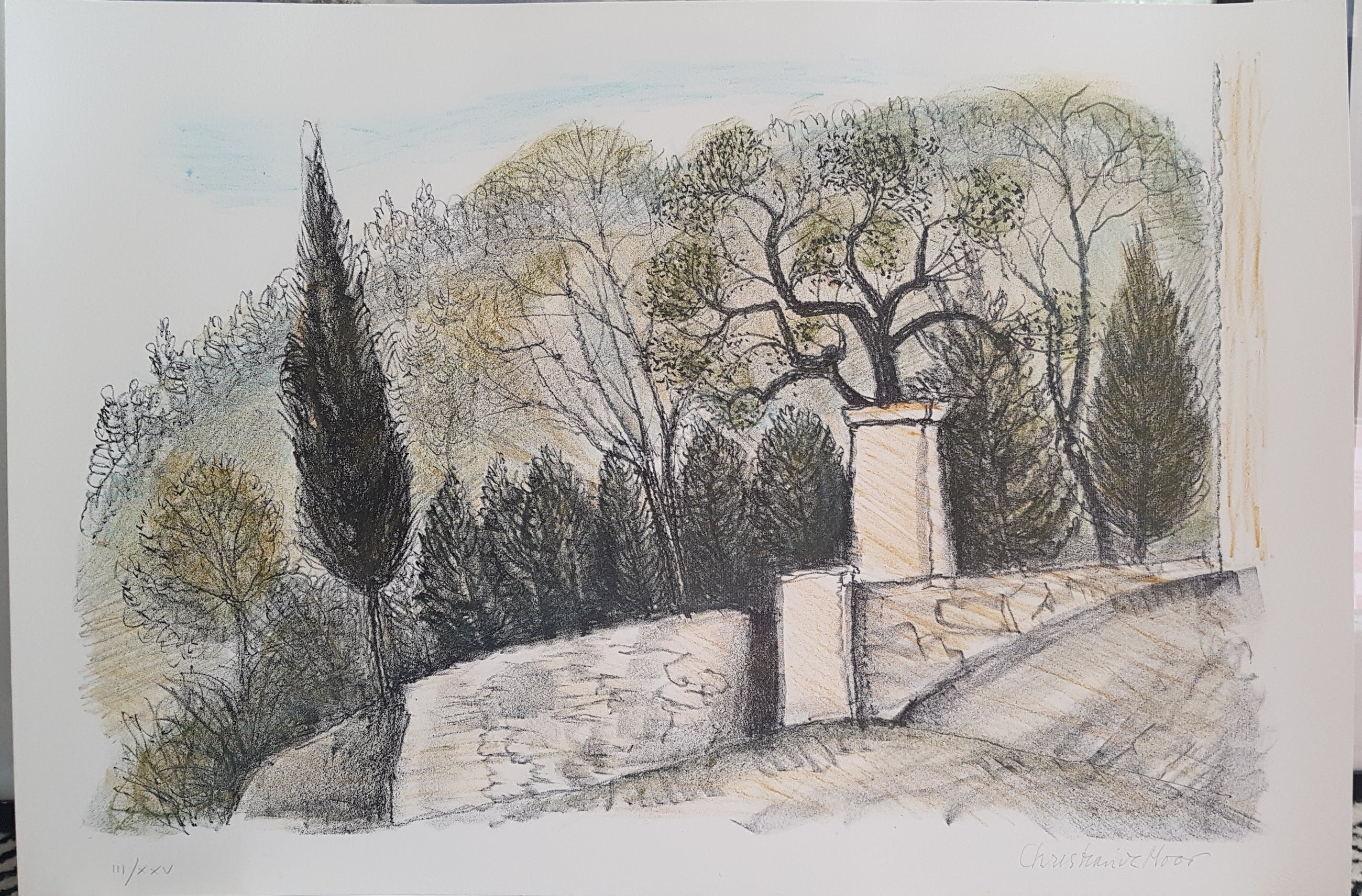 Fraaie handgesigneerde lithografie van Chris de Moor. Titel: Landschap. Genummerd II/XXV. Afmetingen: 45 x 66 cm.