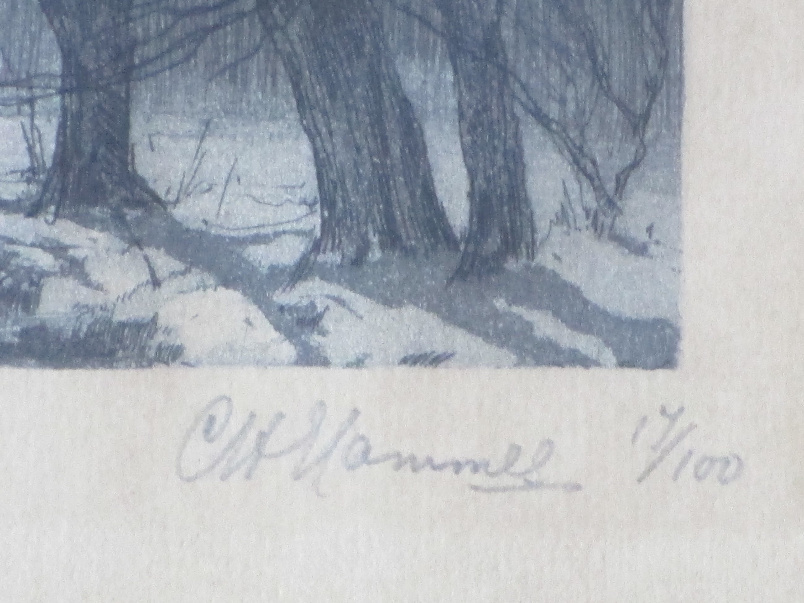 Fraaie ets door Chris HammesVoorstelling van een sneeuwlandschap bij avondGelijst, beeldmaat 10x22, lijstmaat 24x32Gesigneerd en genummerd in potlood r.o. ' CH Hammes 17/100' Authenticiteit volledig gegarandeerd