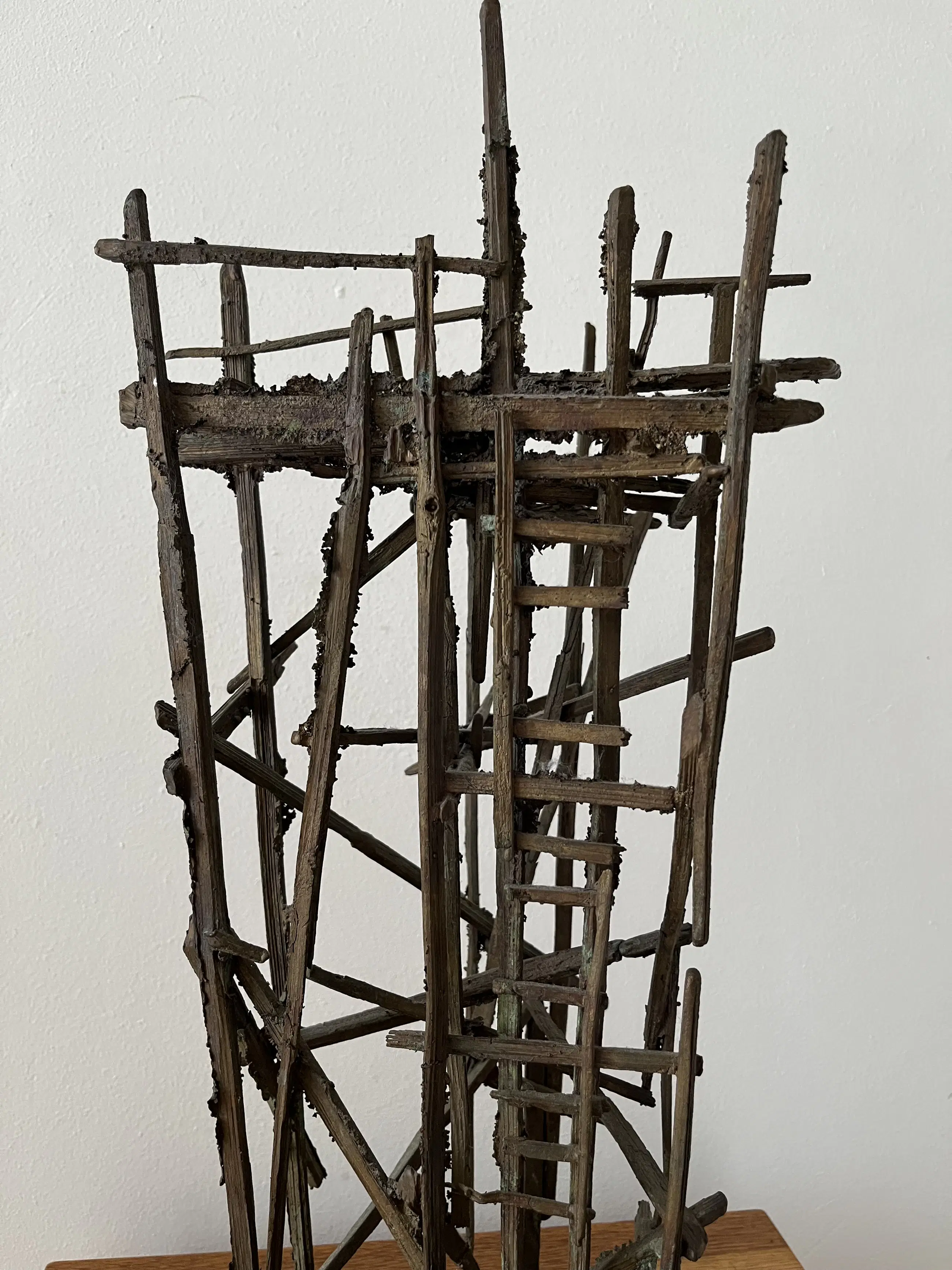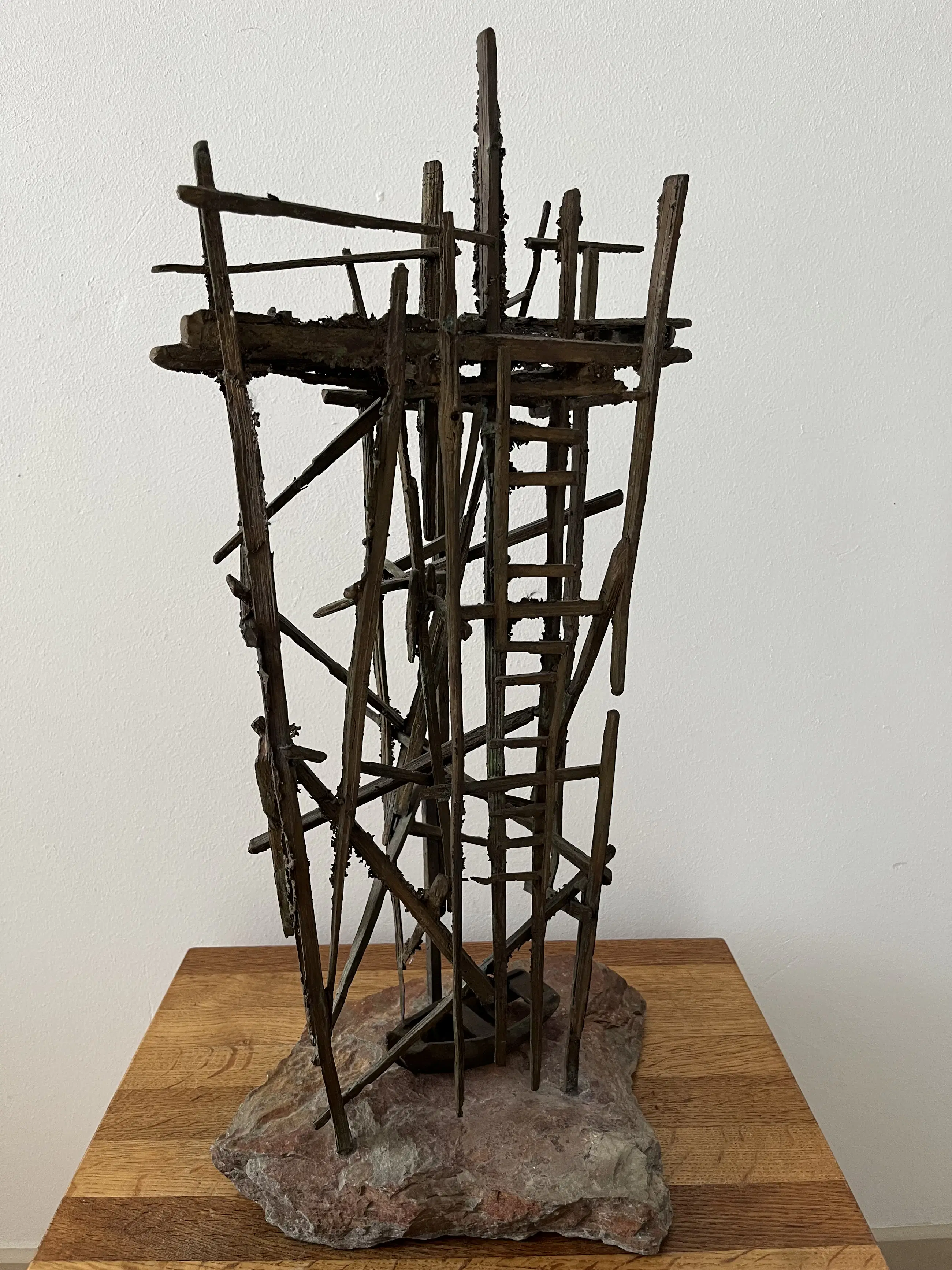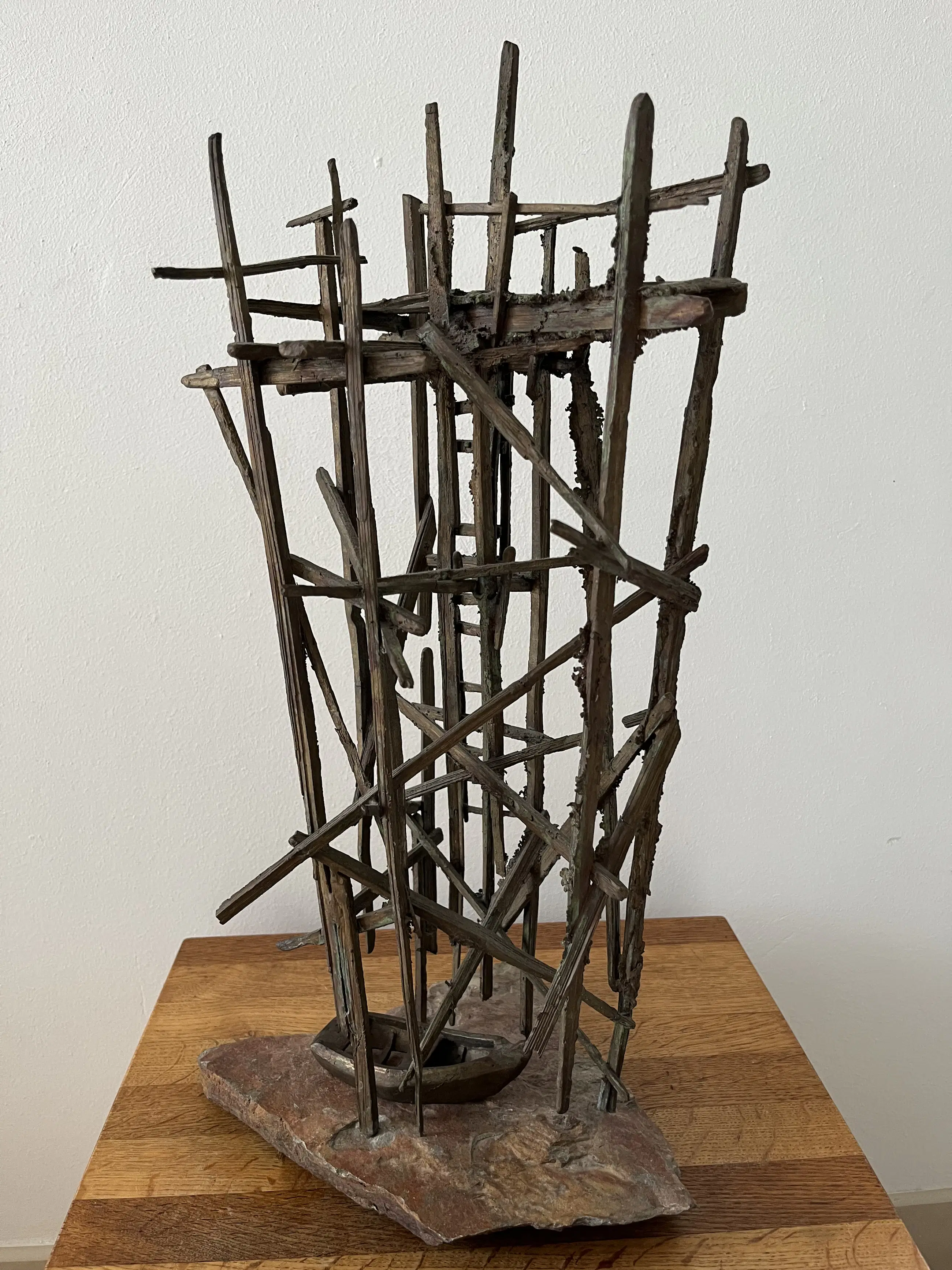 Bijzonder fraaie weergave van een oude, vervallen steiger bij een plaatsje aan de noordoostkust van Bretagne. Het kunstwerk is eerst in gespleten hout uitgevoerd en daarna in brons afgegoten. Het is een uniek exemplaar. De kunstenaar heeft er een echtheidsverklaring + foto bijgevoegd. Afmeting steiger 50x 15 x 11 cm. Afmeting roodstenen voet 4 x 29 x 21 cm. Totale hoogte 54 cm.