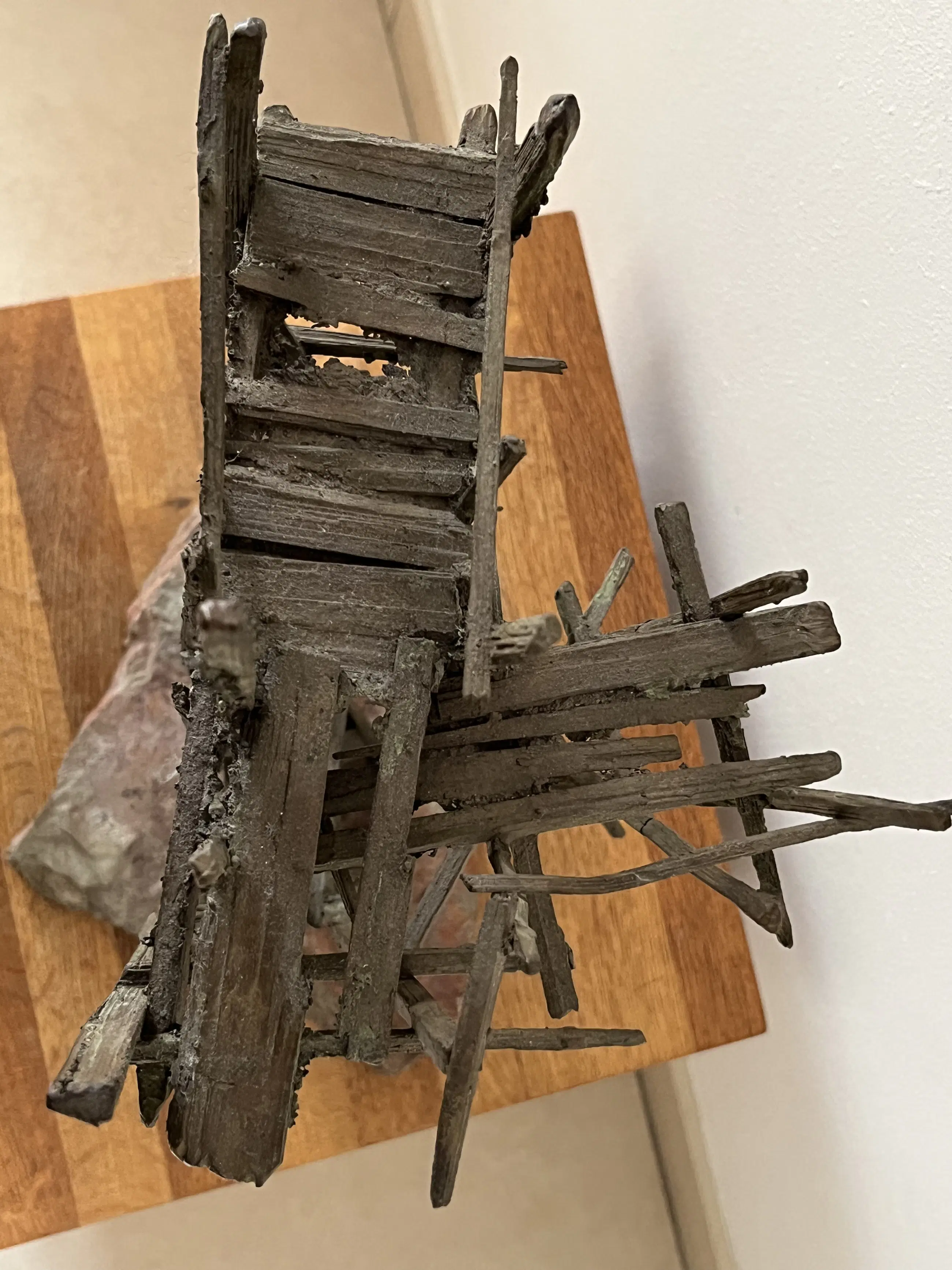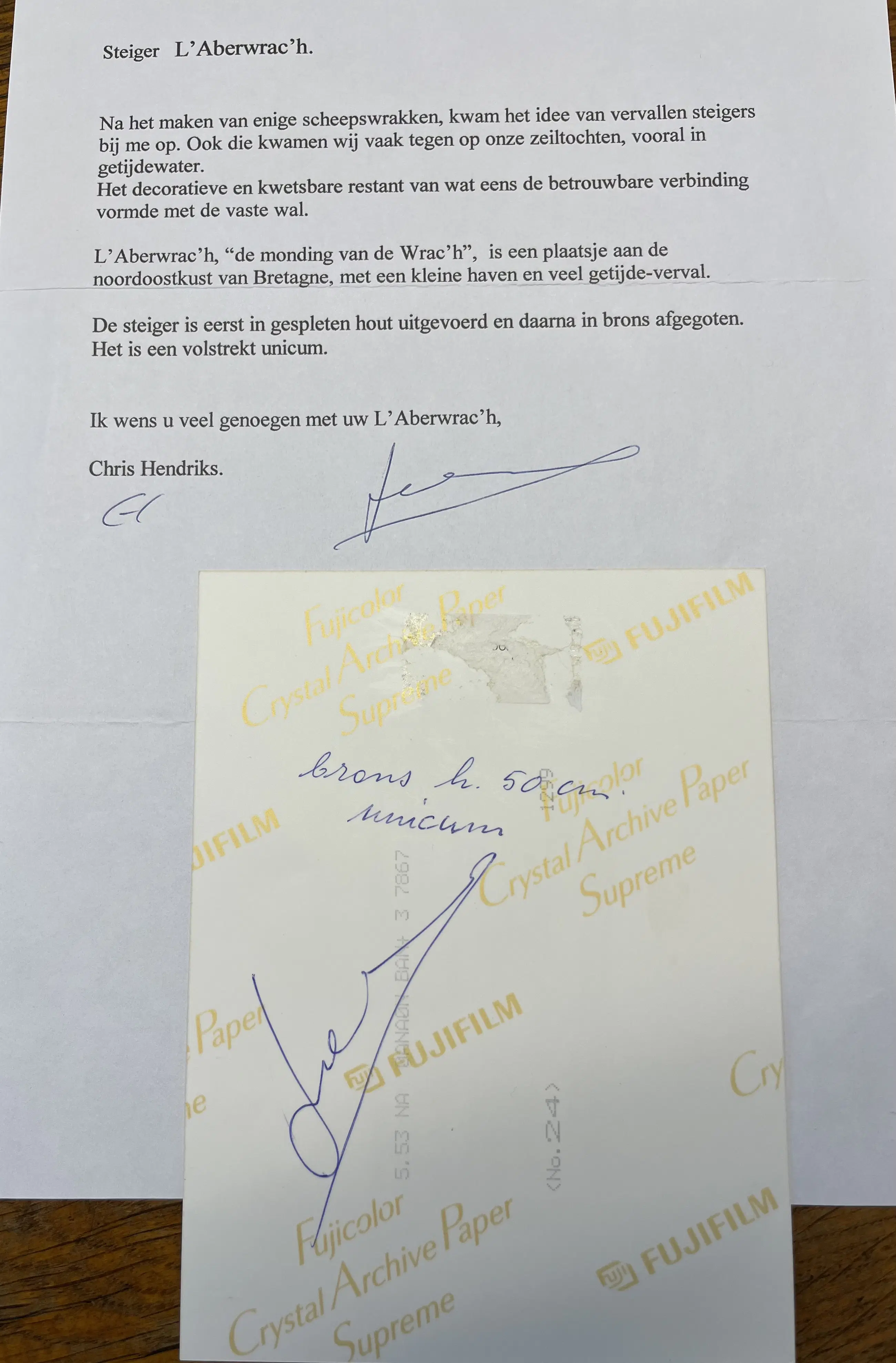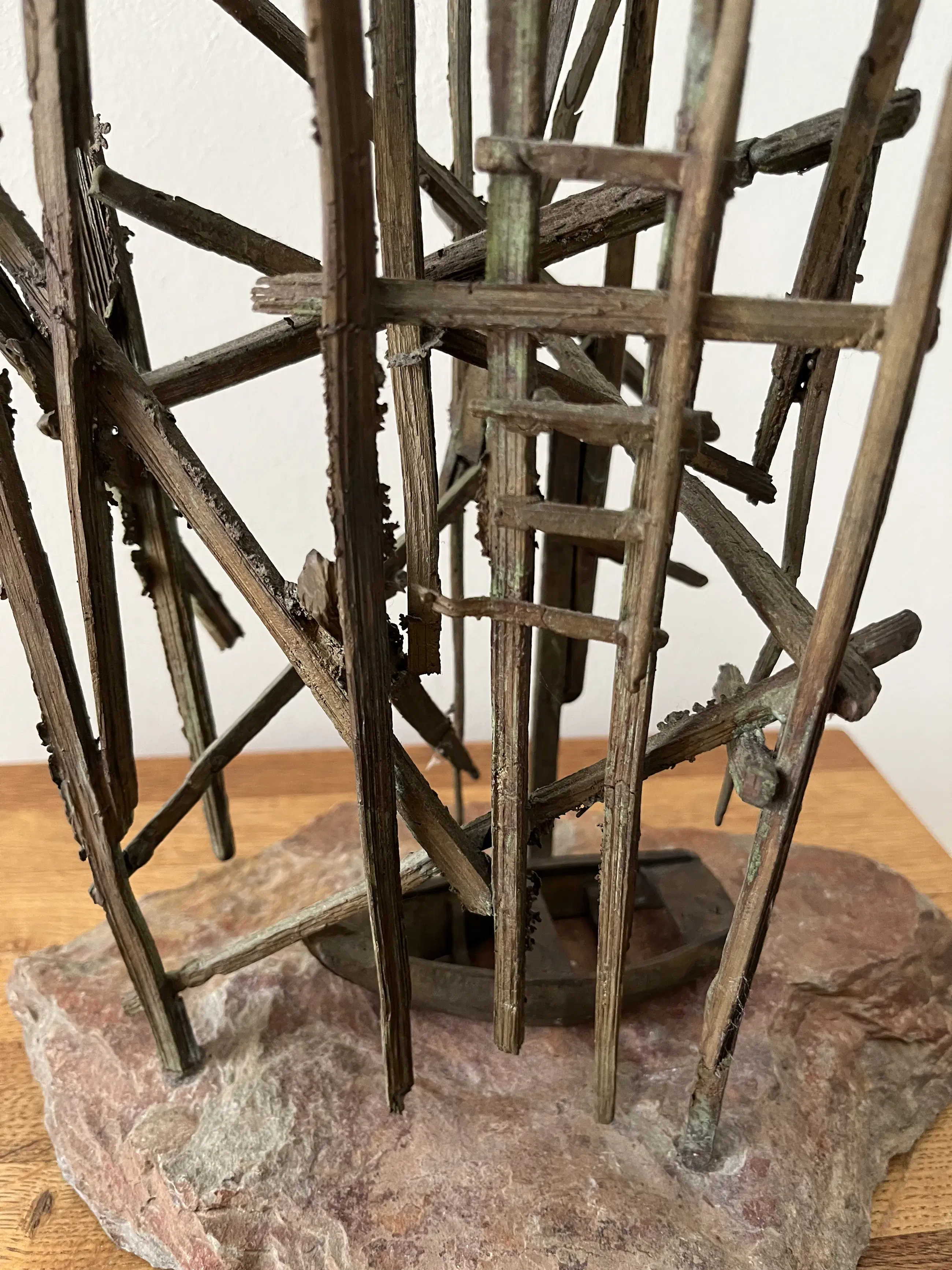 Bijzonder fraaie weergave van een oude, vervallen steiger bij een plaatsje aan de noordoostkust van Bretagne. Het kunstwerk is eerst in gespleten hout uitgevoerd en daarna in brons afgegoten. Het is een uniek exemplaar. De kunstenaar heeft er een echtheidsverklaring + foto bijgevoegd. Afmeting steiger 50x 15 x 11 cm. Afmeting roodstenen voet 4 x 29 x 21 cm. Totale hoogte 54 cm.