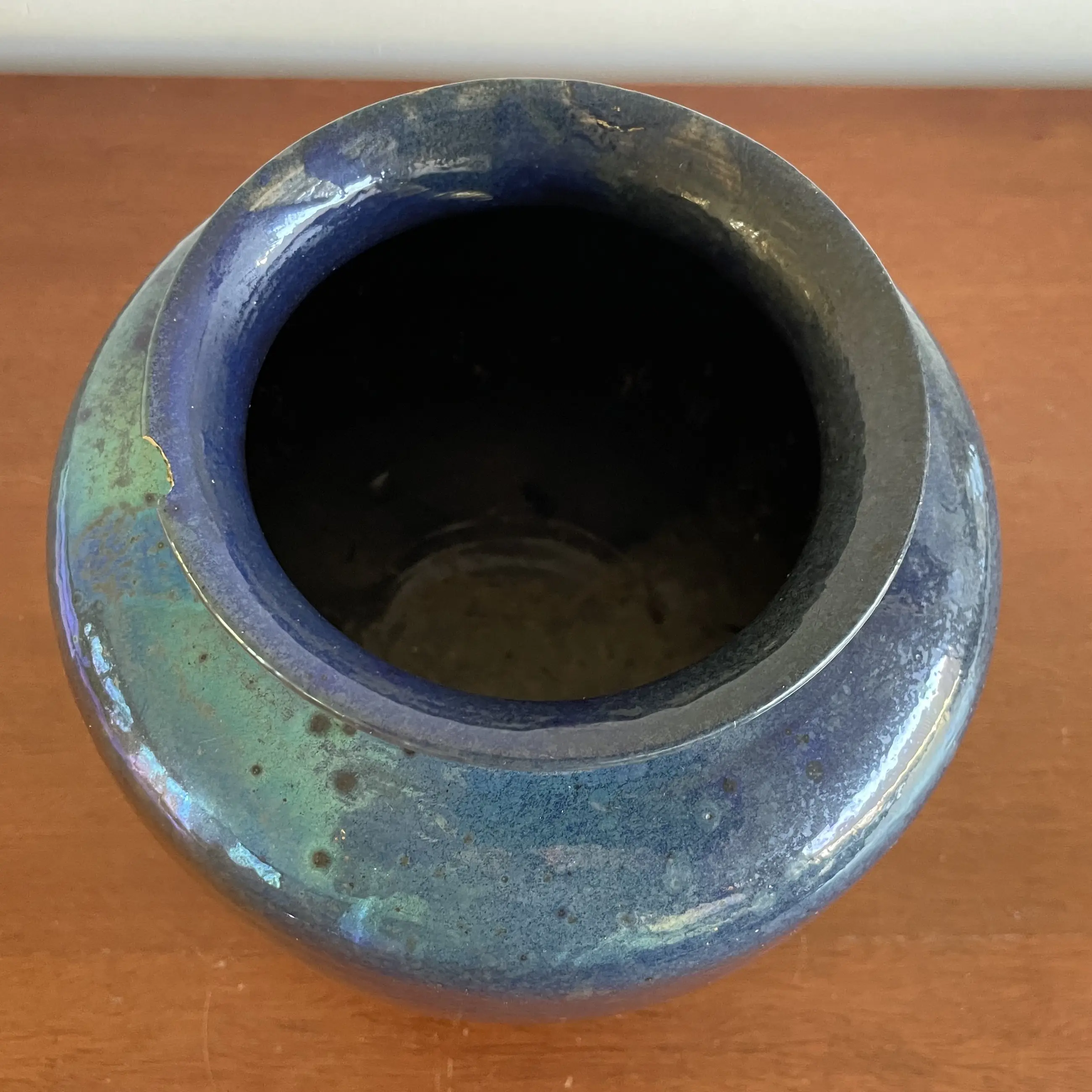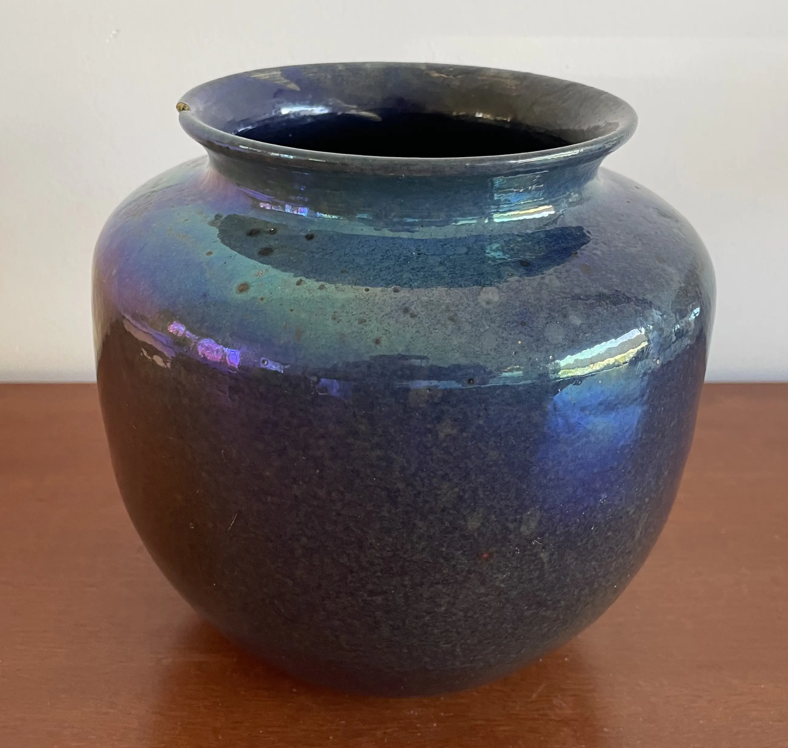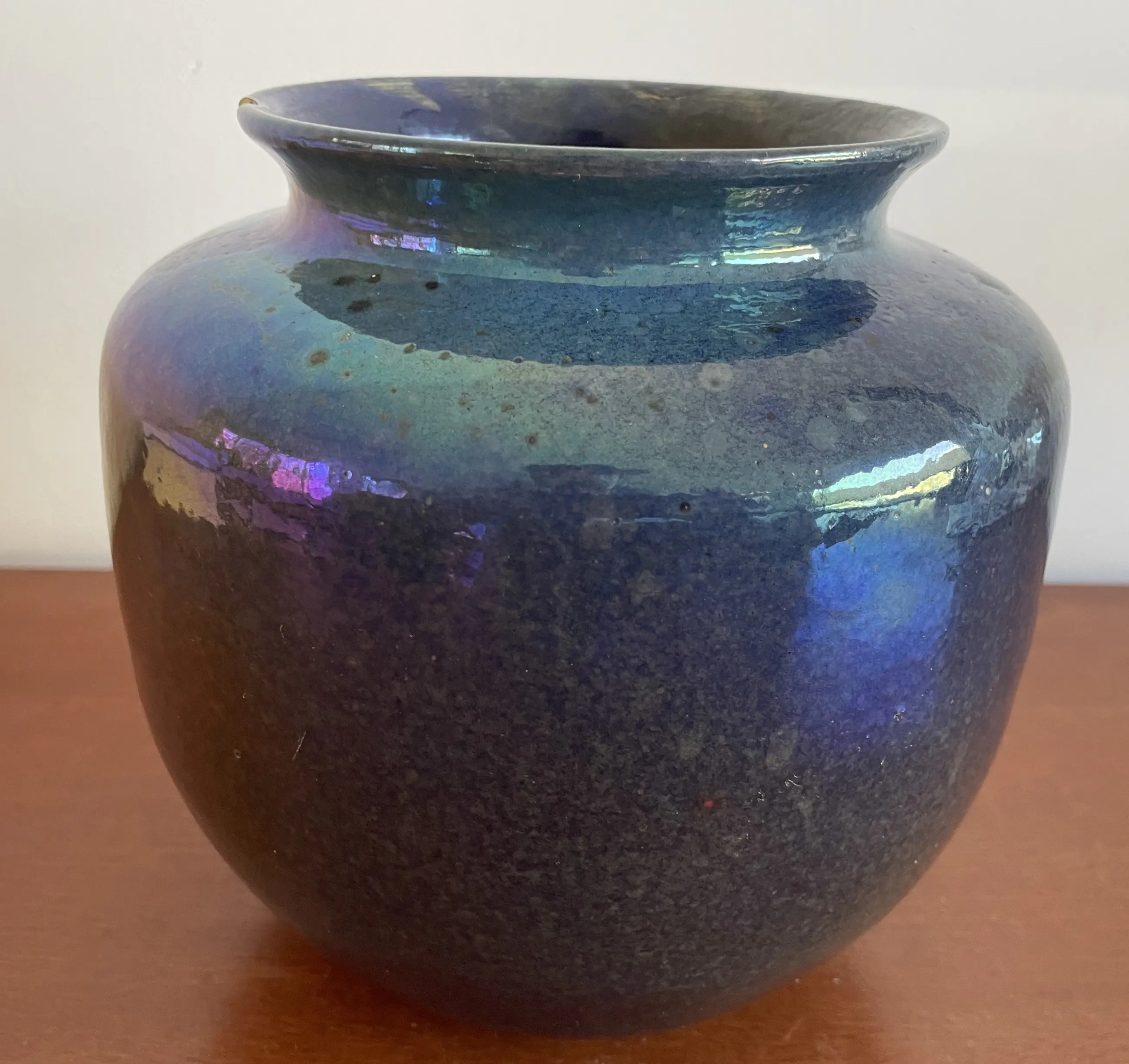 Art Deco Kunstaardewerken vaas met prachtig blauw luster glazuur van Chris Lanooy uitgevoerd in eigen atelier in Epe. In goede conditie, heeft helaas een chip op de bovenkant. Gesigneerd Lanooy - Holland