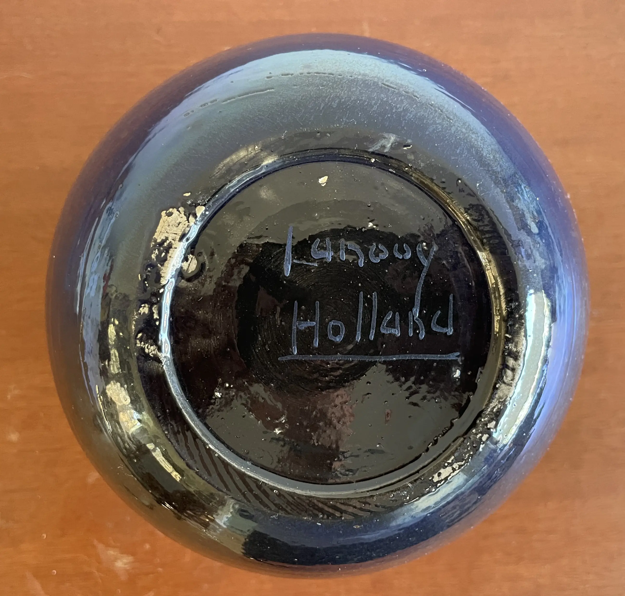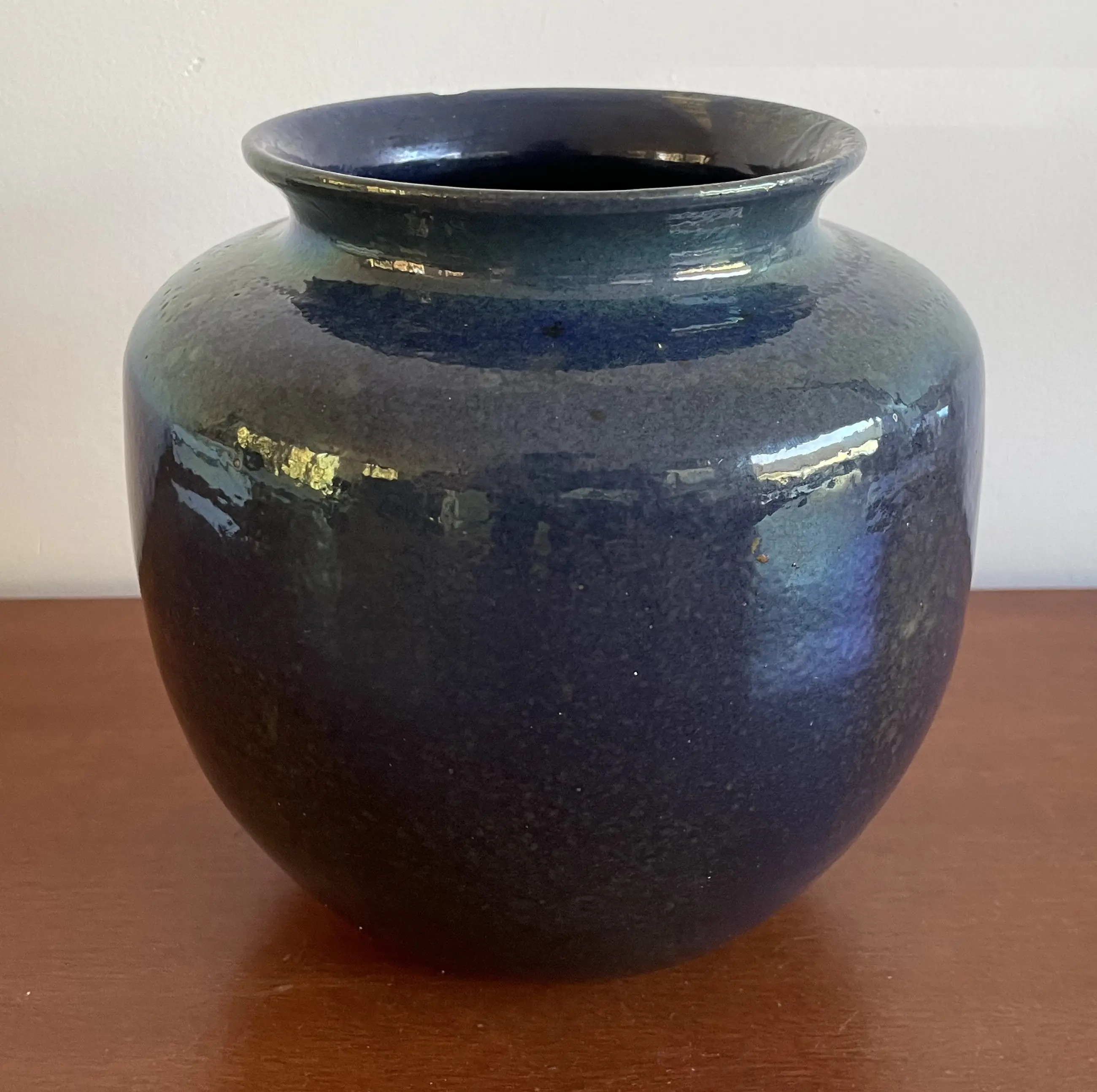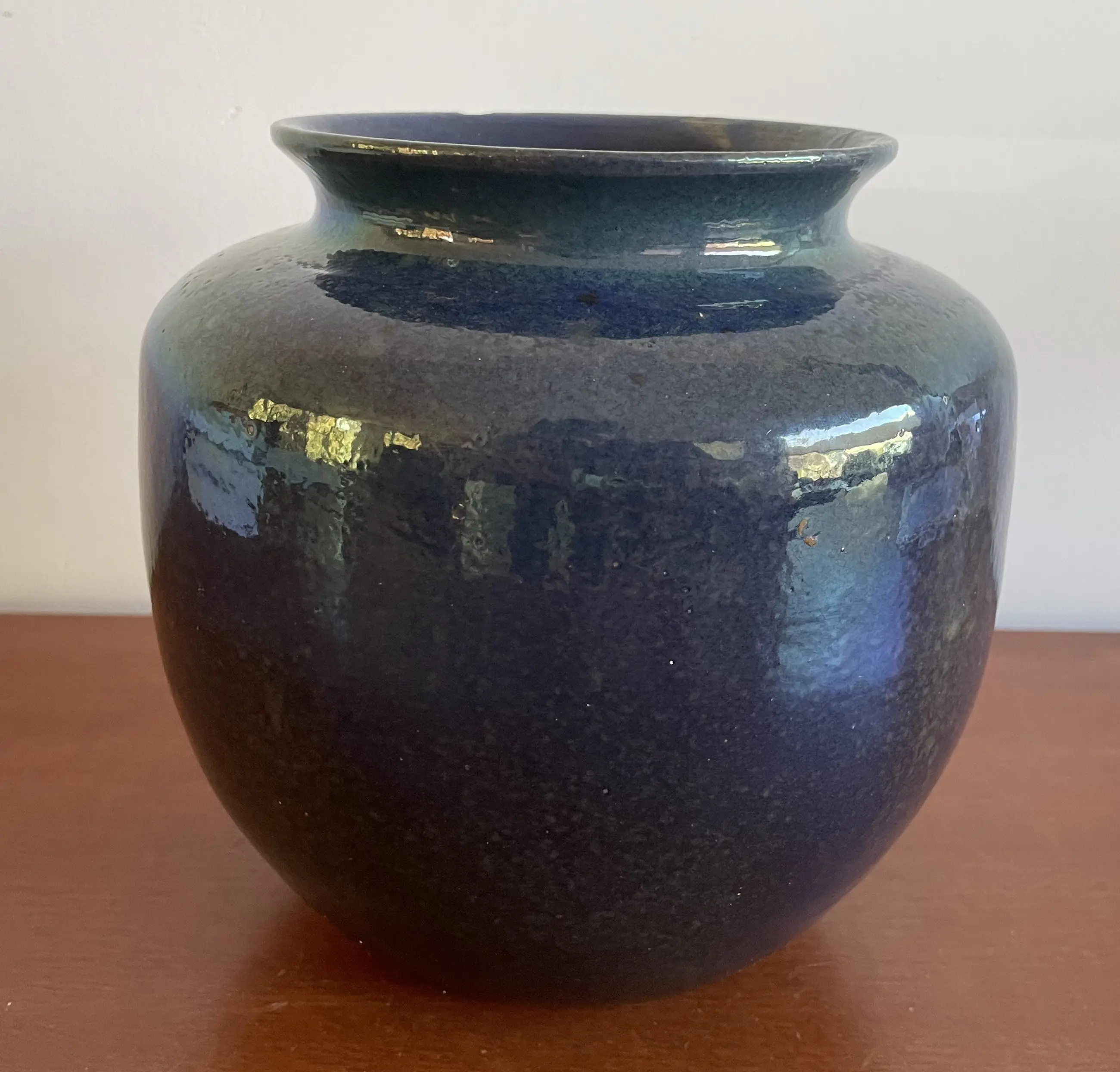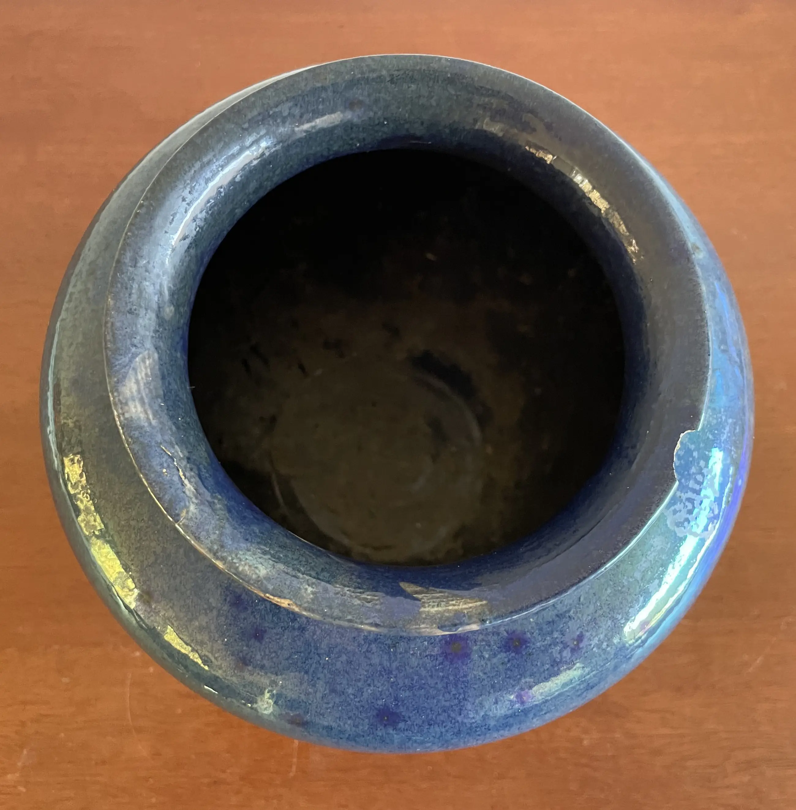 Art Deco Kunstaardewerken vaas met prachtig blauw luster glazuur van Chris Lanooy uitgevoerd in eigen atelier in Epe. In goede conditie, heeft helaas een chip op de bovenkant. Gesigneerd Lanooy - Holland