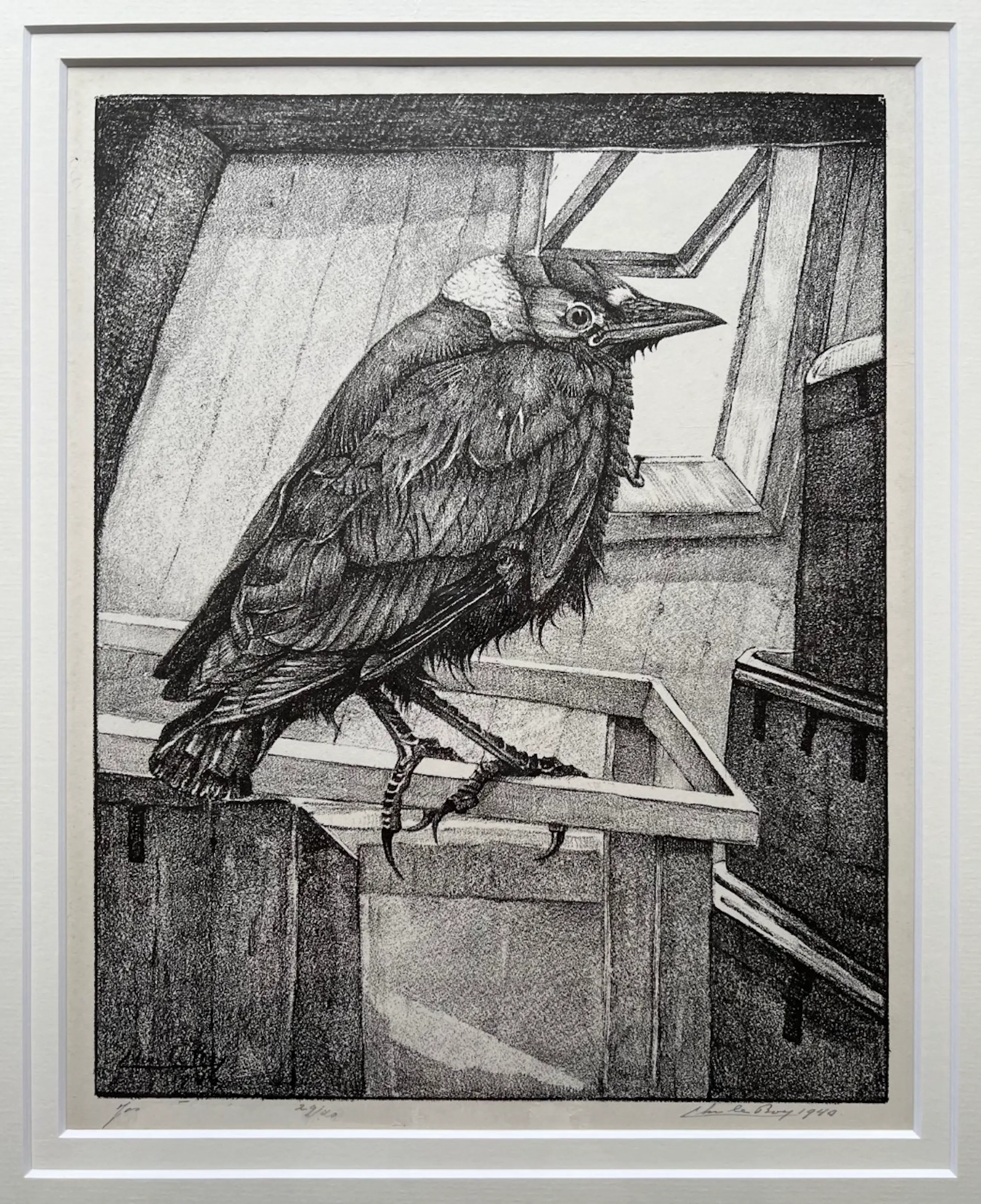 Litho uit 1940. Het lijkt me een jonge kauw zittend op de rand van een hekje bij het trapgat. In een oplage van 29/40. Zuurvrij ingelijst in de authentieke lijst. Met potlood gesigneerd. Zeer netjes ingelijst en kan direct aan de muur.