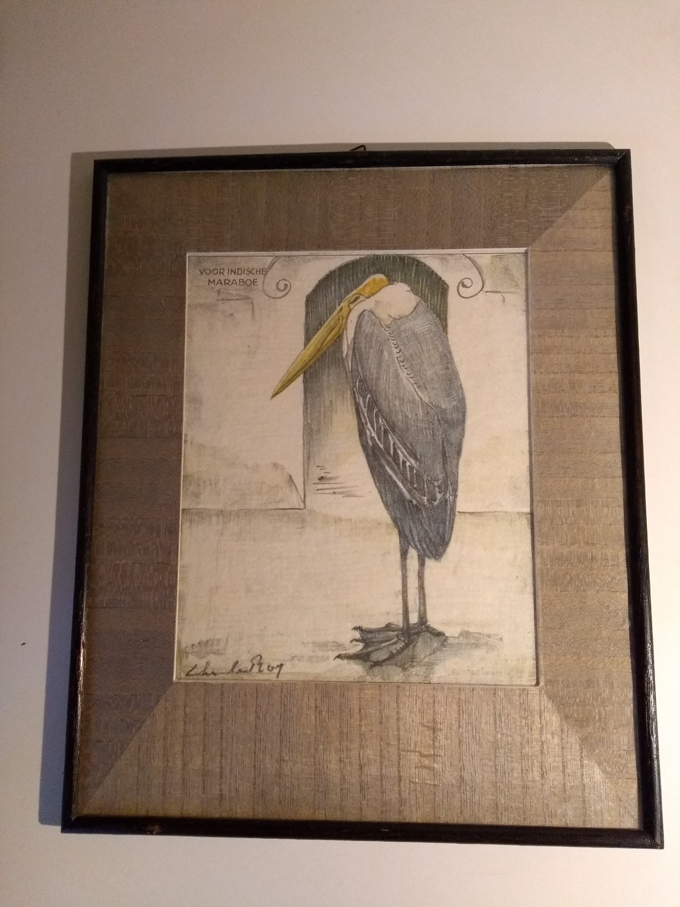 Zwart-wit tekening ; maraboe met gele snavel Passepartout lijkt op hout-fineer Inlijsting is slecht