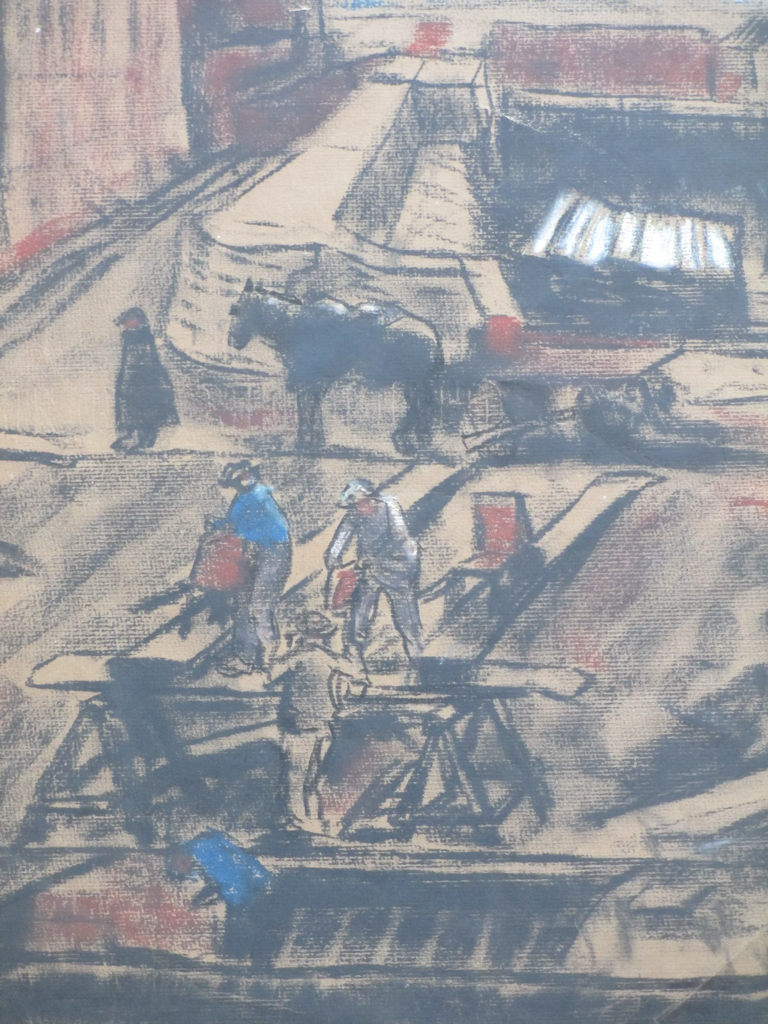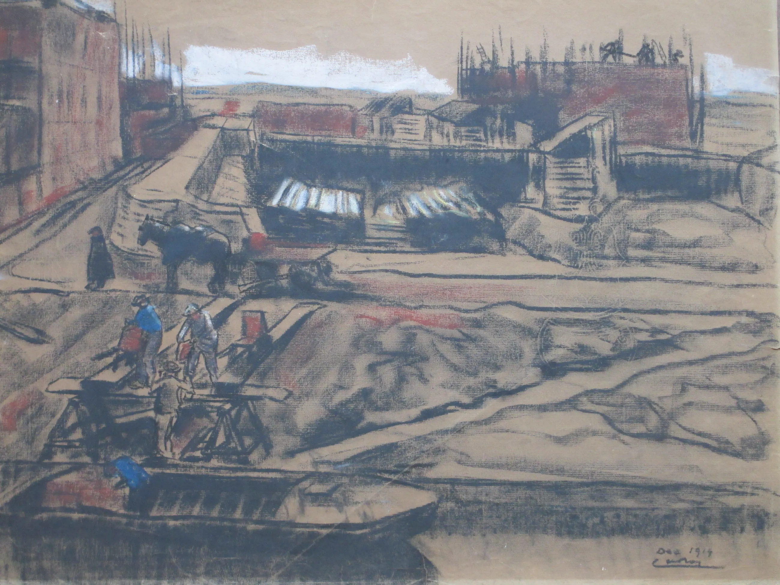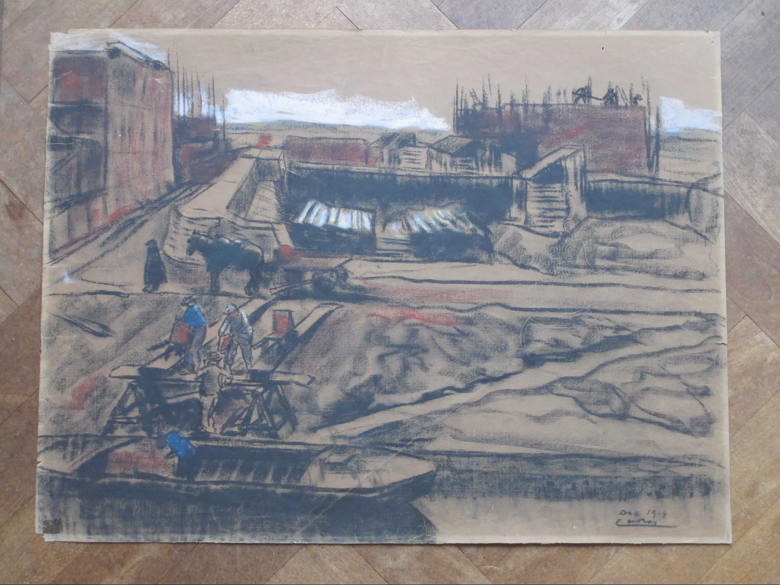 Gemengde techniek met opgehoogd wit door Chris Le Roy Voorstelling van de Valkenboskade in Den Haag in aanbouw Mooi tijdsdocument met arbeiders, paard en wagen en bouwmaterialen Gesigneerd en gedateerd r.o.: 'Dec 1914 C leRoy' Getiteld op achterzijde: '63 Valkenboschkade in aanbouw' Authenticiteit volledig gegarandeerd