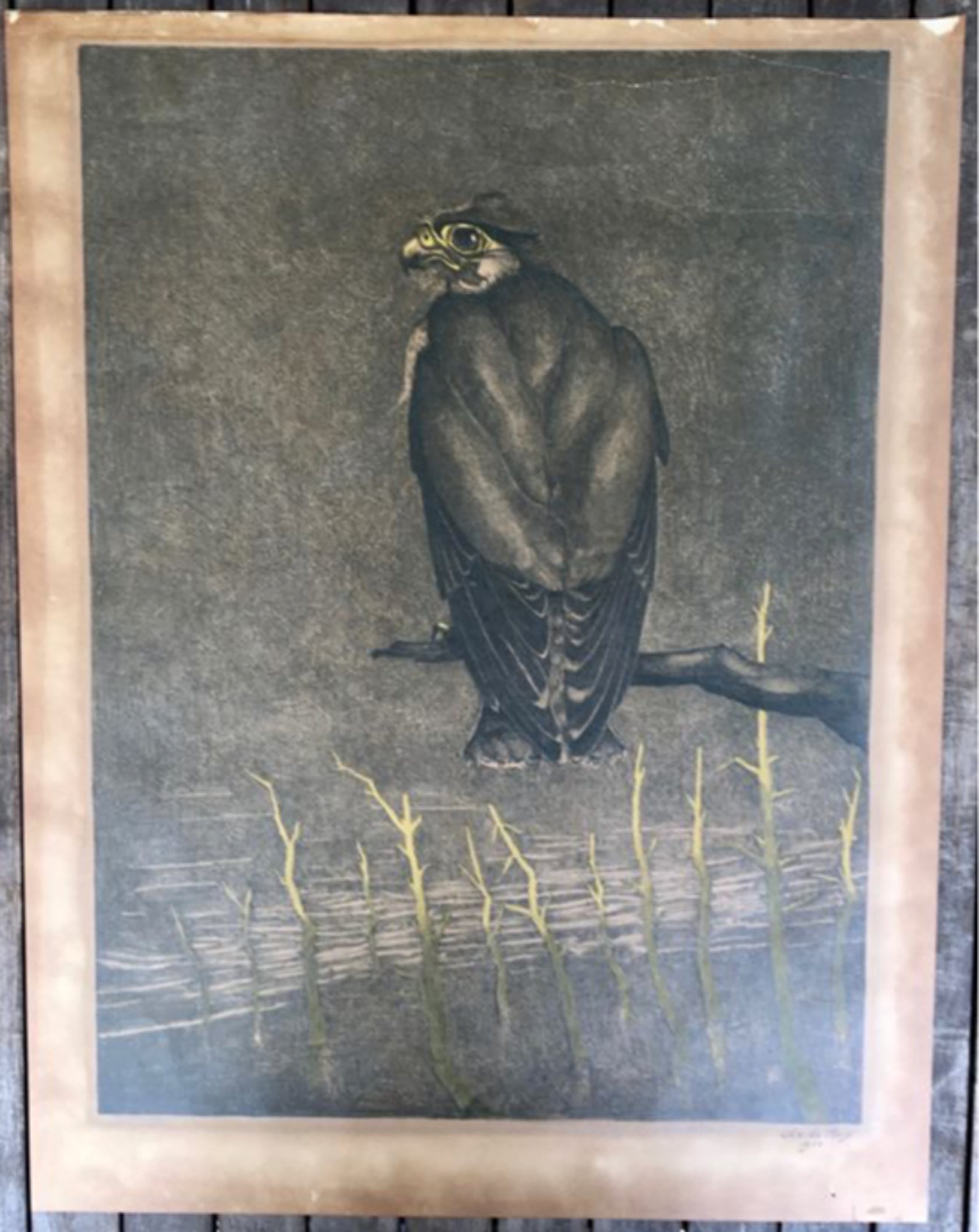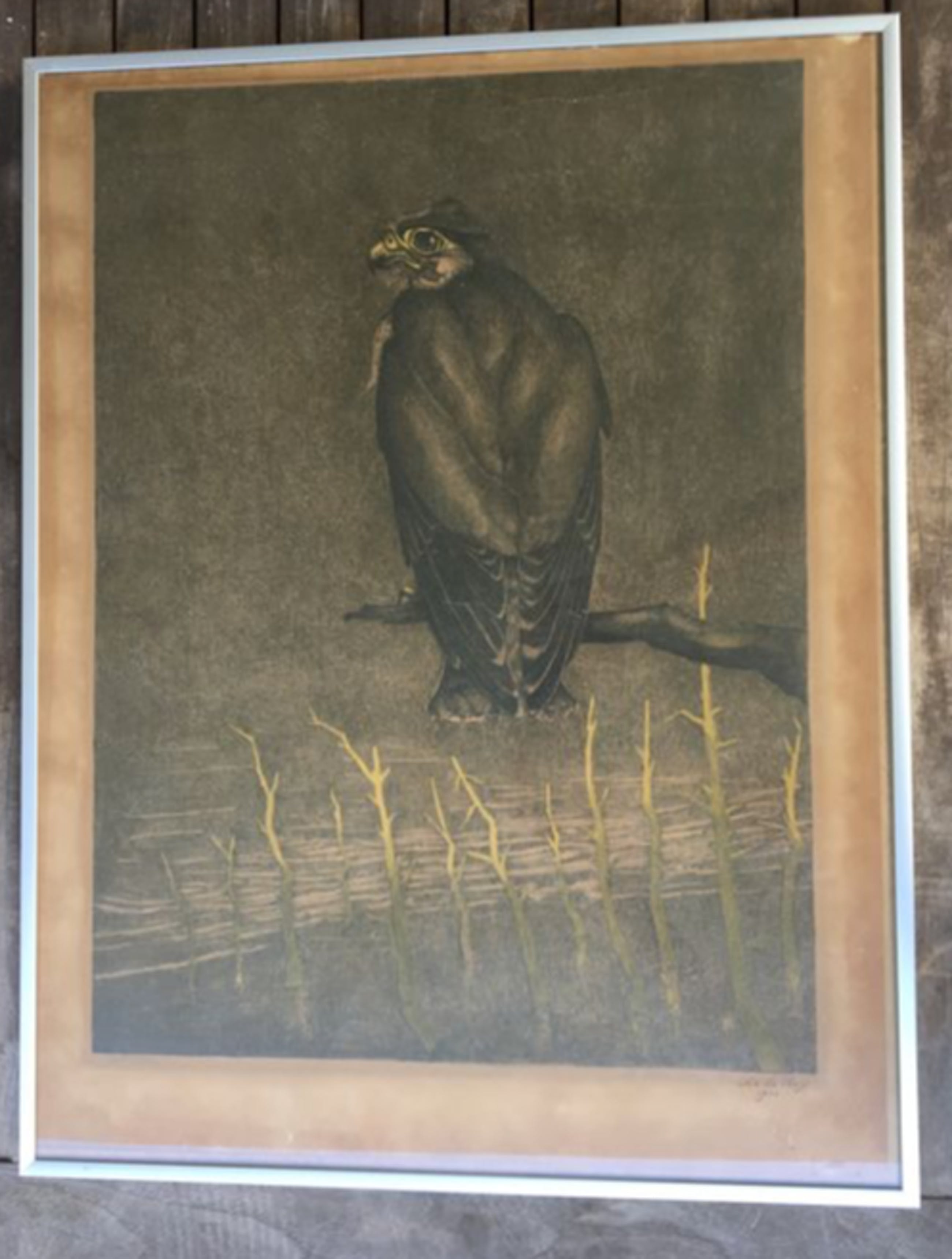De Ingelijste kleurenlitho Valk uit 1933 met potlood gesigneerd rechtsonder en getiteld linksonder met beeldmaat 57 x 42 cm en bladmaat 65 x 48 cm wordt aangeboden uit de nalatenschap van een kunstminnende 'vogel verzamelaar' en verkeerd na 84 jaar in een voor deze tijdsperiode in een redelijke staat. De foto's geven een goede indruk en zijn gemaakt in de lijst met niet ontspiegeld glas waardoor er reflexen ontstaan.
