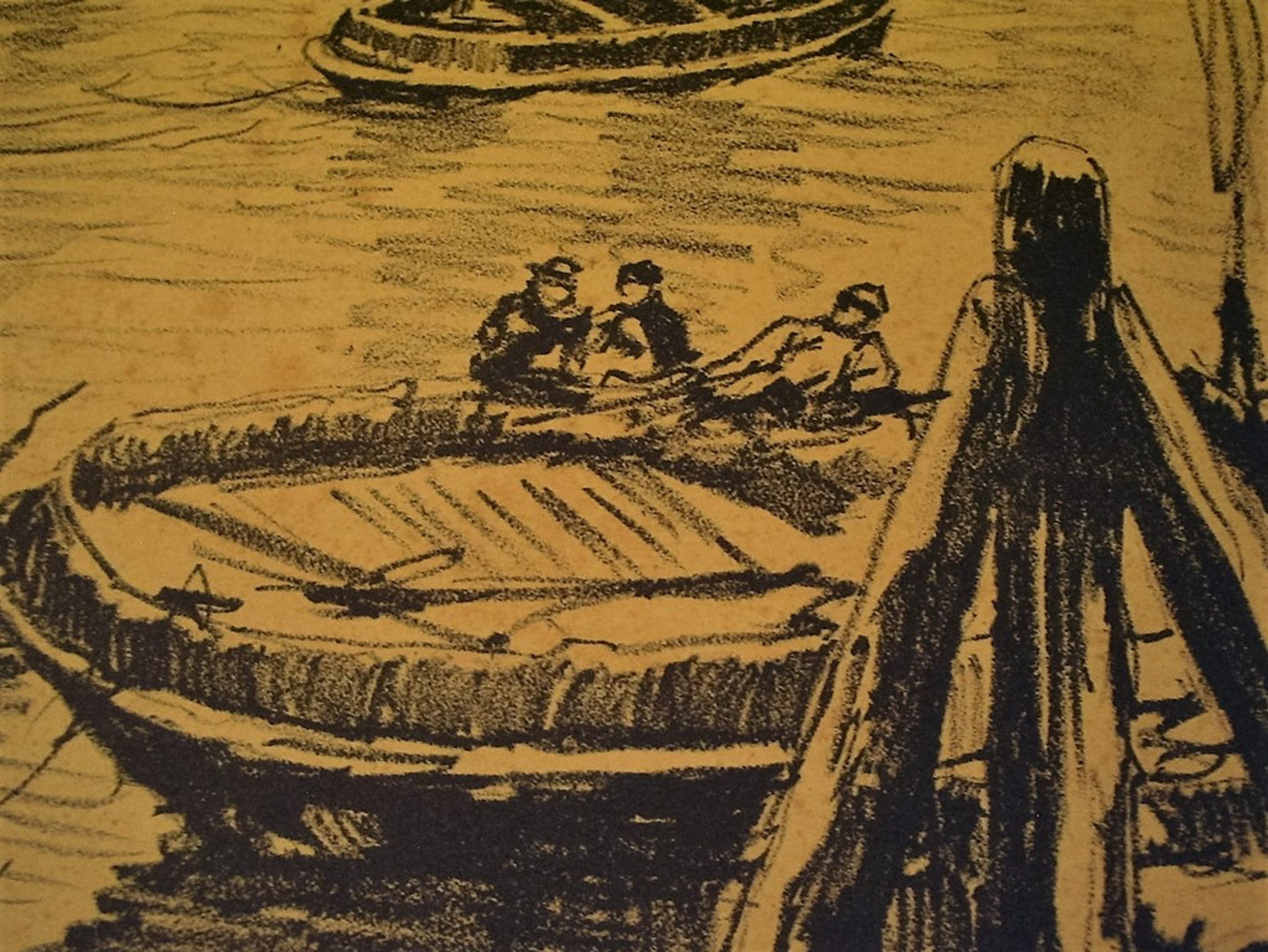 Rotterdams havengezicht uit 1904 van Chris Snijders waar de enorme bedrijvigheid vanaf druipt. Dit fraaie werk van Snijders is gesigneerd l.o. buiten de plaat.