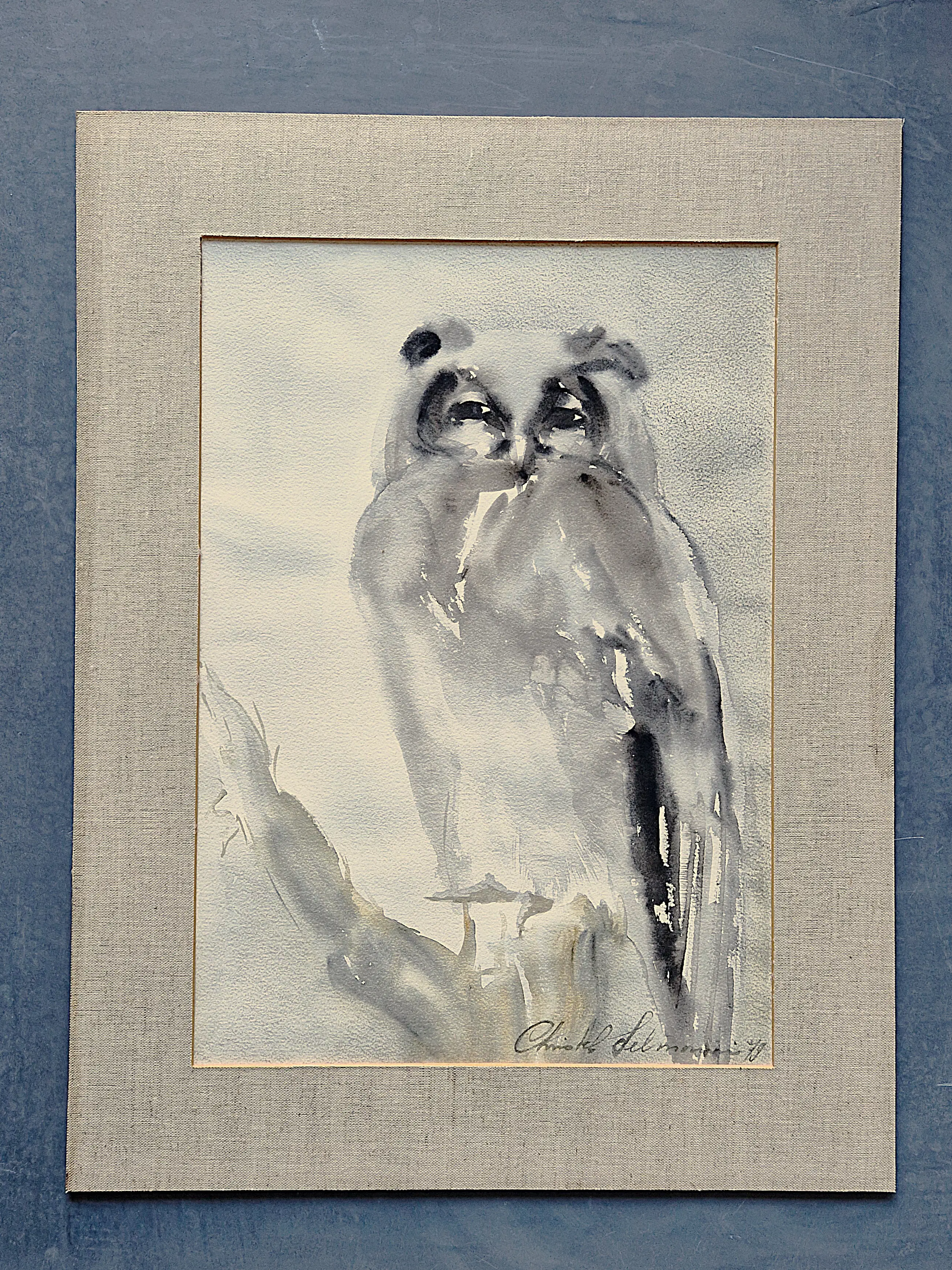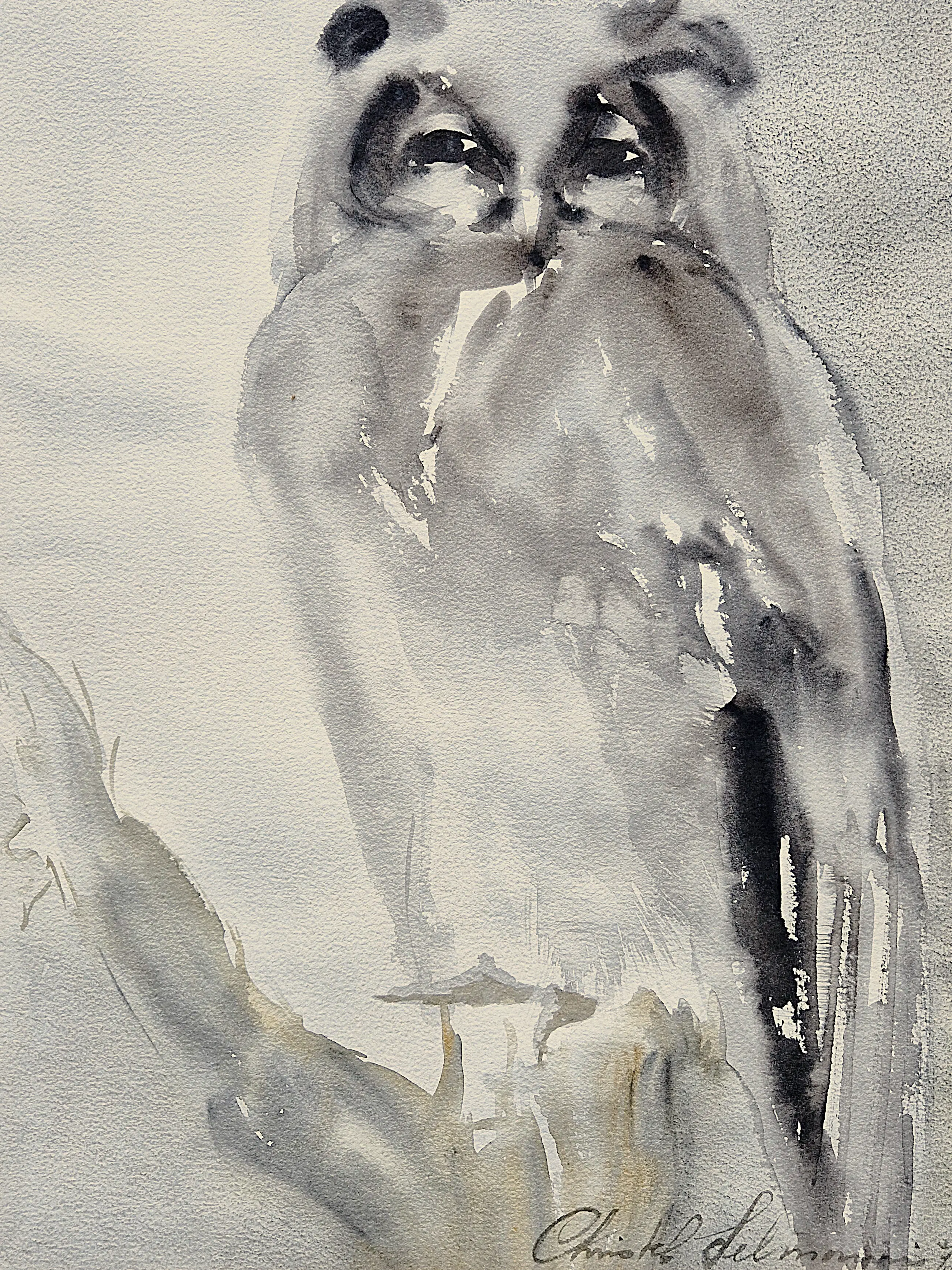 Christel Selmouni - grote in 1997 geschilderde sepia / aquarel op papier "Uil op tak"