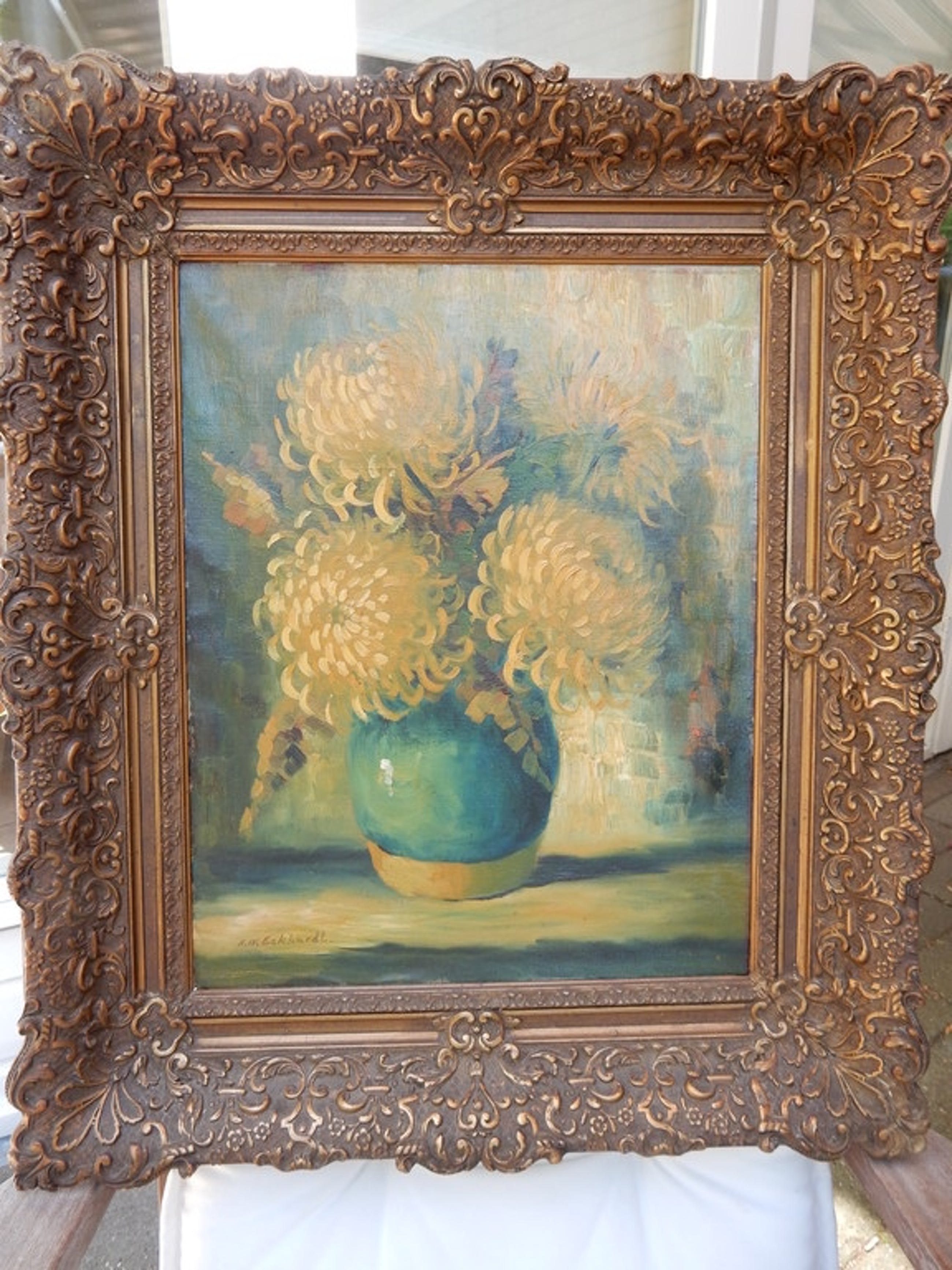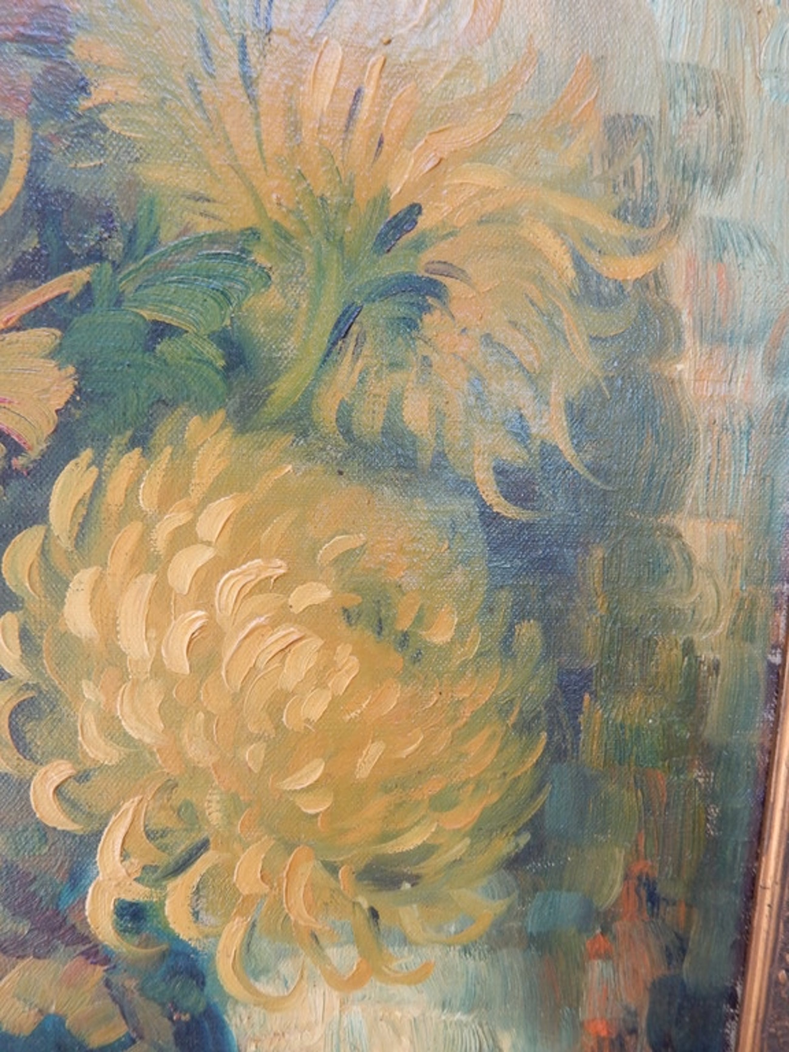 Dit werk: Stilleven, met gele bloemen in vaas, olieverf op doek, l.o. gesigneerd.