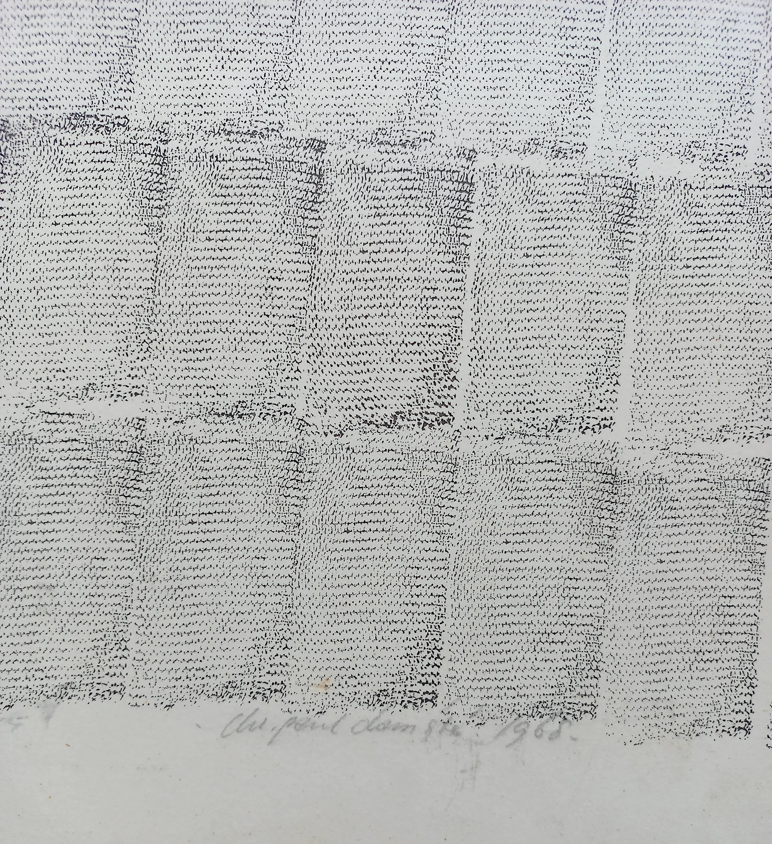 Mooi Zero-achtig werk van Christiaan Paul Damsté. Inkttekening op papier opgebouwd uit 8 rijen van 23 stempels, voluit gesigneerd en gedateerd (1968) rechtsonder. In goede conditie.