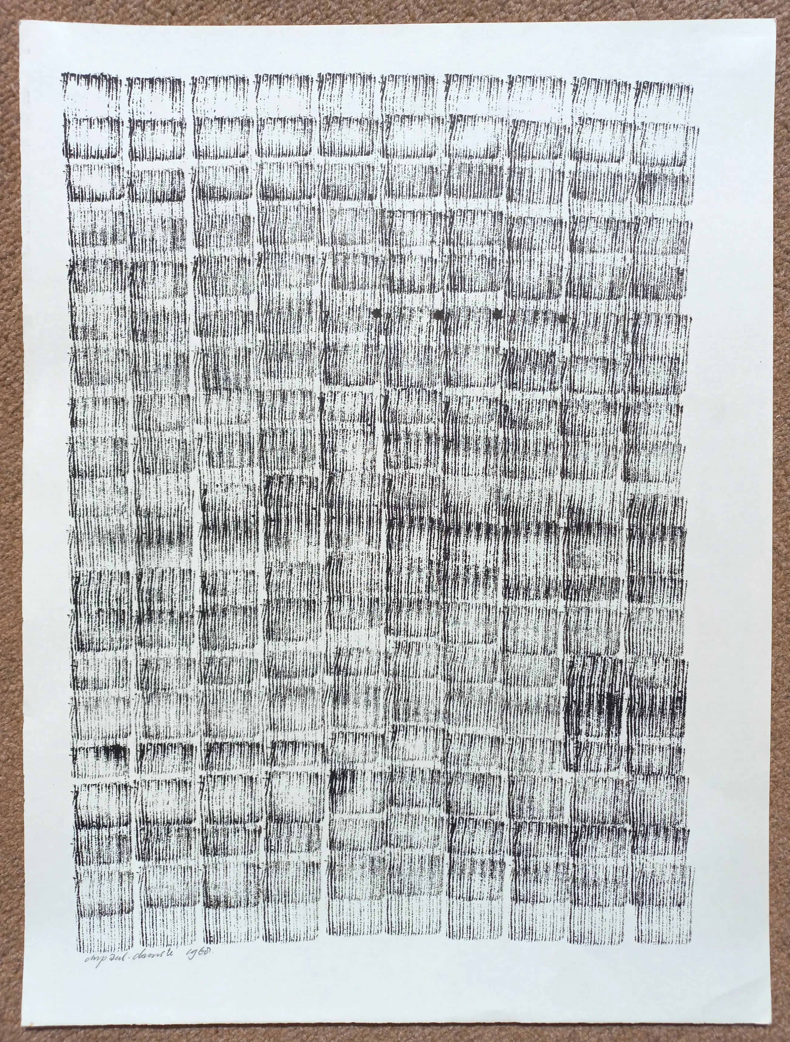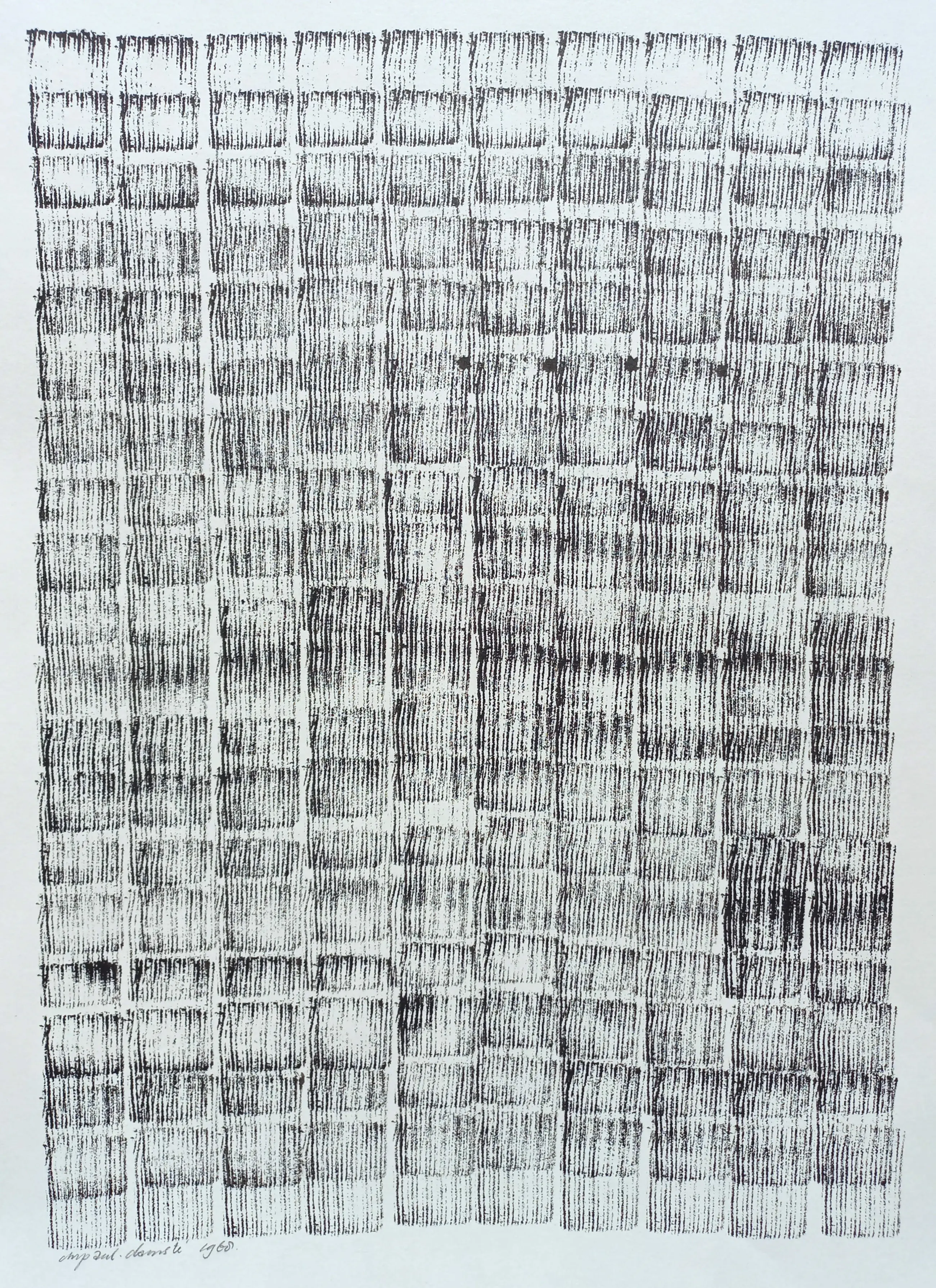Zeer mooi Zero-achtig werk van Christiaan Paul Damsté. Inkttekening op papier opgebouwd uit tweehonderd stempelafdrukken, met potlood voluit gesigneerd en gedateerd (1968) linksonder. In zeer goede conditie.