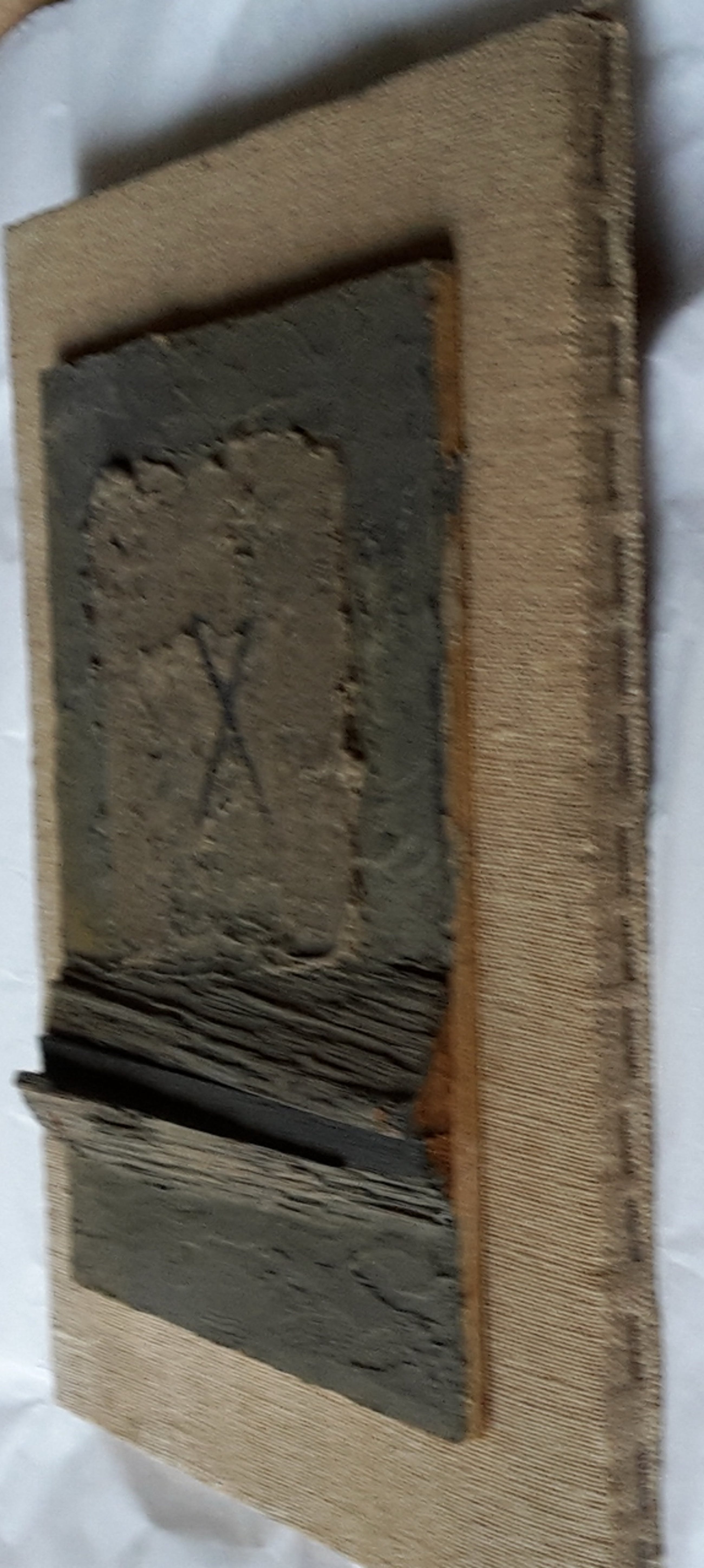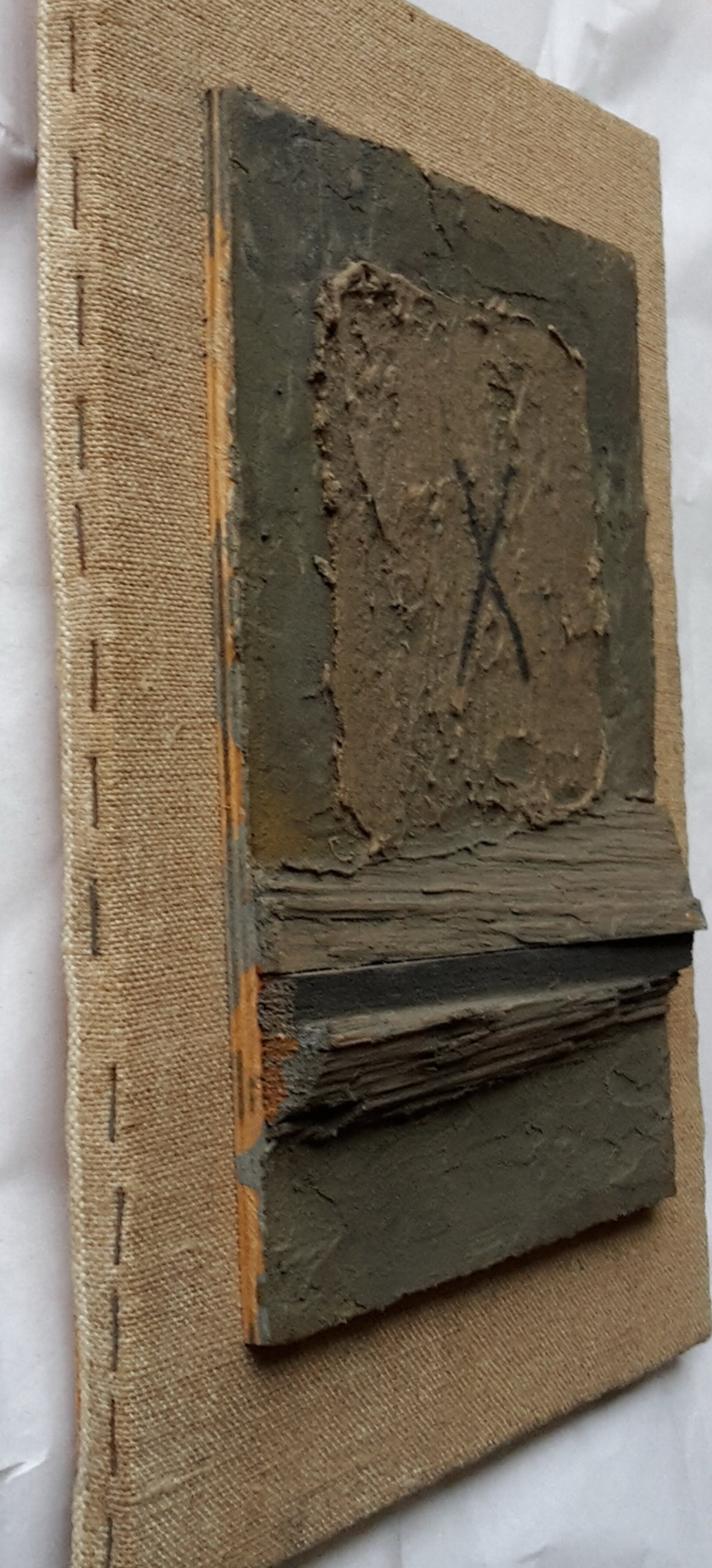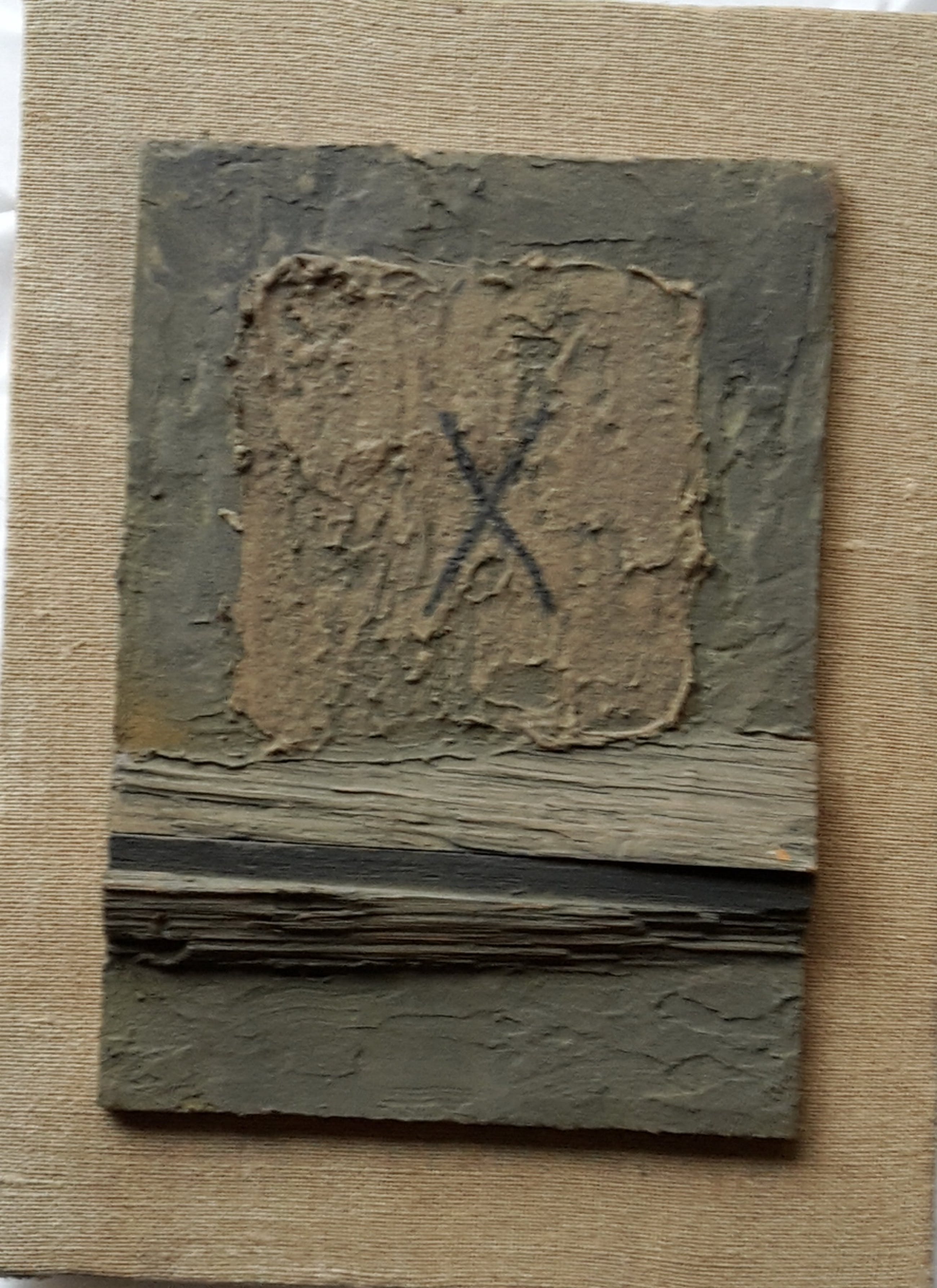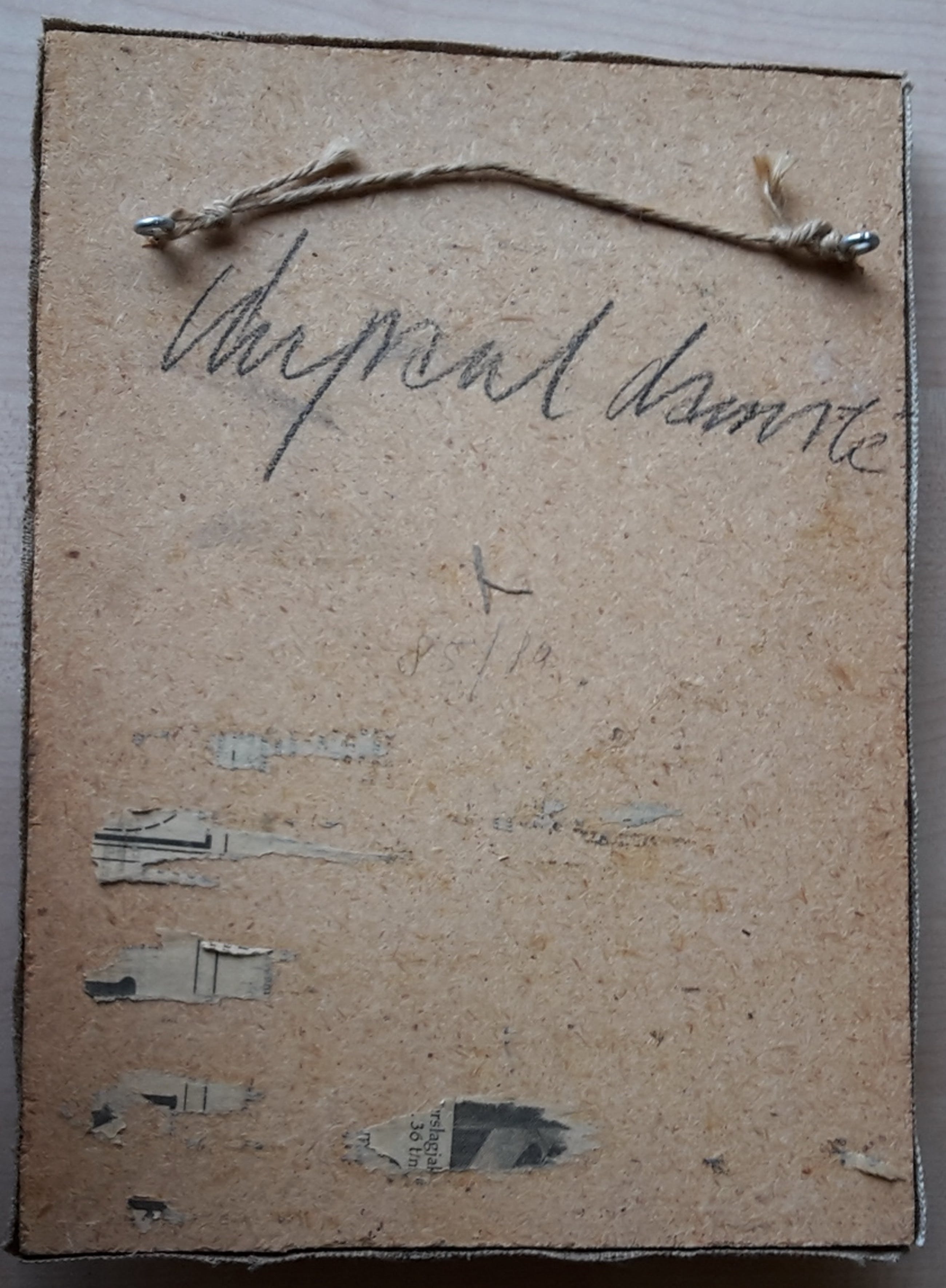 gemengde techniek - hout, pasta, verf - op triplex, 20,5 x 15 cm; geplakt op met bruin canvas bekleed spaanplaat 20,5 x 28 cm; z.j; gesigneerd aan de achterzijde