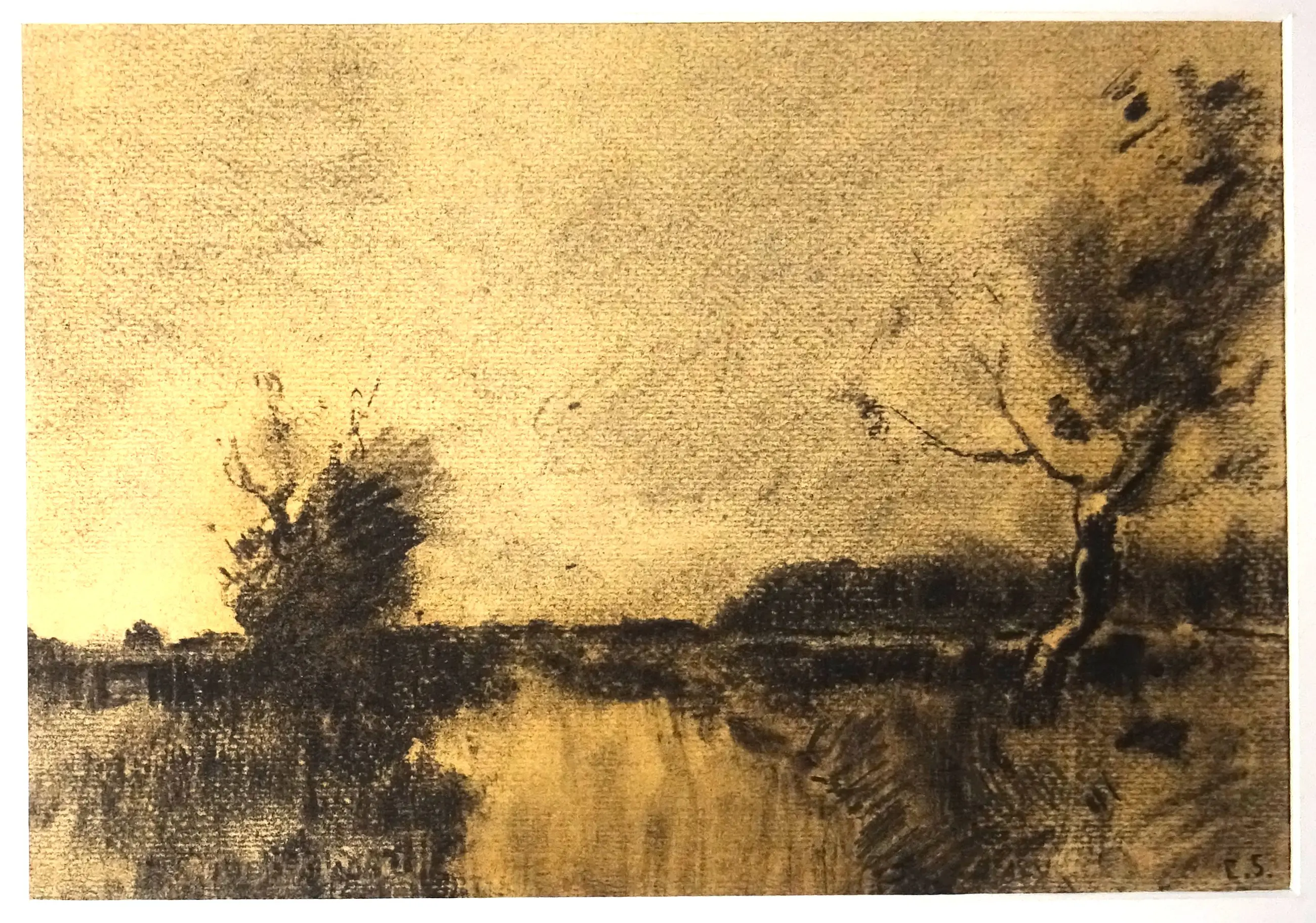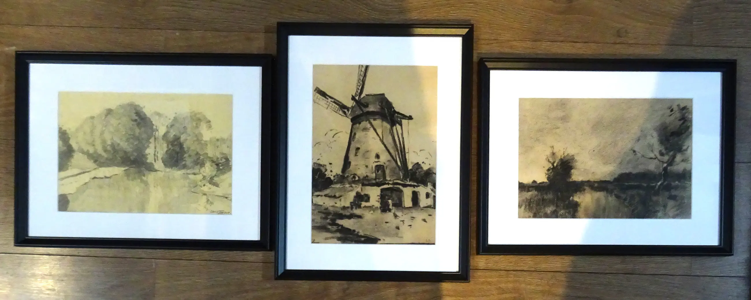 Een kavel van 3 tekeningen, 2 met houtskool , 1 met potlood. 2 x landschap, 1 x molen.