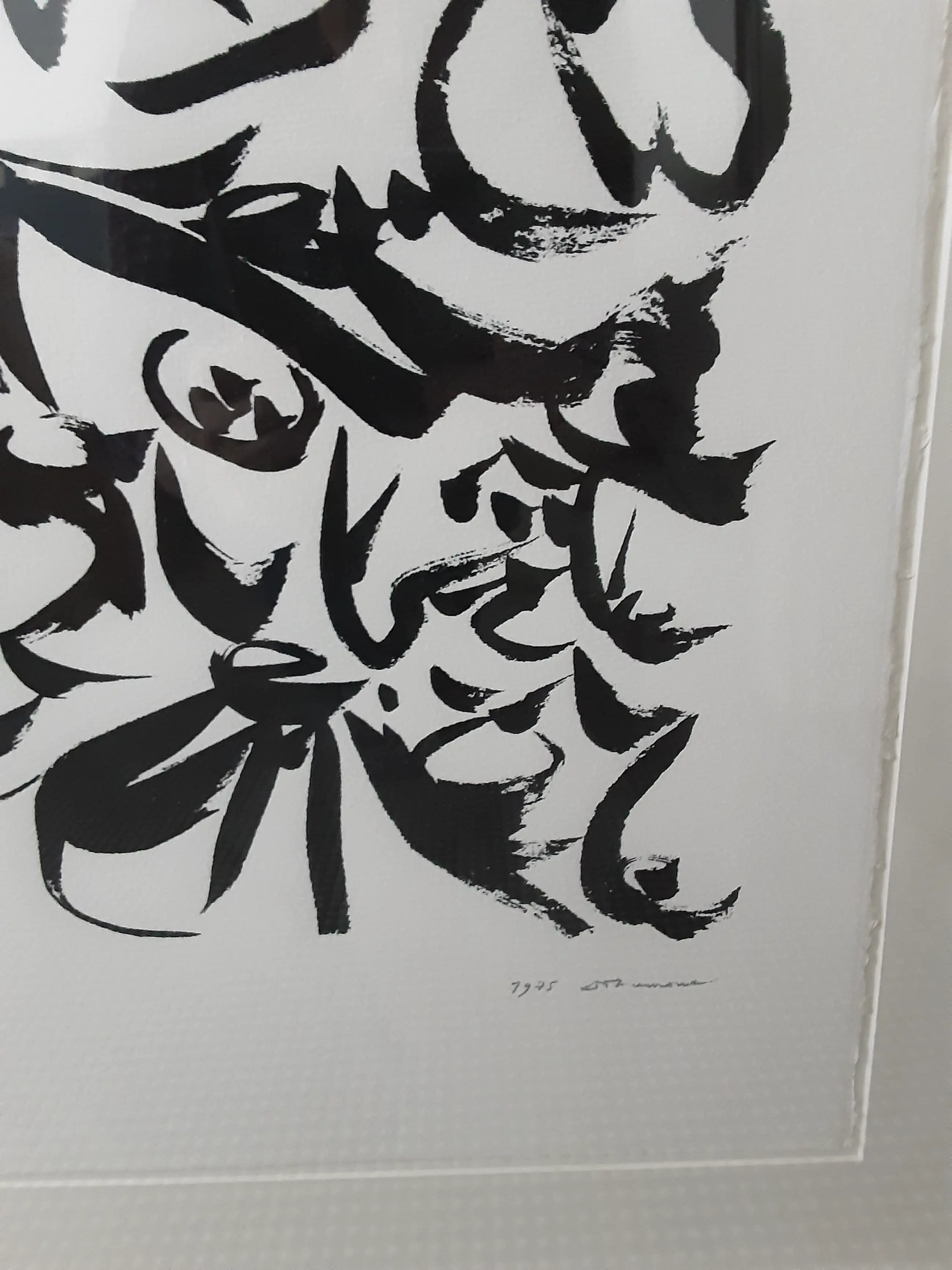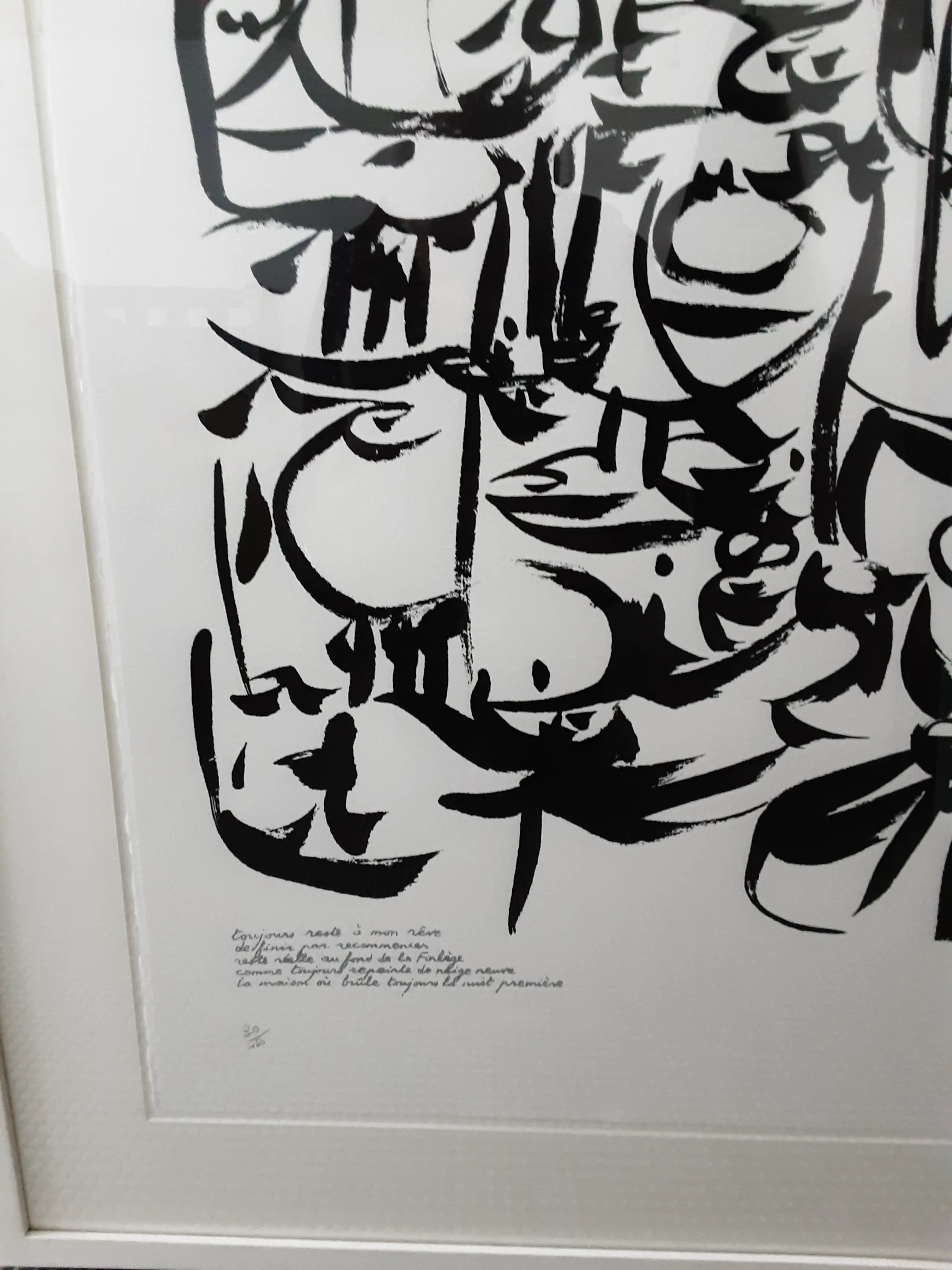 Zeefdruk uit 2004 naar een logogram met gedicht uit 1975. Mooi ingelijst, afmetingen lijst 97 bij 77 cm. Deze uitgave is uitgebracht in een oplage van 150 ex. In potlood genummerd op geschept papier. Deze uitgaves zijn door de broer van de kunstenaar en verso op het blad gesigneerd. Dit is hier niet geverifieerd,want lijstwerk intact gelaten.