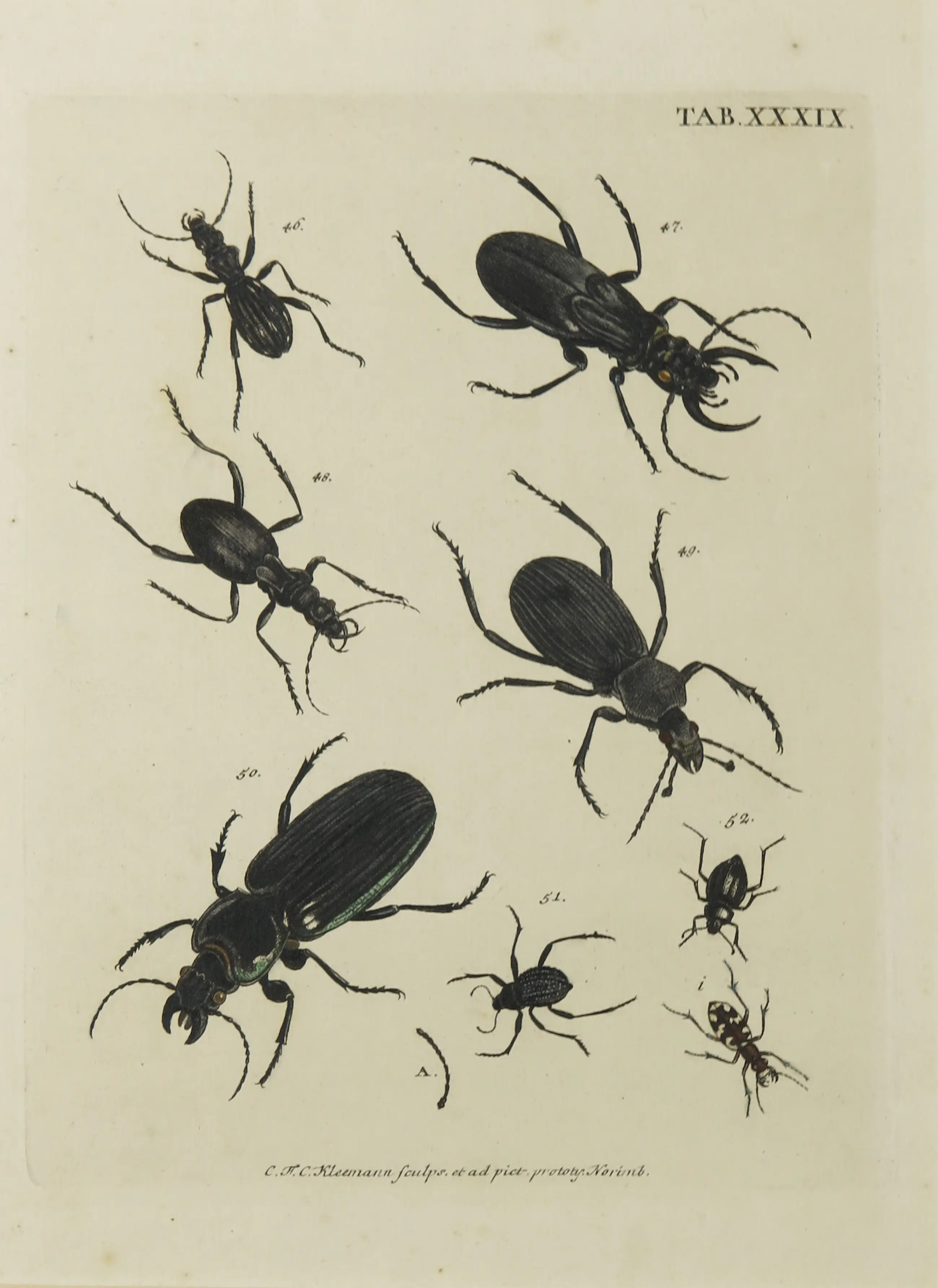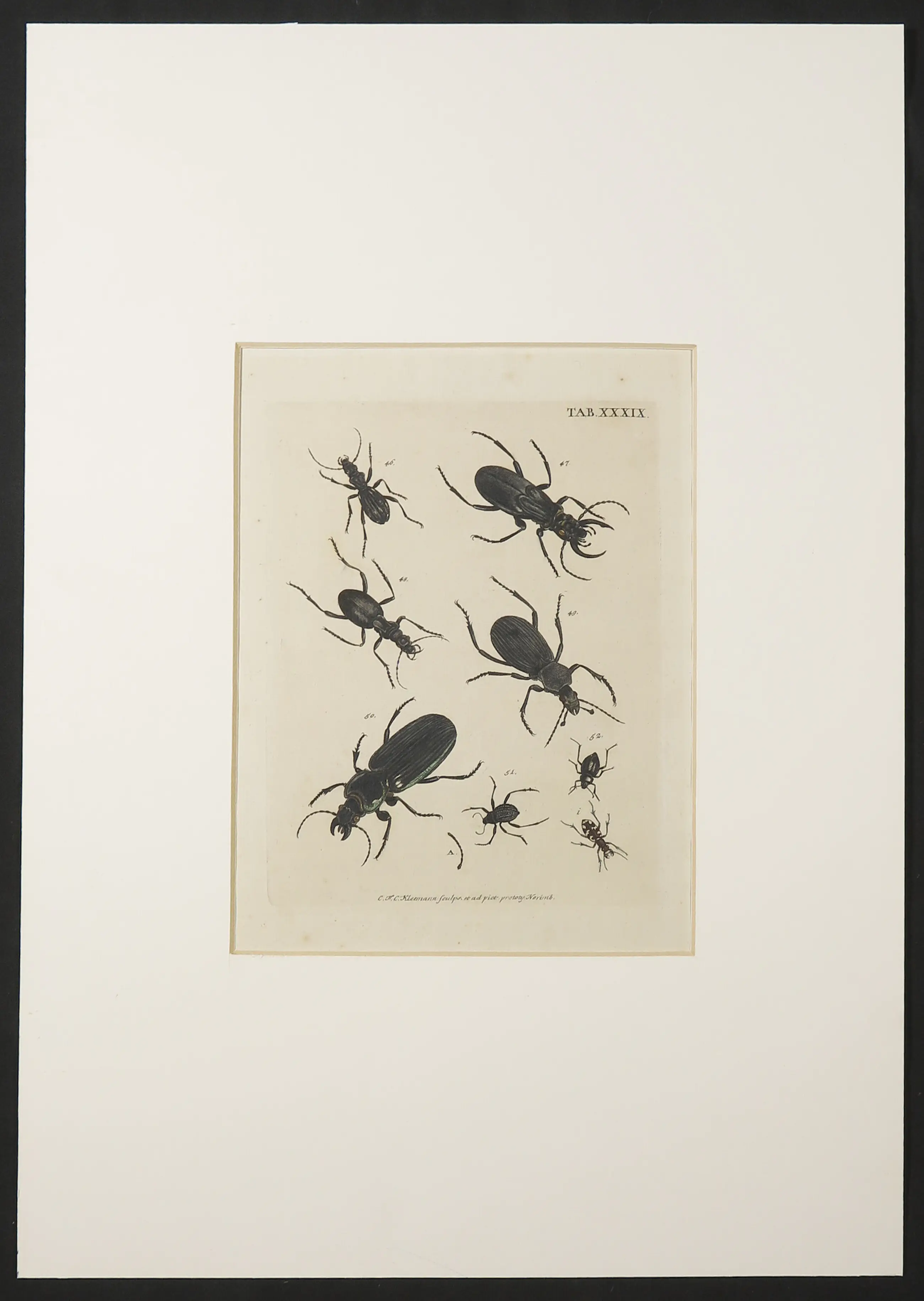 Handgekleurde gravure door Christian Friedrich Carl Kleemann voor de "Catalogus Systematicus Coleopterorum. Catalogue systèmatique des coleotères. / Systematische Naamlijst van dat geslacht van Insecten, dat men Torren noemt.", door Johan Eusebius Voet. De eerste uitgave dateert uit 1766/1769, een tweede uitgave werd in 1804/1806 uitgebracht. Het is niet duidelijk uit welke editie deze gravure afkomstig is.