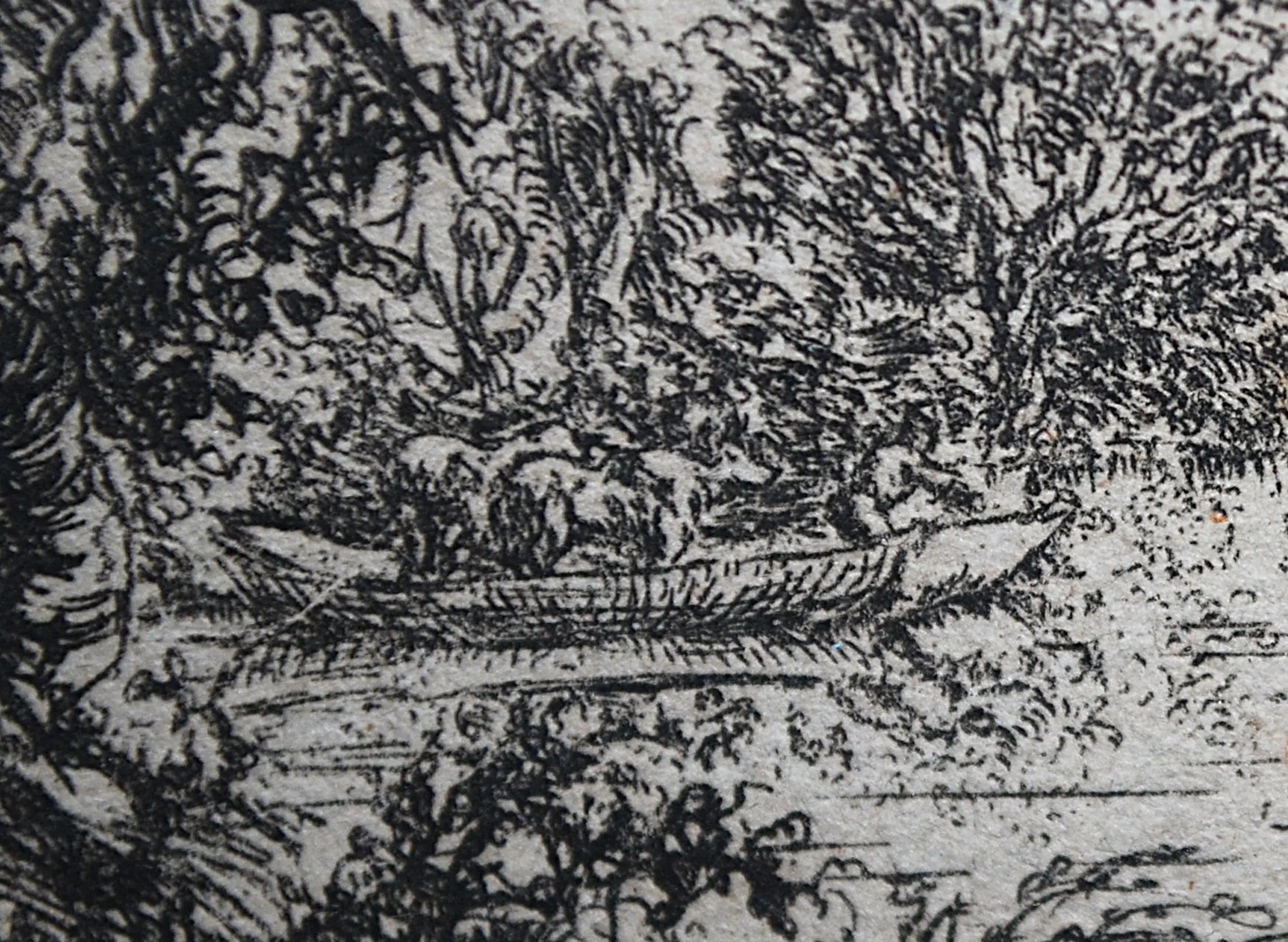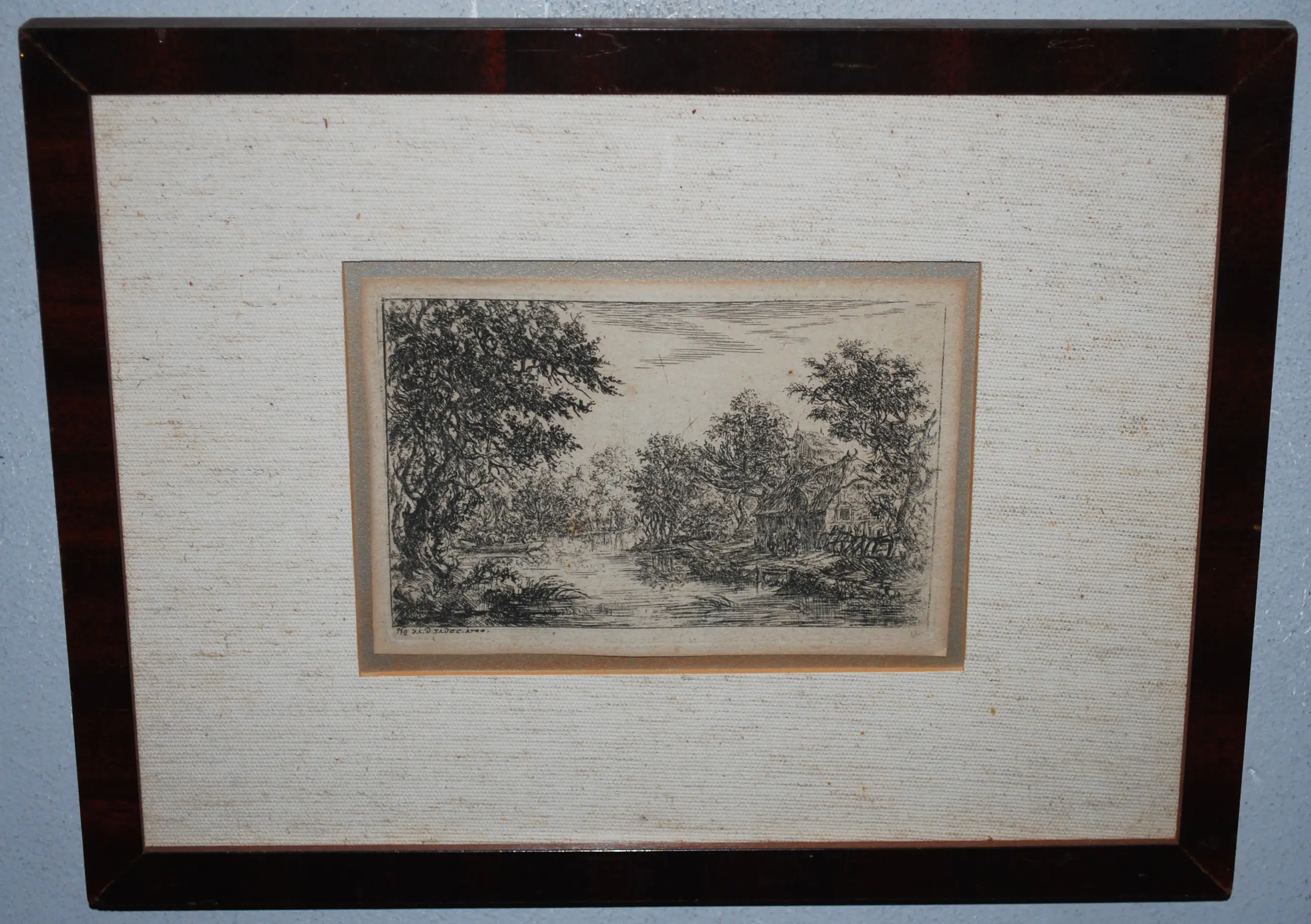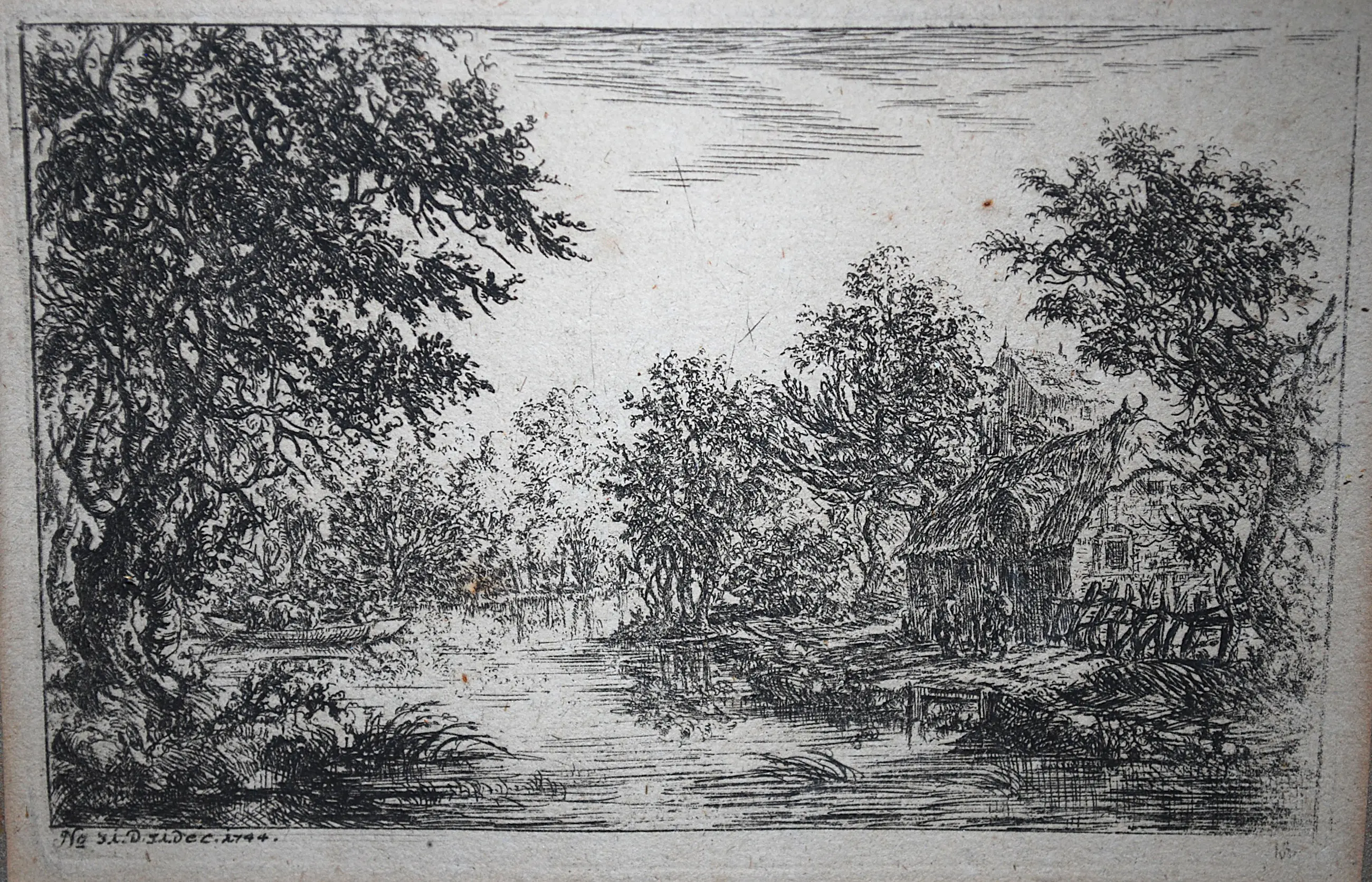 Een vissershut met de vissers voor het huis. Lommerrijk waterlandschap met links een schuit met koeien en begeleider. Monogram (wat lijkt op potlood) r.o. In de plaat genummerd (31) en gedateerd 31 dec. 1744. Plaatrand ca 9x13.5 cm. Bladmaat ca 9.8x14.4 cm. Het blad is losjes bevestigd op goudkleurig karton. Omkaderd door een linnen passepartout. In een gefineerd hardhouten lijst.