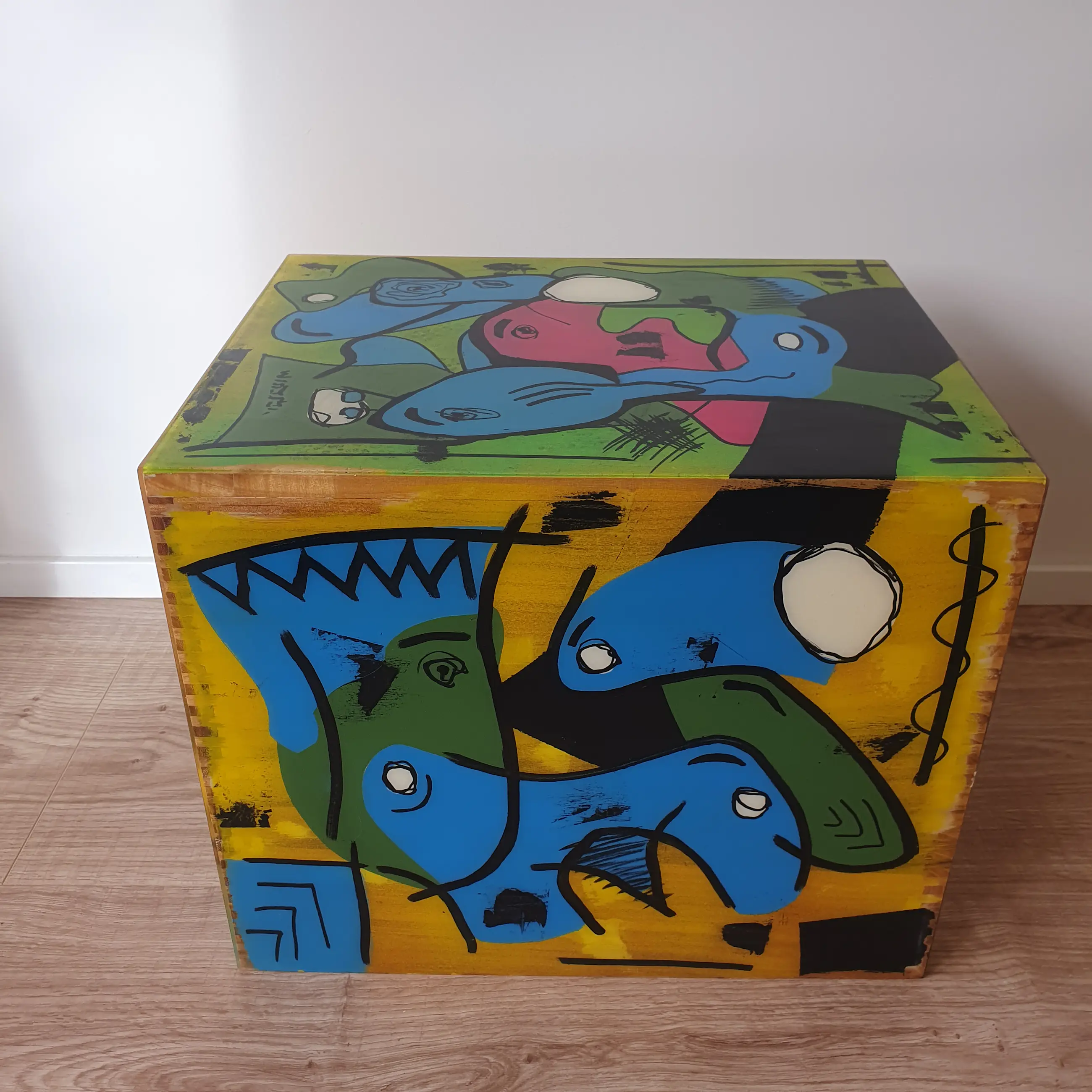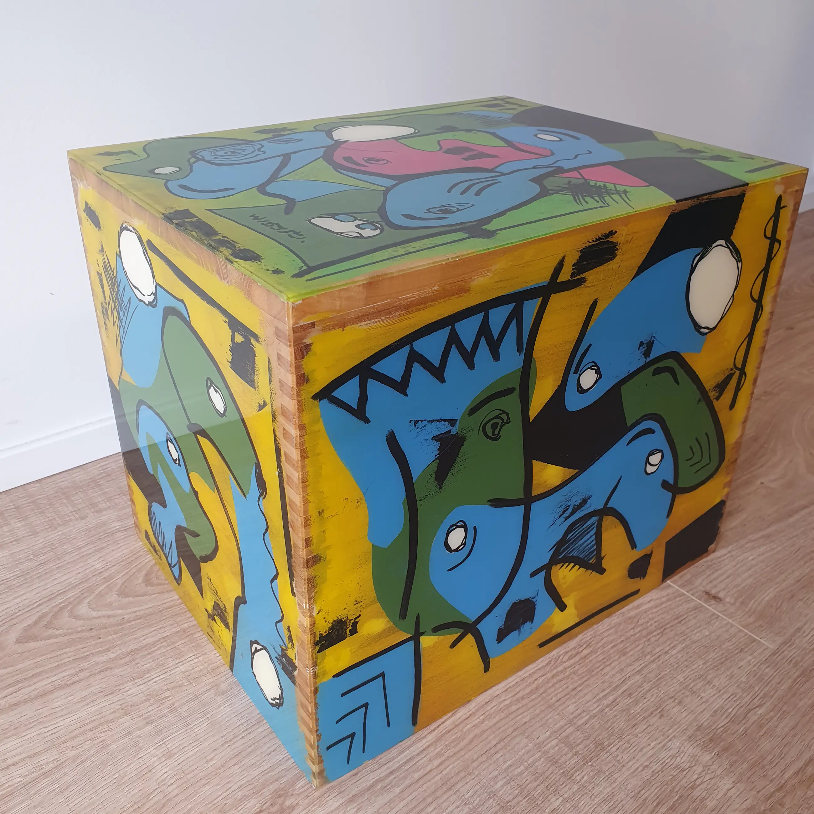 Het is een samensmelting van vijf urban schilderijen in één object. In de kenmerkende stijl van Christian van Hedel speelt het met contrasten in vorm, kleur en compositie. De krachtige gekleurde vlakken en tinten worden versterkt door speelse lijnen en expressieve figuren, wat het werk een dynamische uitstraling geeft.